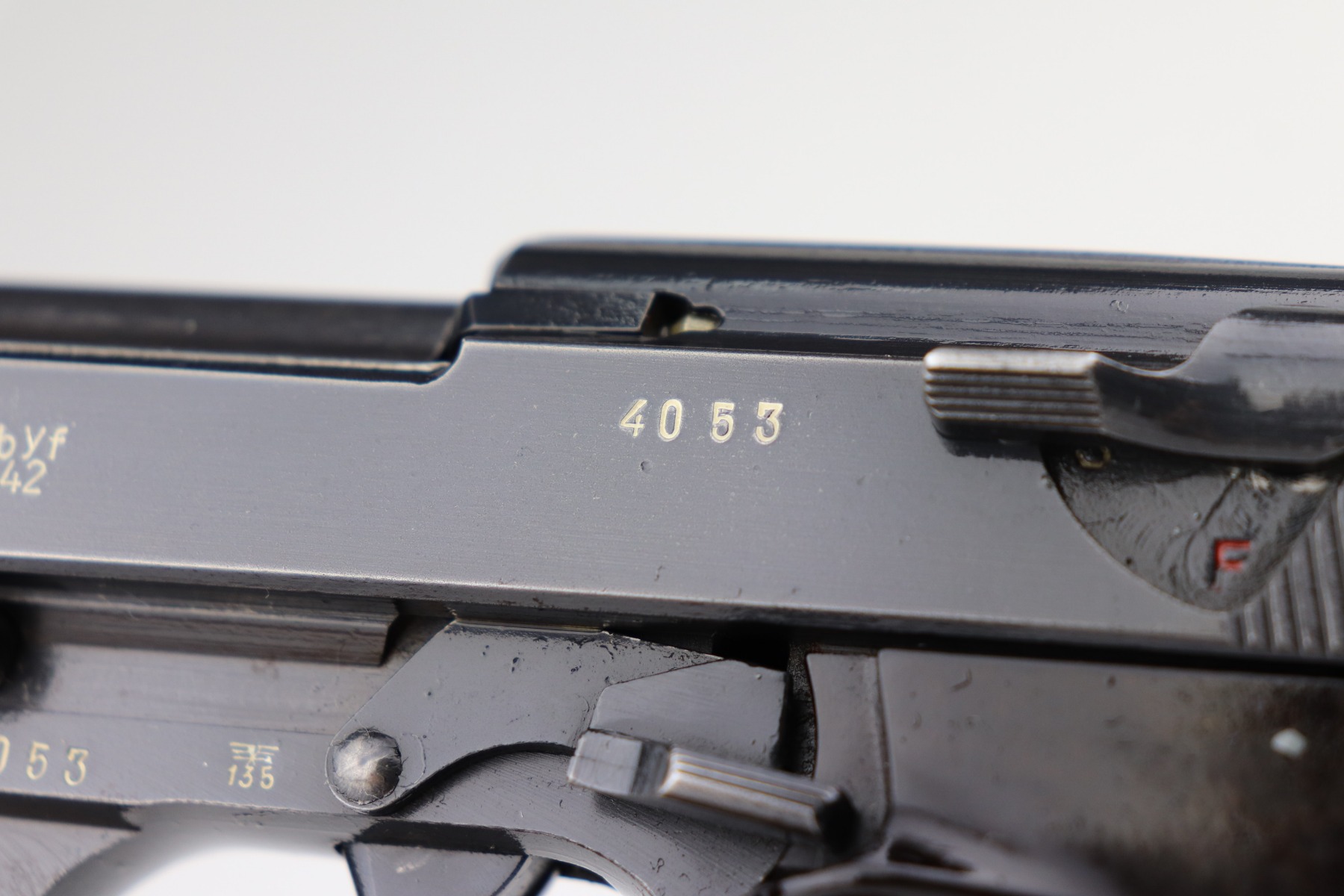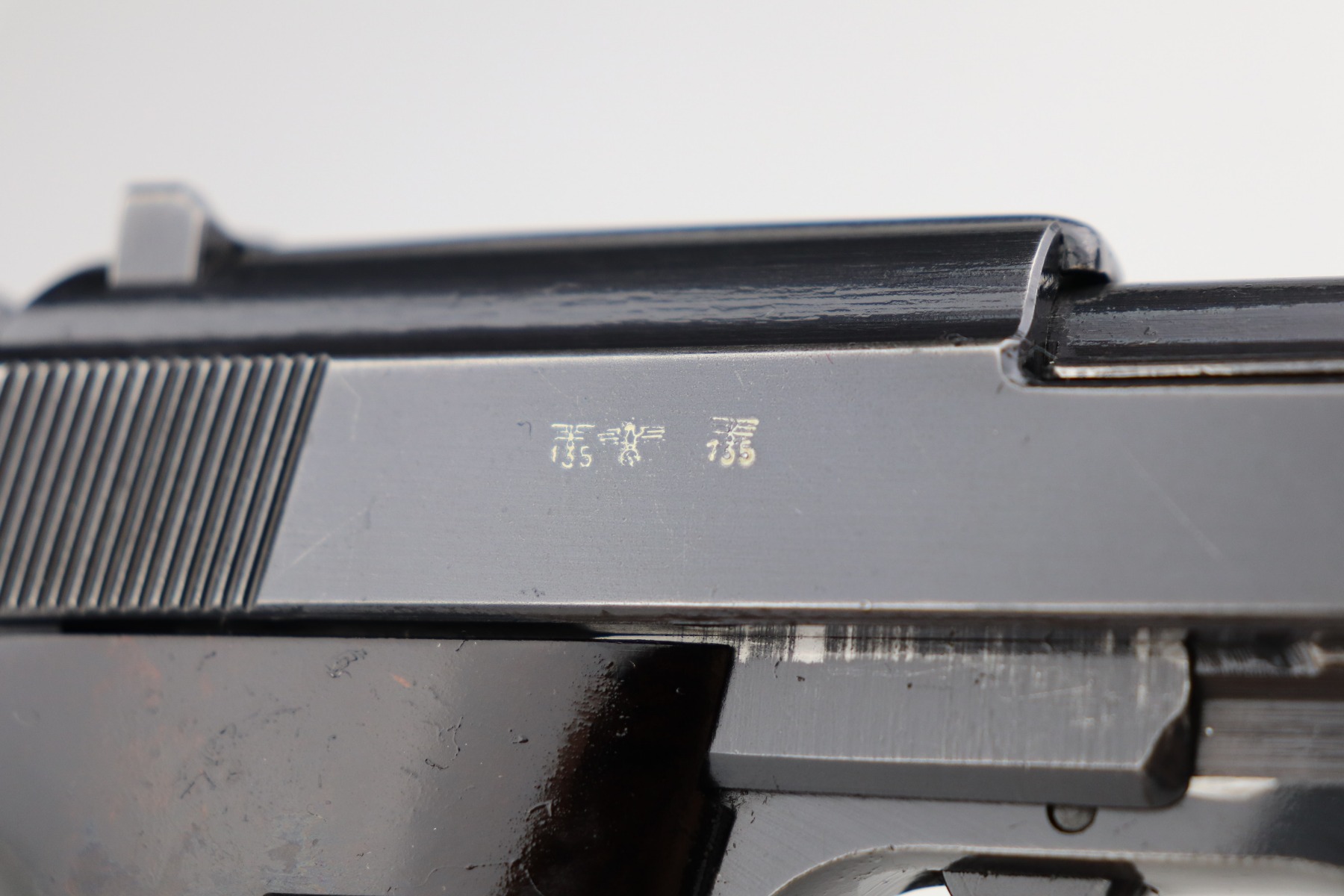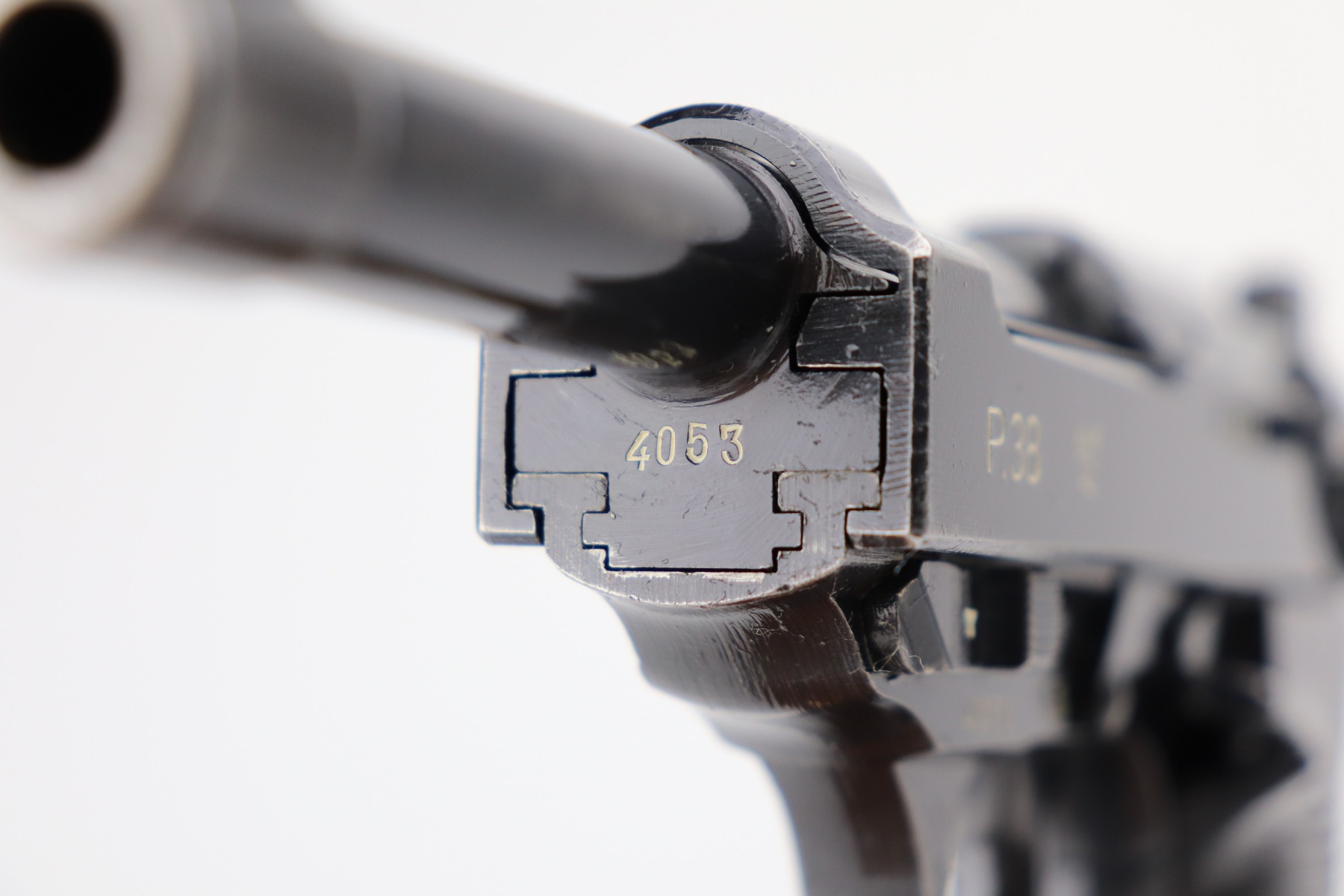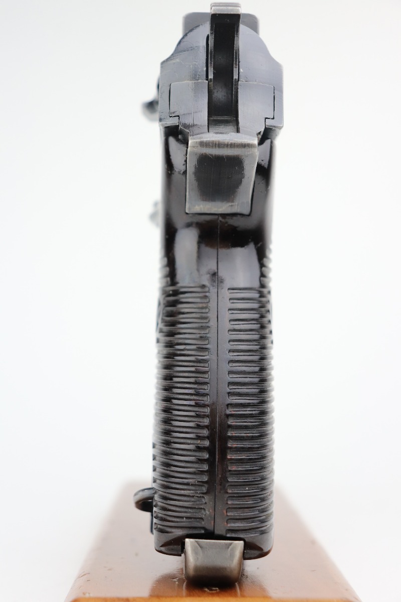 12/22/22 – This is an excellent example of a rare Mauser P.38 issued to the Nazi military in 1942. It is a first-year Mauser production, where only 19,000 of these wer made, making it only slightly more common than the zero series or Nazi-marked svw 45’s. This one is all matching and has the proper “Eagle 135” proofs. It has retained about 95% of its original finish. There is minor thinning on the front strap and minor wear around the muzzle and front edges of the slide. Comes with excellent grips and a proper wartime Mauser magazine. Very nice bore – strong rifling with freckling throughout. De-cocker is functional.