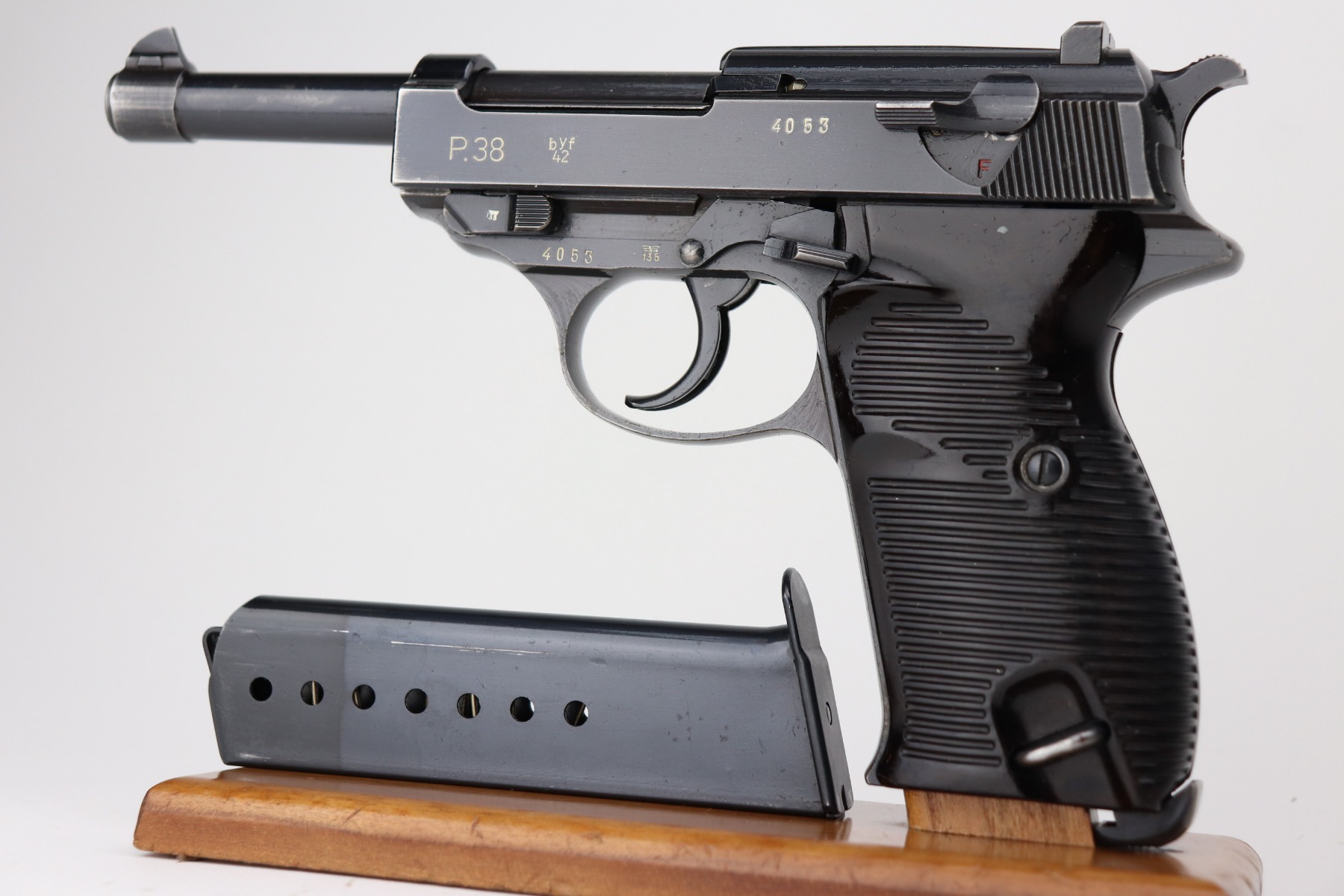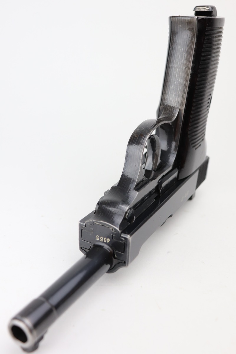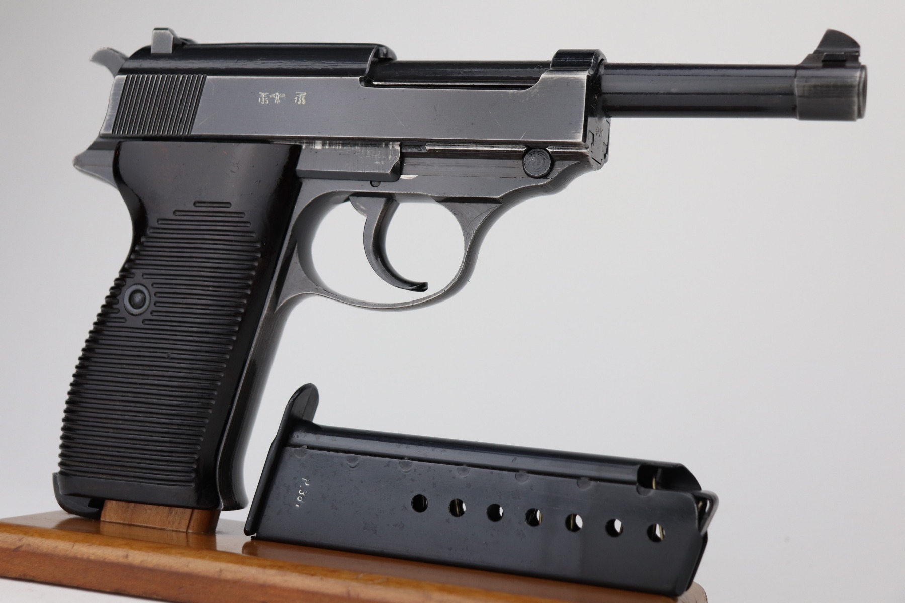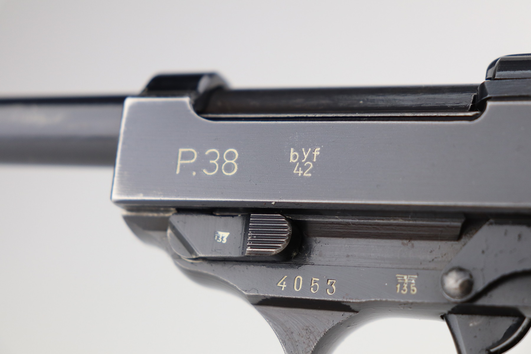 12/22/22 – This is an excellent example of a rare Mauser P.38 issued to the Nazi military in 1942. It is a first-year Mauser production, where only 19,000 of these wer made, making it only slightly more common than the zero series or Nazi-marked svw 45’s. This one is all matching and has the proper “Eagle 135” proofs. It has retained about 95% of its original finish. There is minor thinning on the front strap and minor wear around the muzzle and front edges of the slide. Comes with excellent grips and a proper wartime Mauser magazine. Very nice bore – strong rifling with freckling throughout. De-cocker is functional.