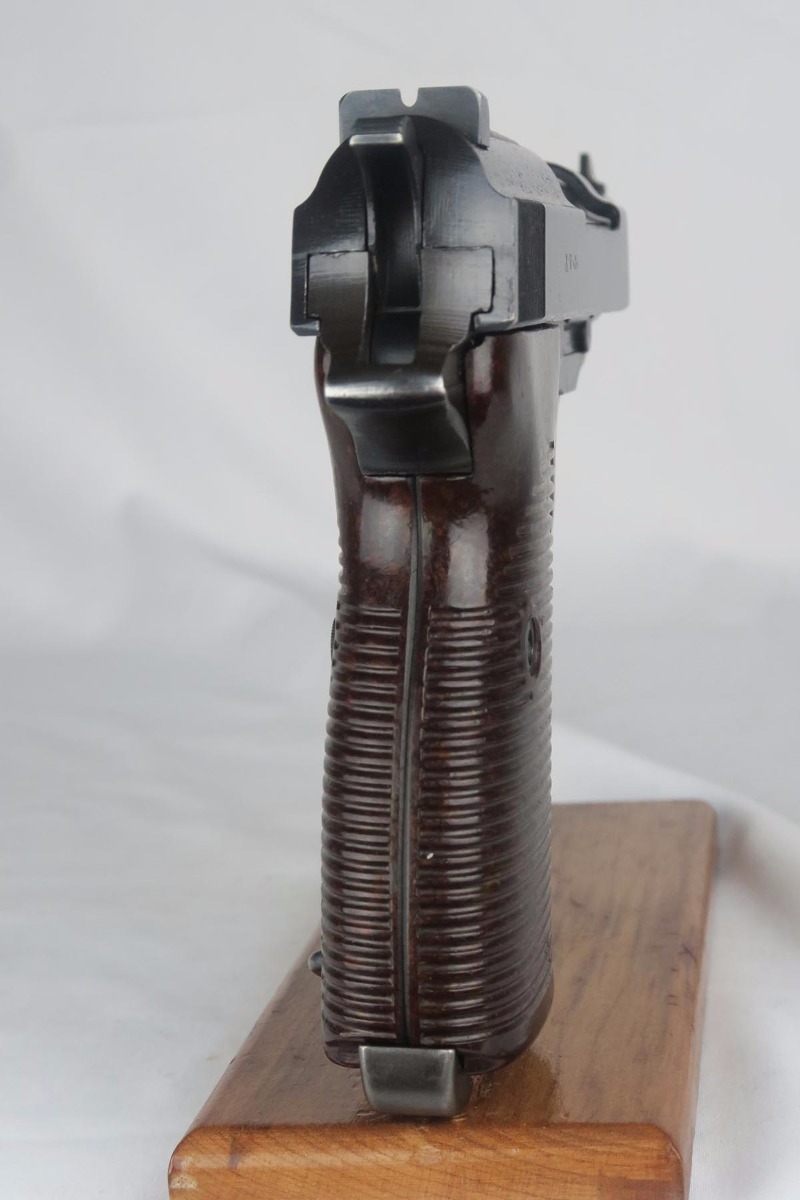 10/5/17 – This is an excellent Mauser byf 44 P.38 in all original condition.  Bluing rates at about 98% with minor edge and muzzle wear, and all numbered parts are matching.  This is a bit of a unique variation in that the acceptance proofs on the right side of the slide are mixed.  One is Eagle/135, the other is WaA/135.  Research dates this pistol to a manufacture date of March, 1944.  Beautiful grips and excellent bore.