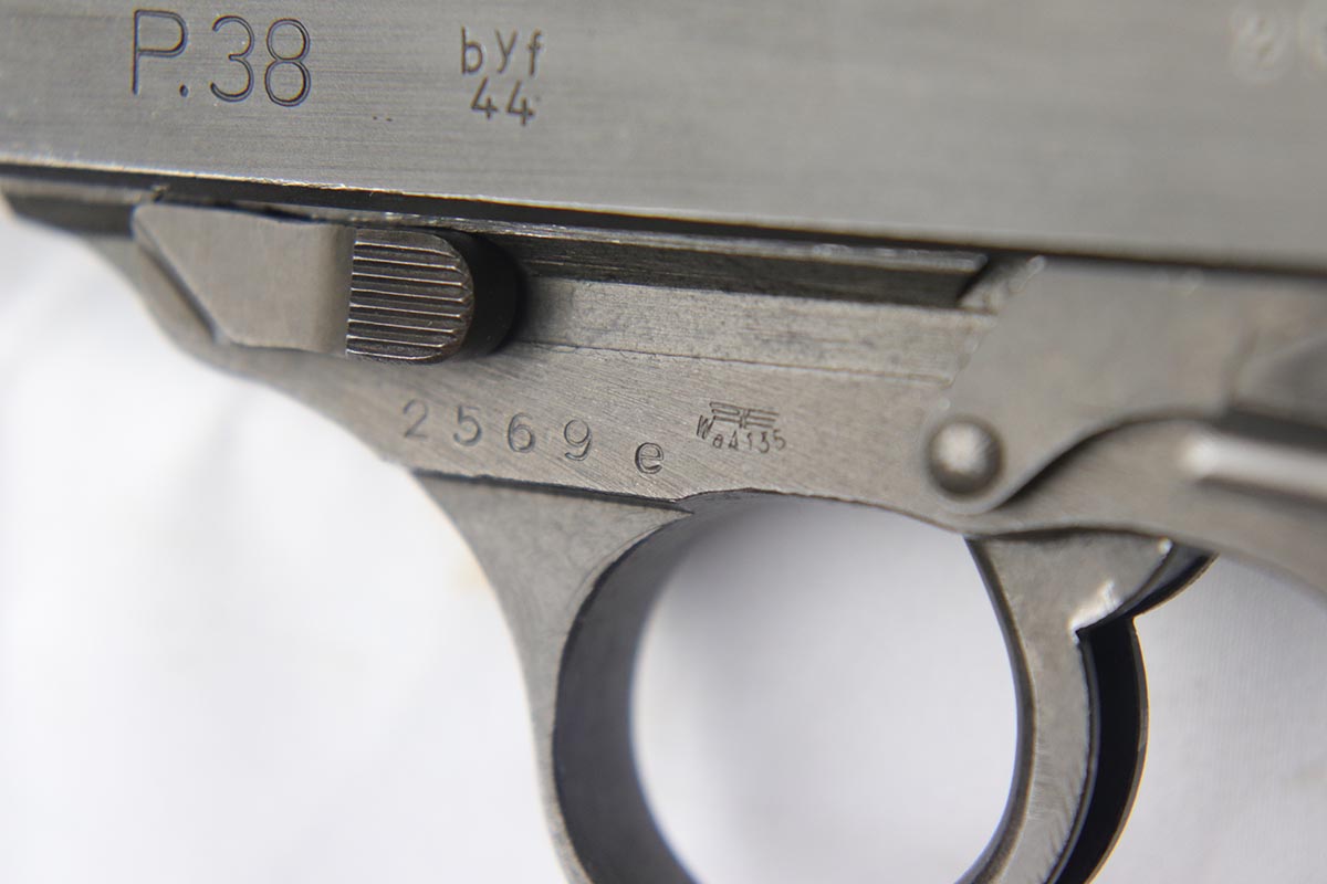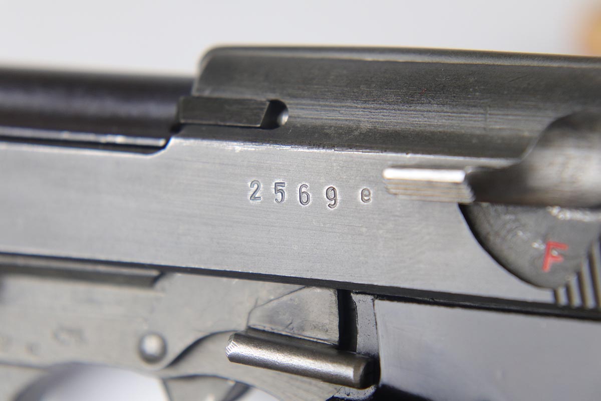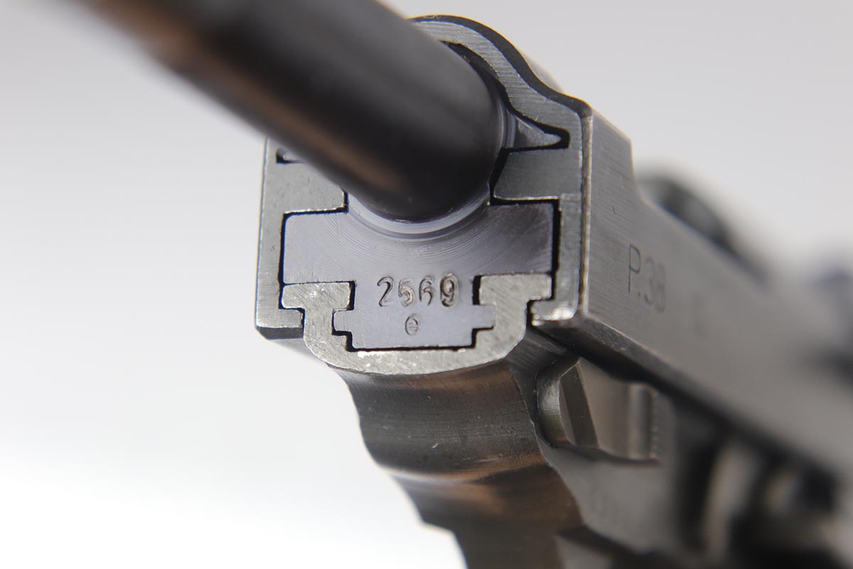 7/13/18 – This is an excellent dual-tone Mauser P.38 from 1944. The frame, slide and small parts are all phosphate finished, while the barrel is blued. The finish rates at 96+% with minor muzzle wear and finish loss on the front edges of the slide. The front strap shows minor thinning, as well. Excellent grips. Bore is shiny with minor frost.