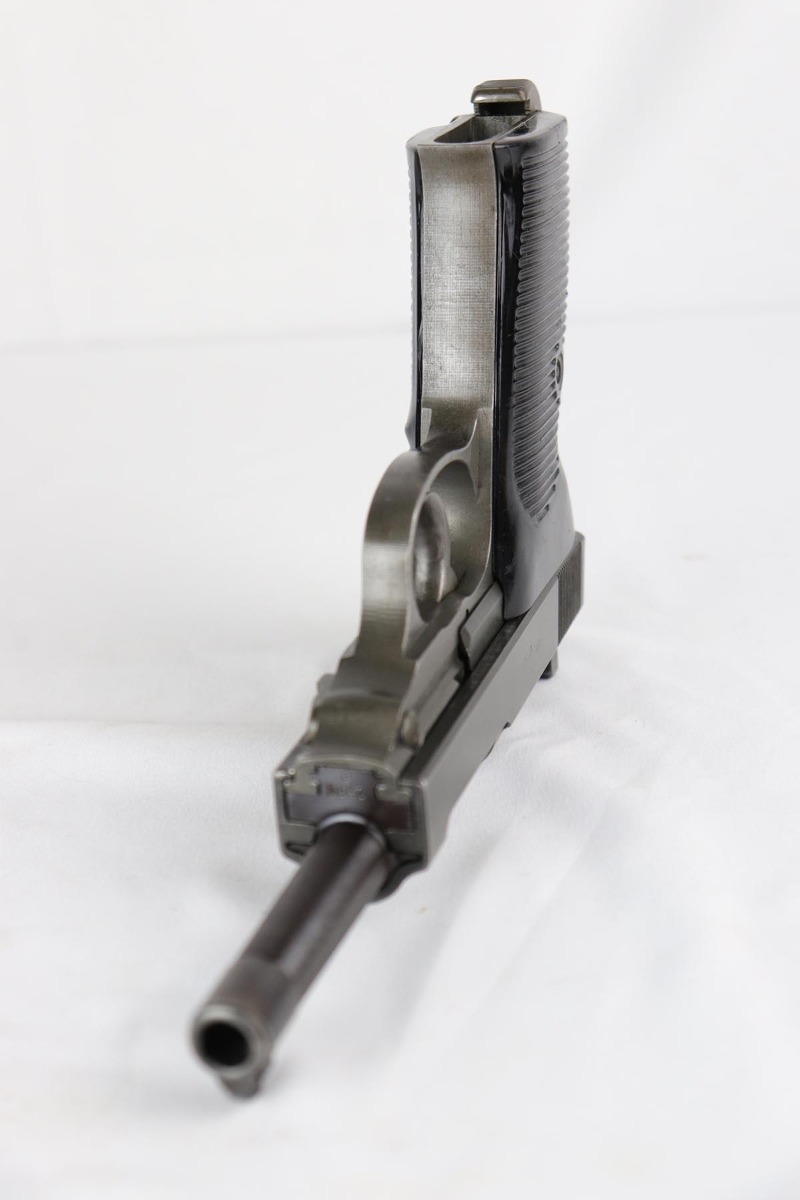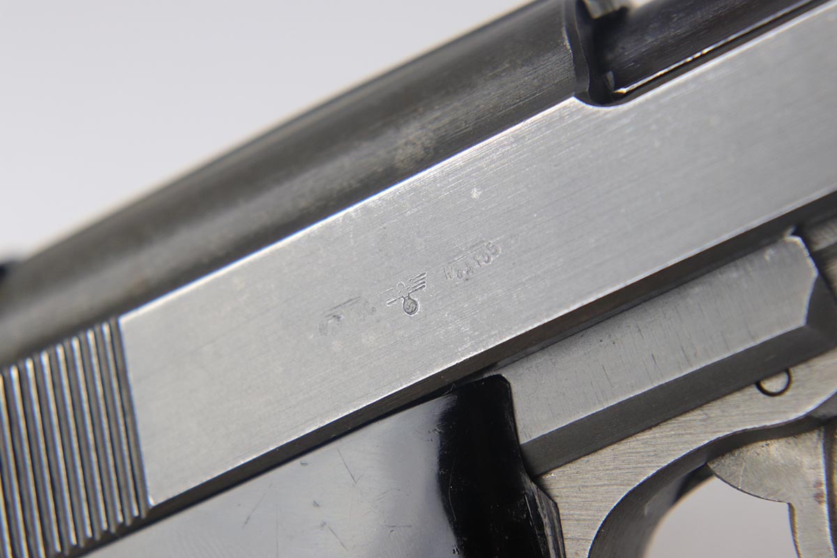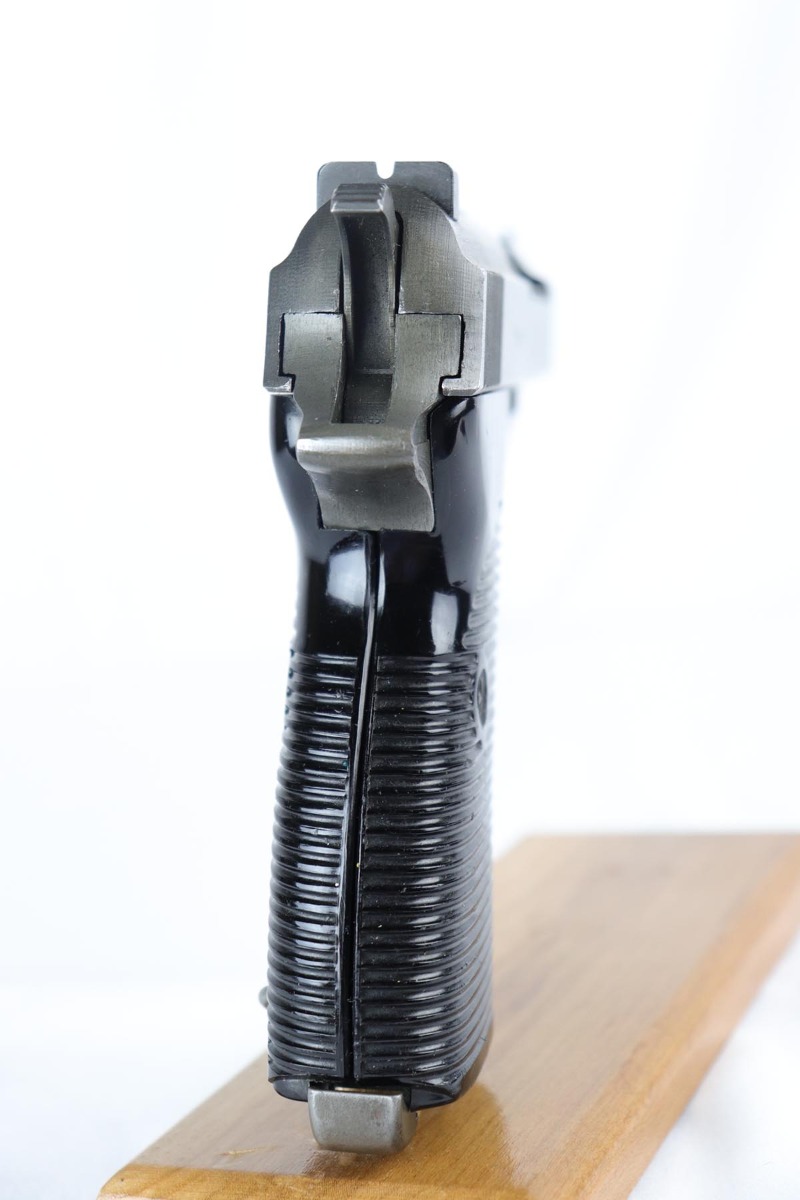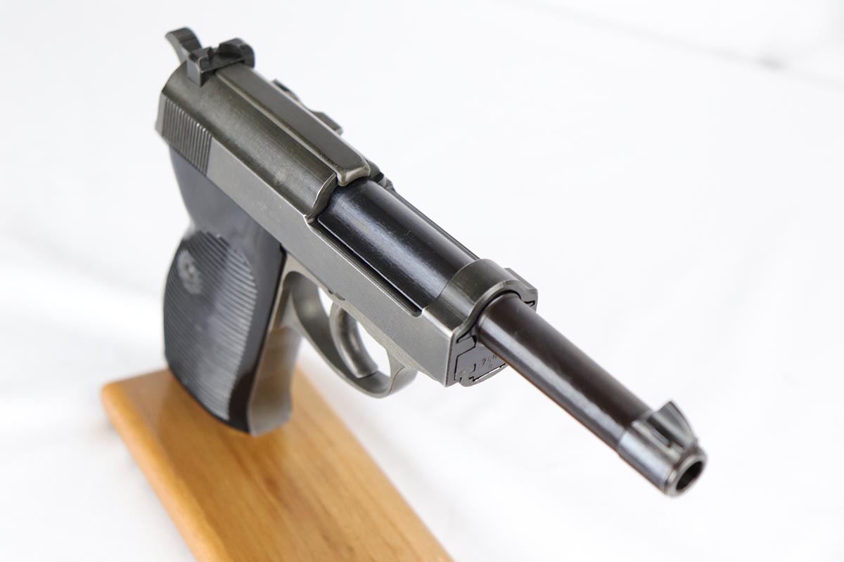 7/13/18 – This is an excellent dual-tone Mauser P.38 from 1944. The frame, slide and small parts are all phosphate finished, while the barrel is blued. The finish rates at 96+% with minor muzzle wear and finish loss on the front edges of the slide. The front strap shows minor thinning, as well. Excellent grips. Bore is shiny with minor frost.