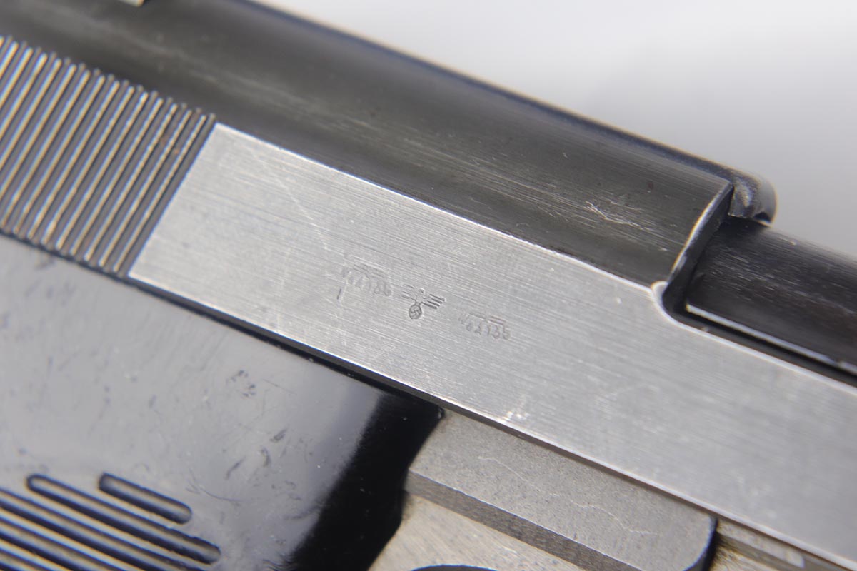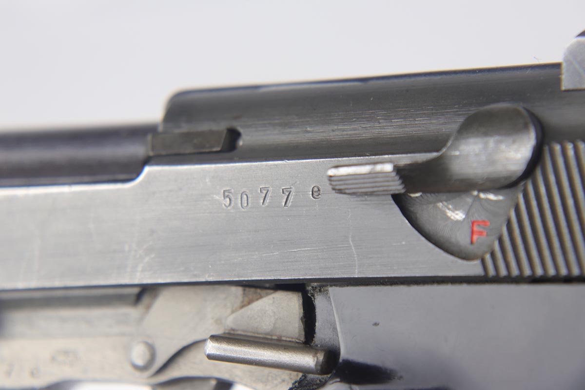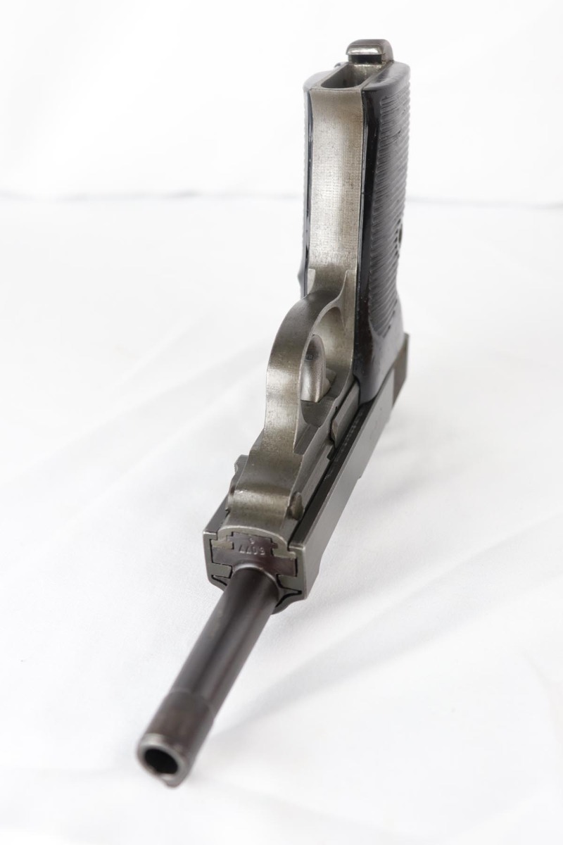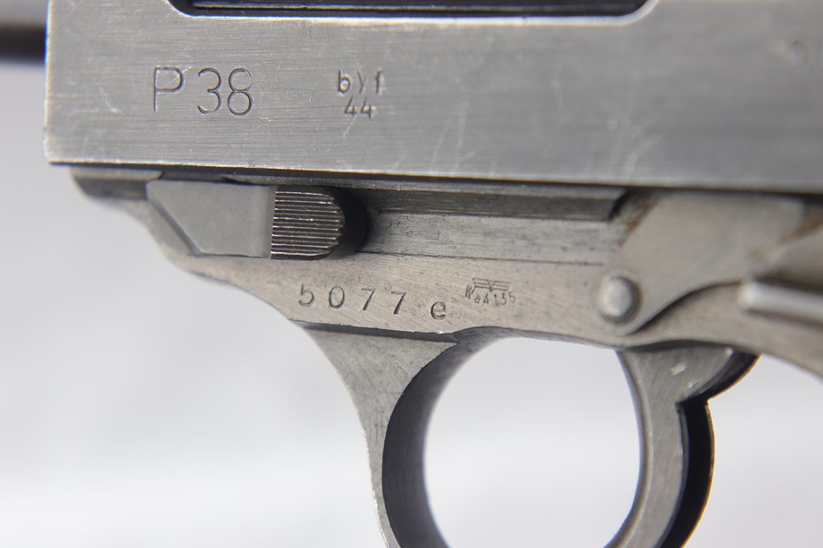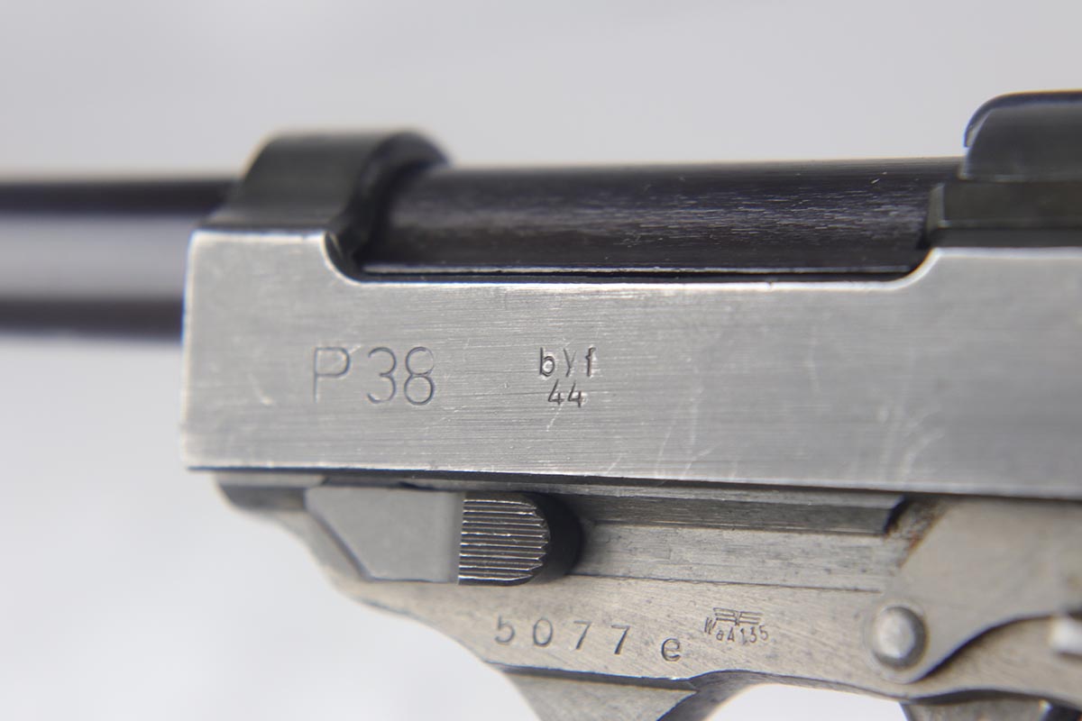 8/28/19 – This is an excellent, all-matching Mauser P.38 with dual-tone finish from 1944. The frame and slide have a phosphate finish while the barrel is blued. That finish rates at about 98% with only minor scuff marks and edge wear on the slide. All matching numbers and an excellent bore. Grips are original but have a few dings and scratches.