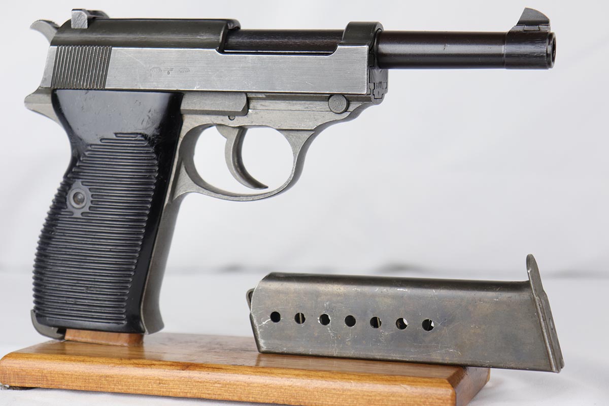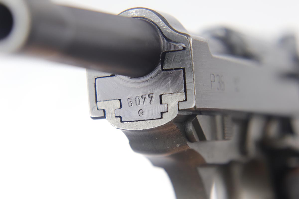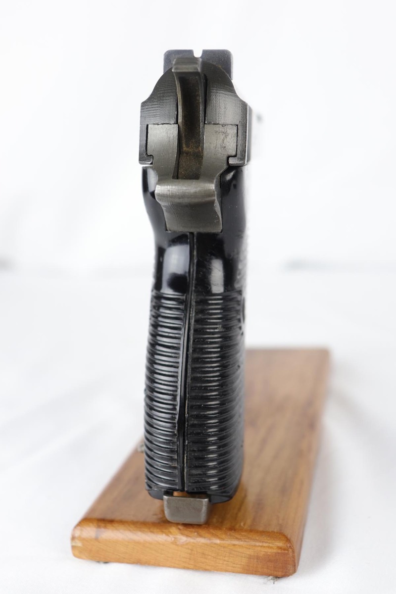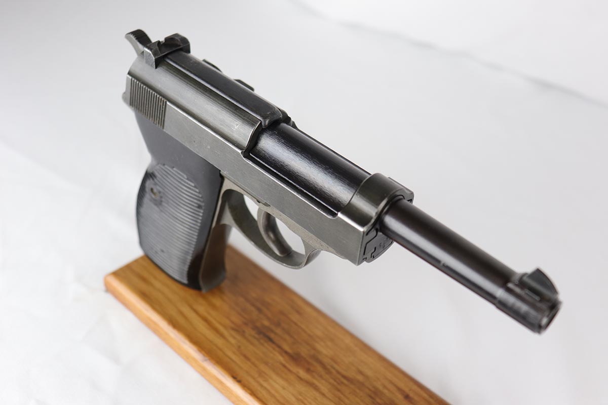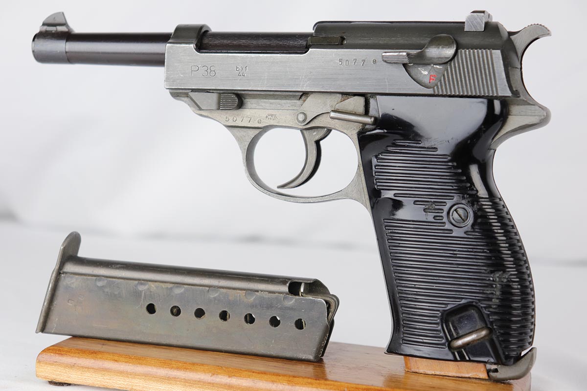 8/28/19 – This is an excellent, all-matching Mauser P.38 with dual-tone finish from 1944. The frame and slide have a phosphate finish while the barrel is blued. That finish rates at about 98% with only minor scuff marks and edge wear on the slide. All matching numbers and an excellent bore. Grips are original but have a few dings and scratches.
