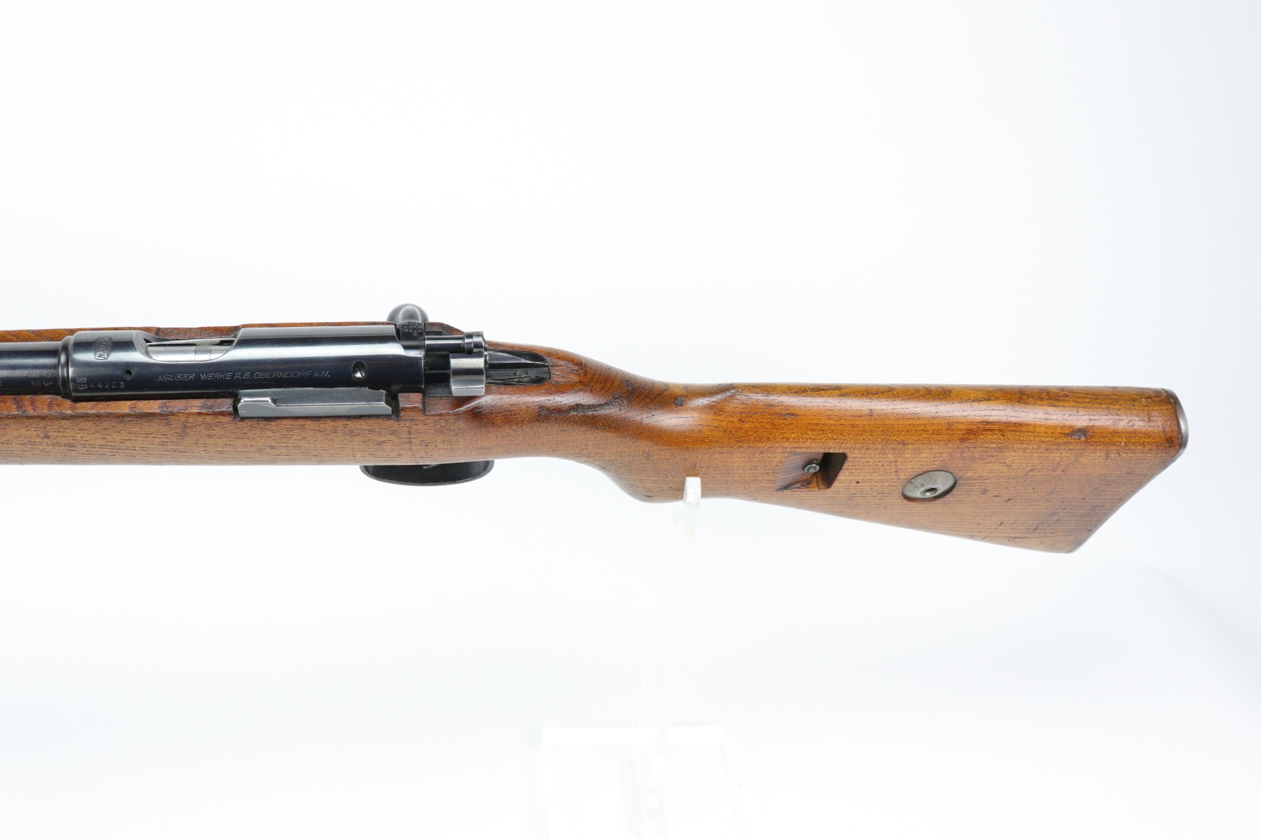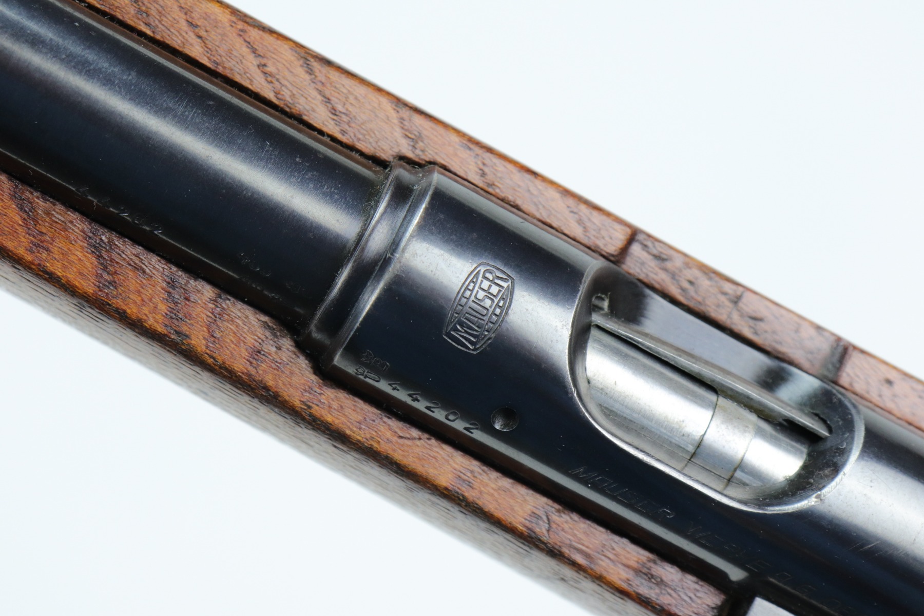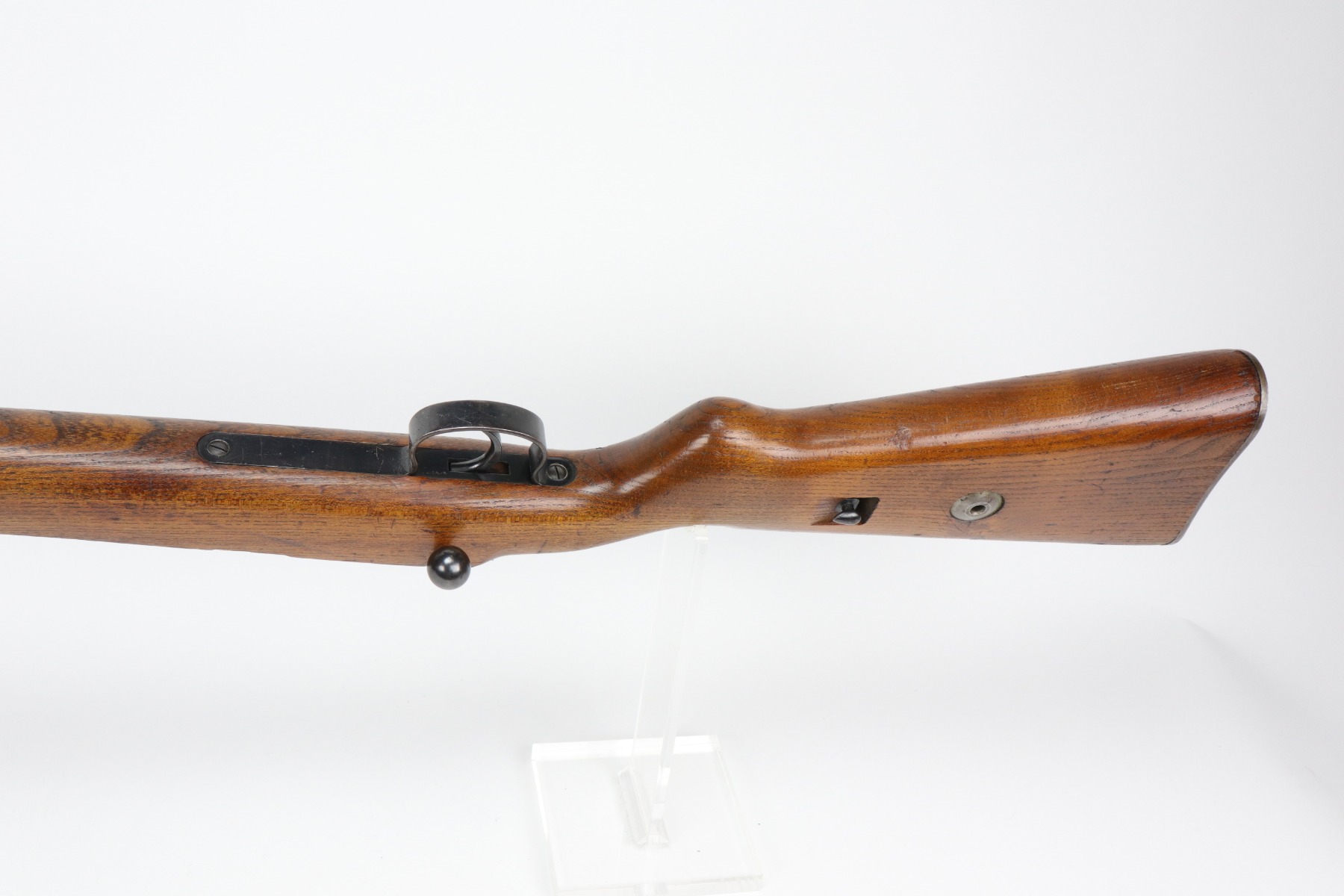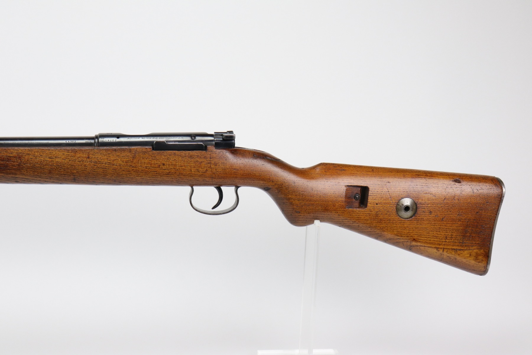 1/6/21 – This is an excellent example of a Pre-WW2 Mauser Training Rifle, chambered in .22LR. The gun is all matching and has early “BUG” proofs. It is in excellent condition, retaining virtually all of its original bluing – just some minor handling marks and light scratches here and there. The stock is excellent with minor handling marks and bruises. The bore is minty.