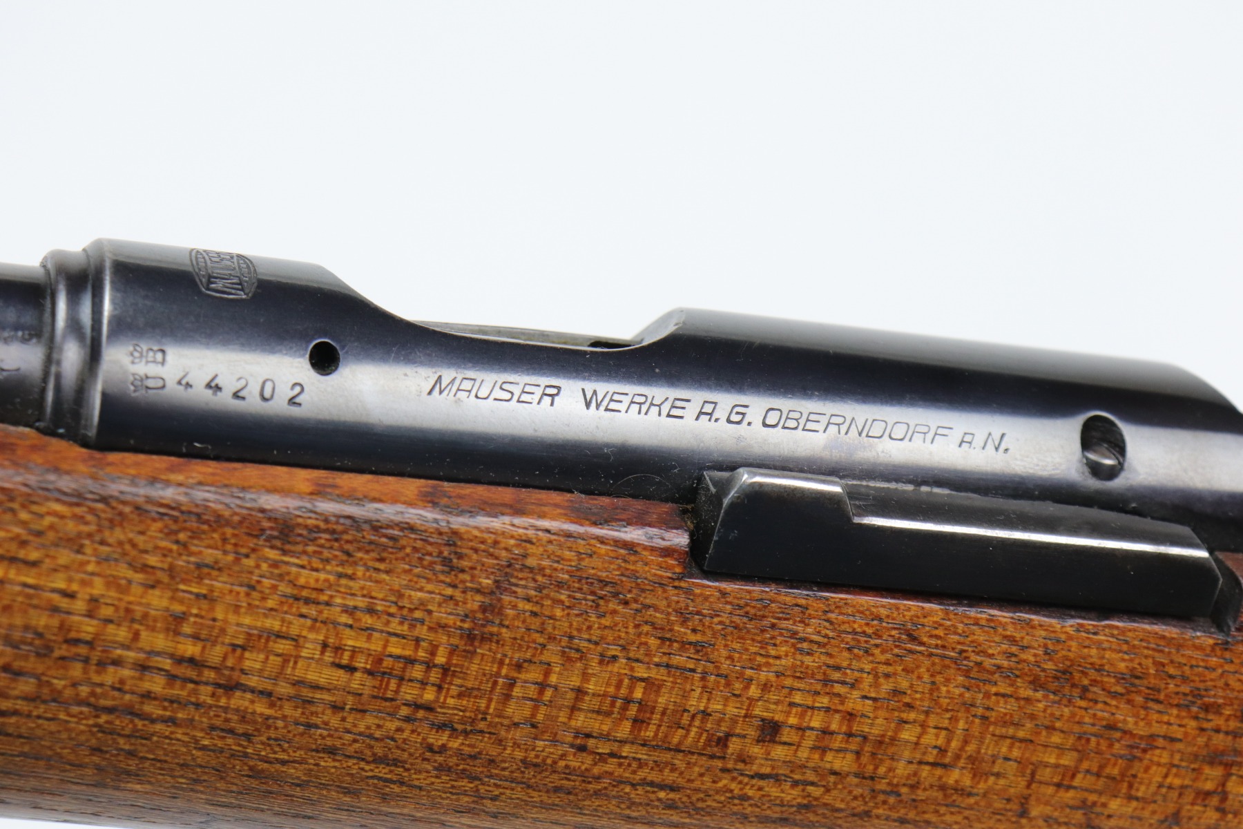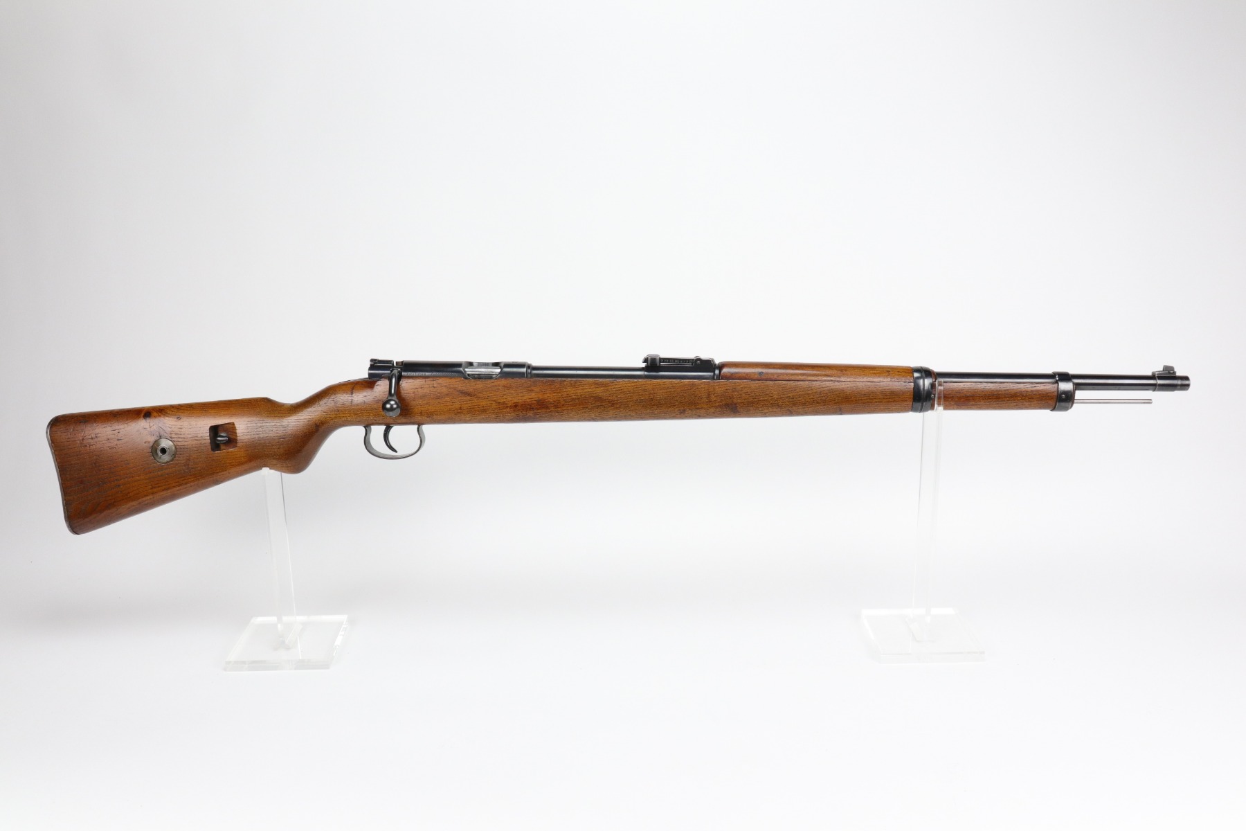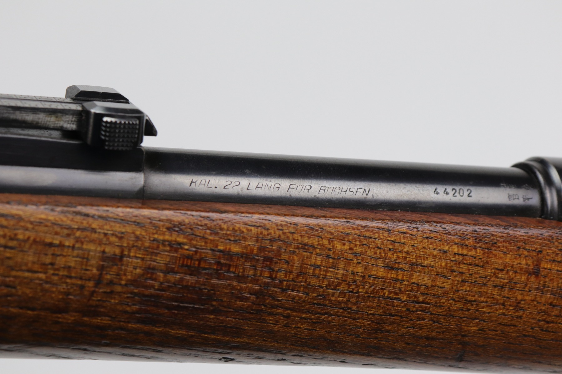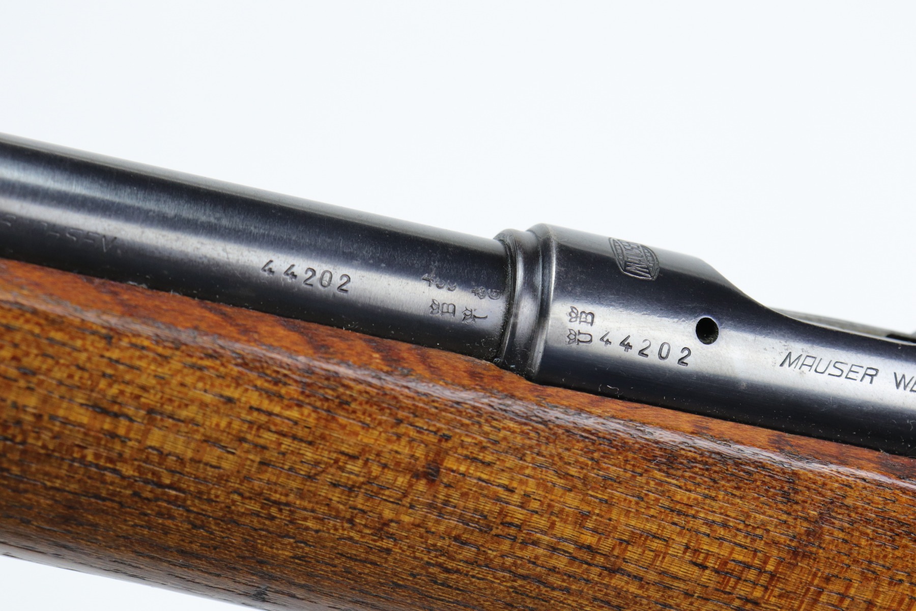 1/6/21 – This is an excellent example of a Pre-WW2 Mauser Training Rifle, chambered in .22LR. The gun is all matching and has early “BUG” proofs. It is in excellent condition, retaining virtually all of its original bluing – just some minor handling marks and light scratches here and there. The stock is excellent with minor handling marks and bruises. The bore is minty.