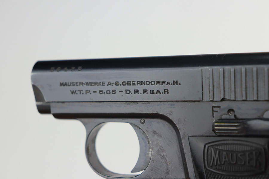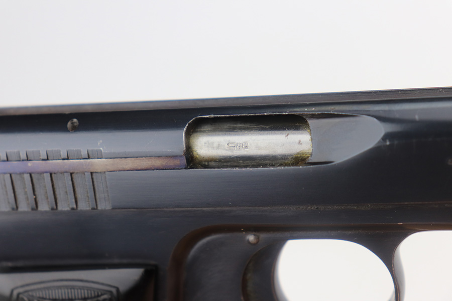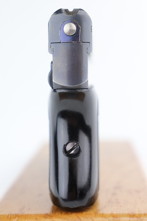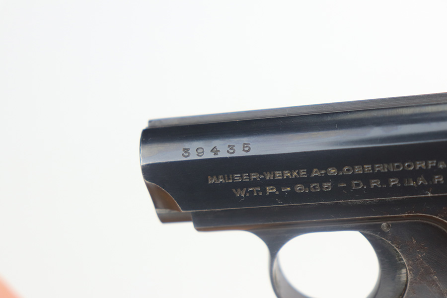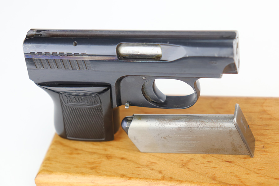6/2/21 – This is an excellent example of a Pre-WW2 Mauser Model WTP I. It is matching and has the proper “Crown U” proofs. It has retained about 97% of its original bluing. While there isn’t much actual finish loss, there is an area of spotty discoloration on the left side of the frame and trigger guard. Some light handling marks on the slide. Comes with an excellent grip – no chips or cracks. One proper magazine. Excellent bore – shiny with strong rifling.