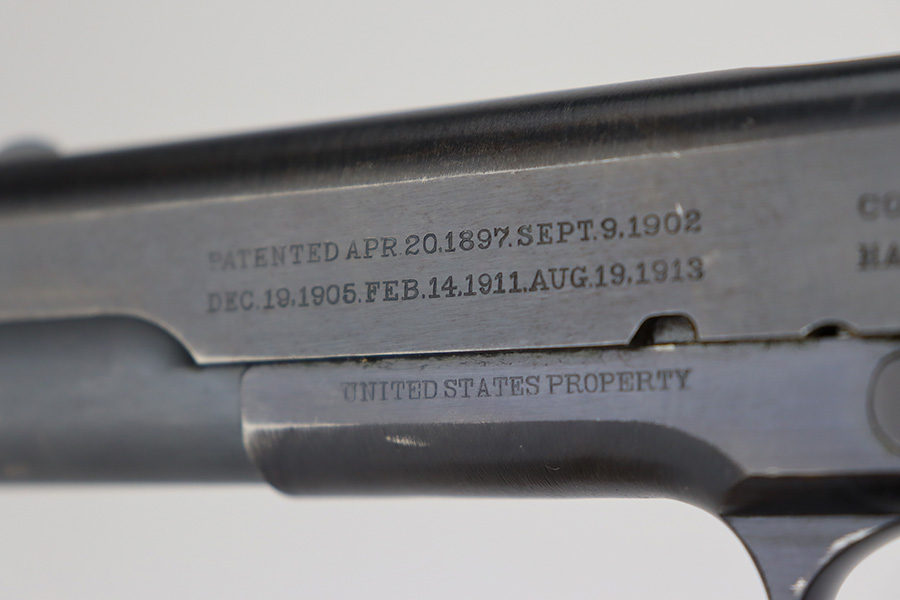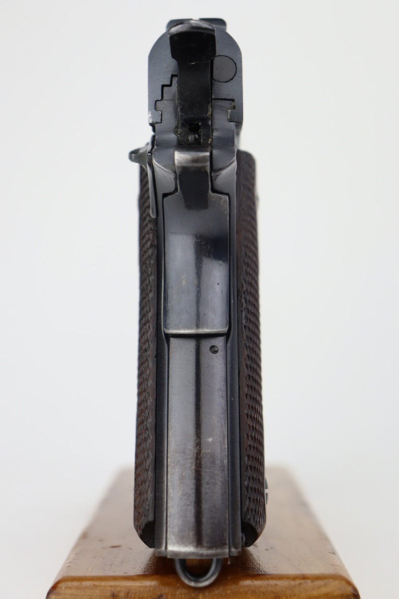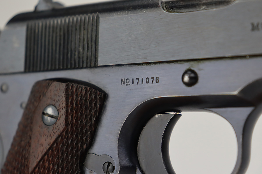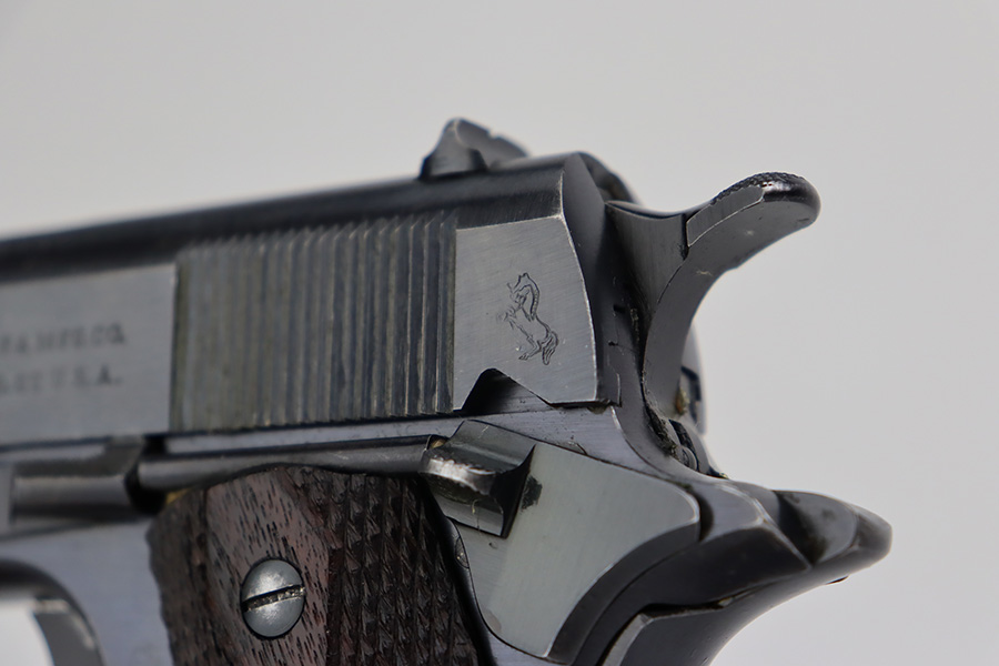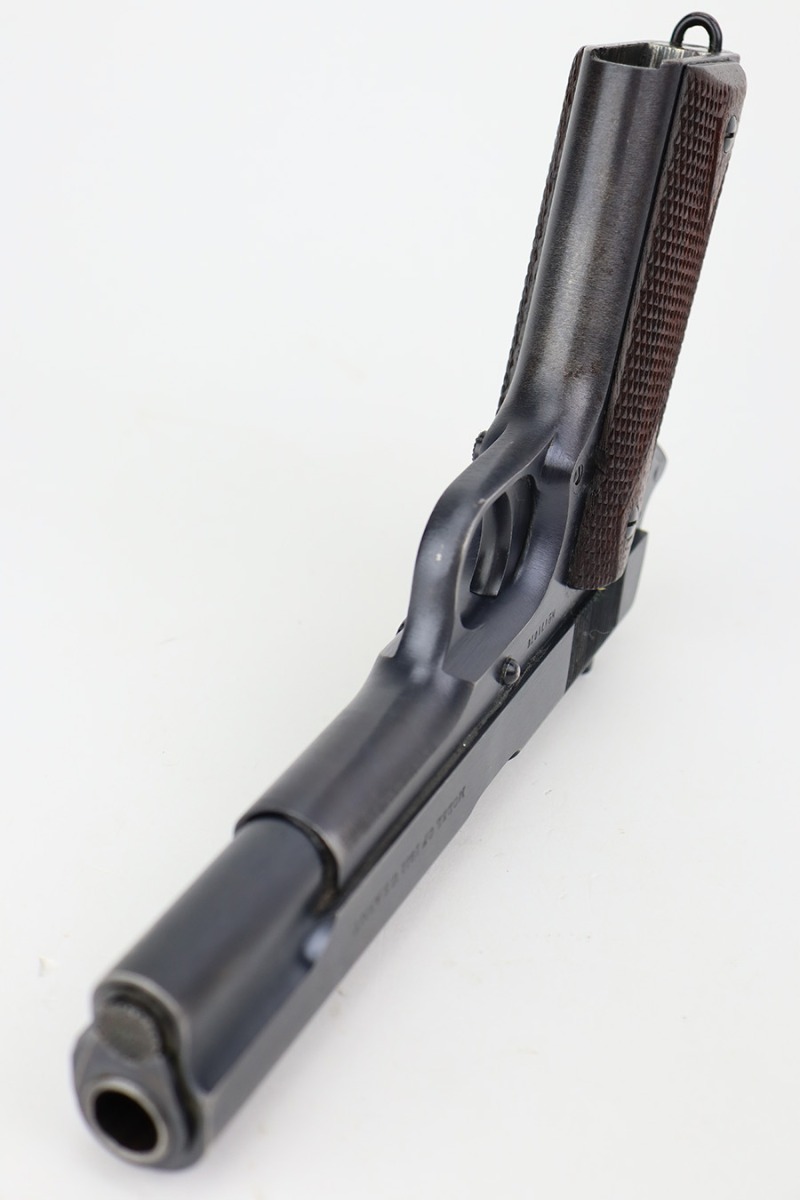 8/18/23 – This is an excellent, original Colt 1911 from 1917. It’s a little difficult to rate as there’s minor thinning sprinkled in, but the bluing rates at about 92-94% with the most pronounced finish loss on the mainspring housing and front strap. Correct Colt barrel with disconnected ‘P H’ markings, and a strong, shiny bore. Nice grips with no cracks, just minor handling wear. Proper two-tone mag.