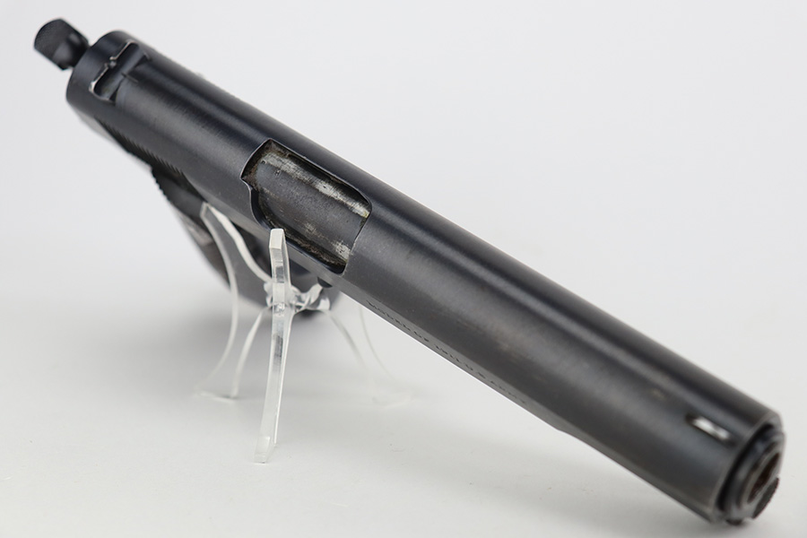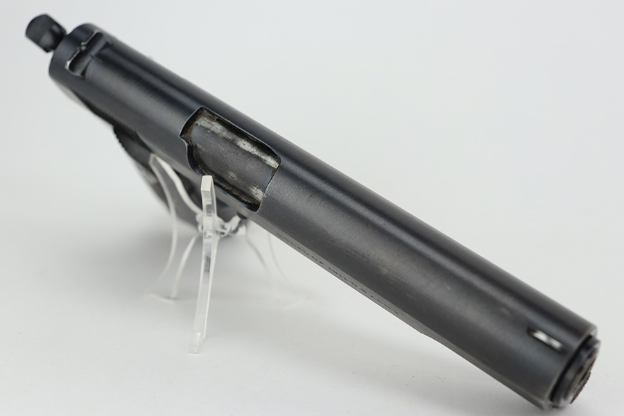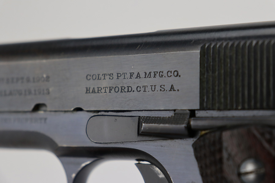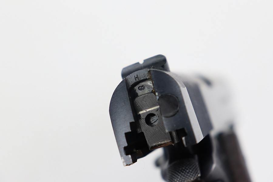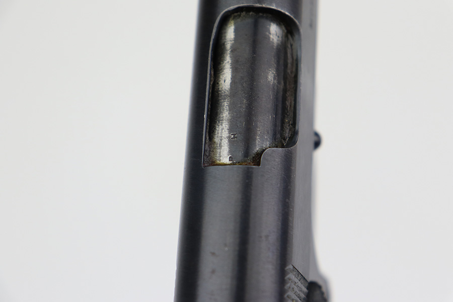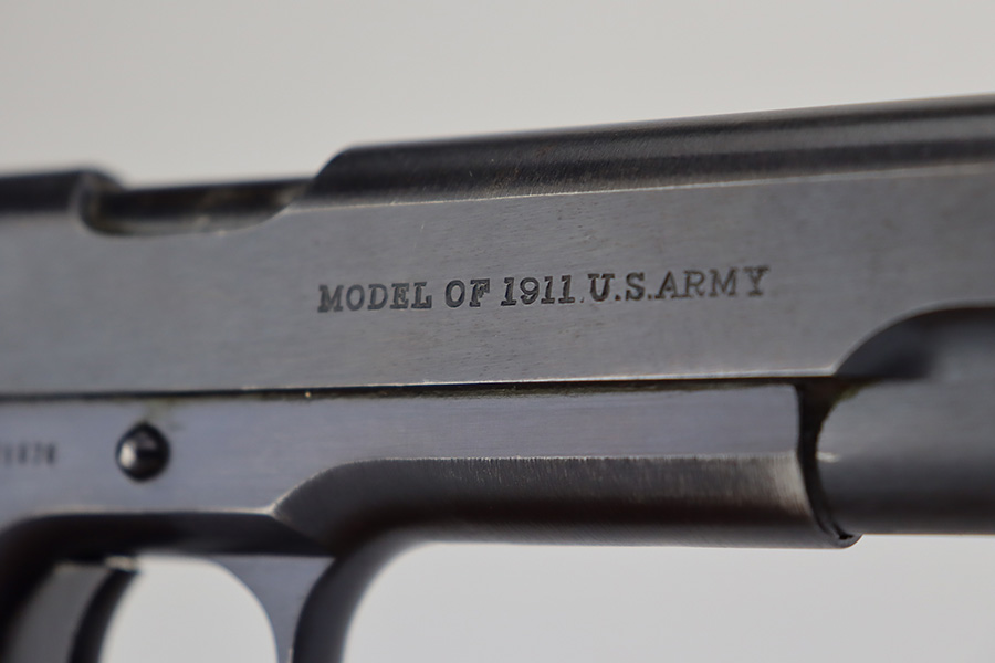 8/18/23 – This is an excellent, original Colt 1911 from 1917. It’s a little difficult to rate as there’s minor thinning sprinkled in, but the bluing rates at about 92-94% with the most pronounced finish loss on the mainspring housing and front strap. Correct Colt barrel with disconnected ‘P H’ markings, and a strong, shiny bore. Nice grips with no cracks, just minor handling wear. Proper two-tone mag.