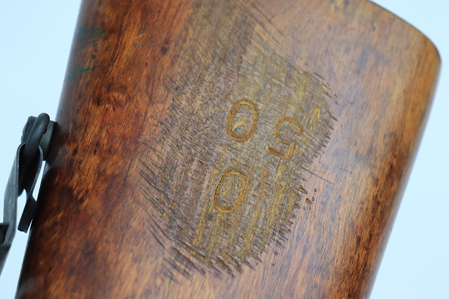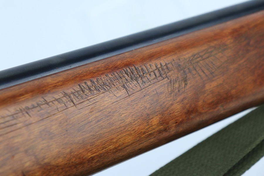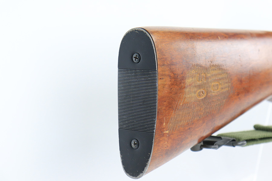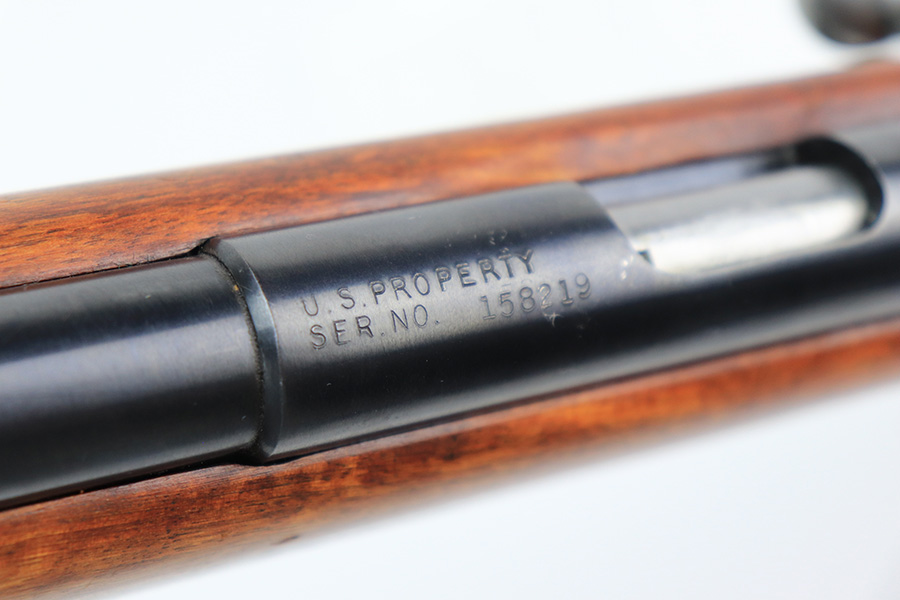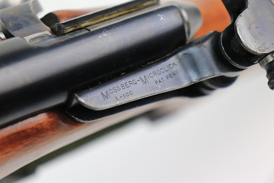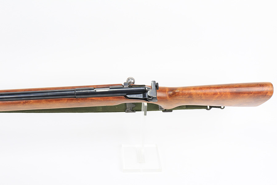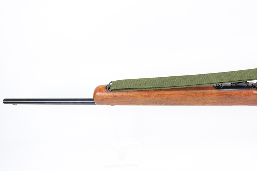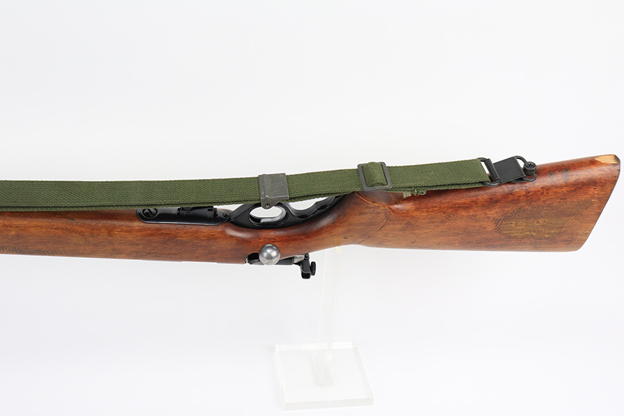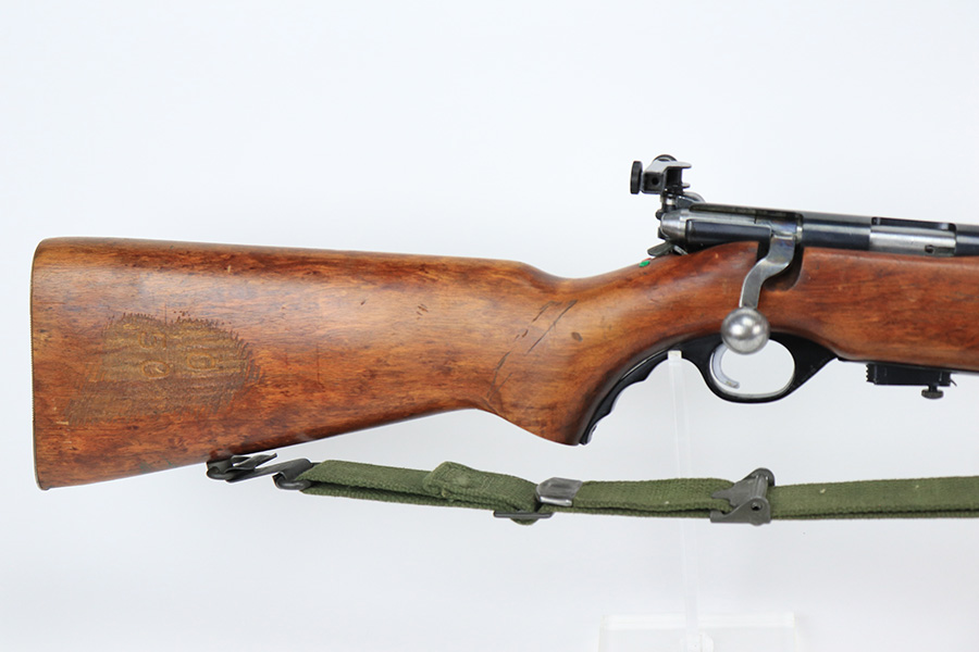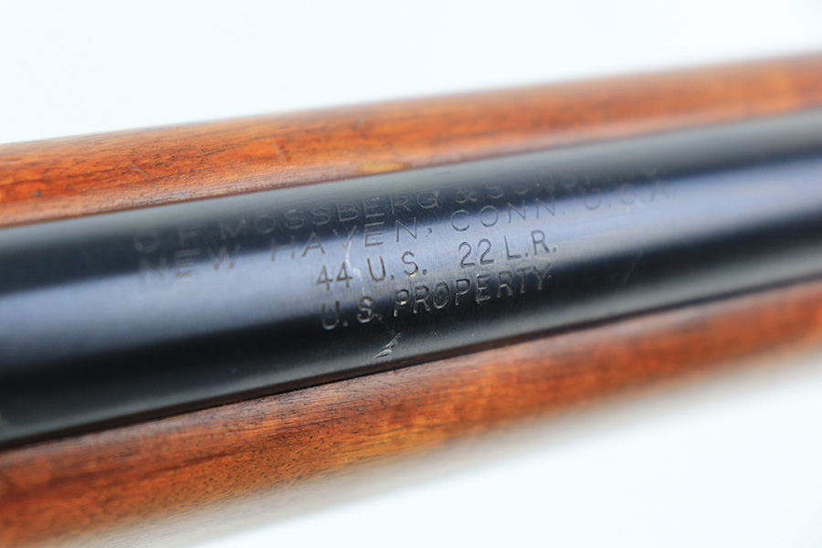 5/11/22 – This is an excellent example of a Mossberg 44 training rifle issued to the US military during WW2. Chambered in .22 LR. Comes with a Mossberg-Microclick S-100 adjustable rear sight. Overall, the gun is in excellent condition with very little finish loss. There are just some very light handling marks along the barrel and some thinning in the case-hardening on the bolt. The stock is nice, but there is a small chip on the underside of the butt stock against the butt plate. There is an area of heavy scratching on the right side of the butt stock, where there is also a rack number. Comes with period-correct green canvas sling and one magazine. Mint bore.