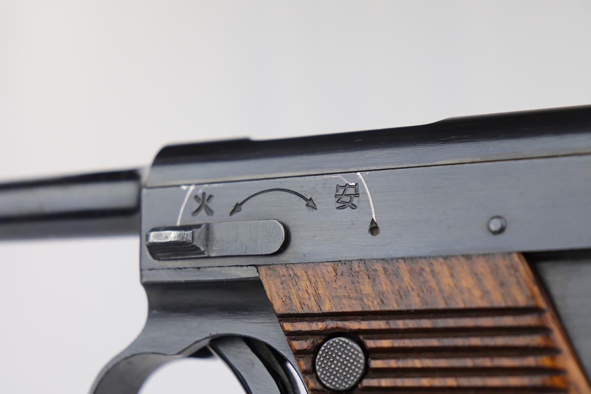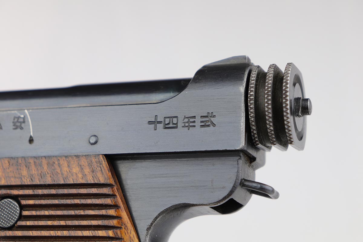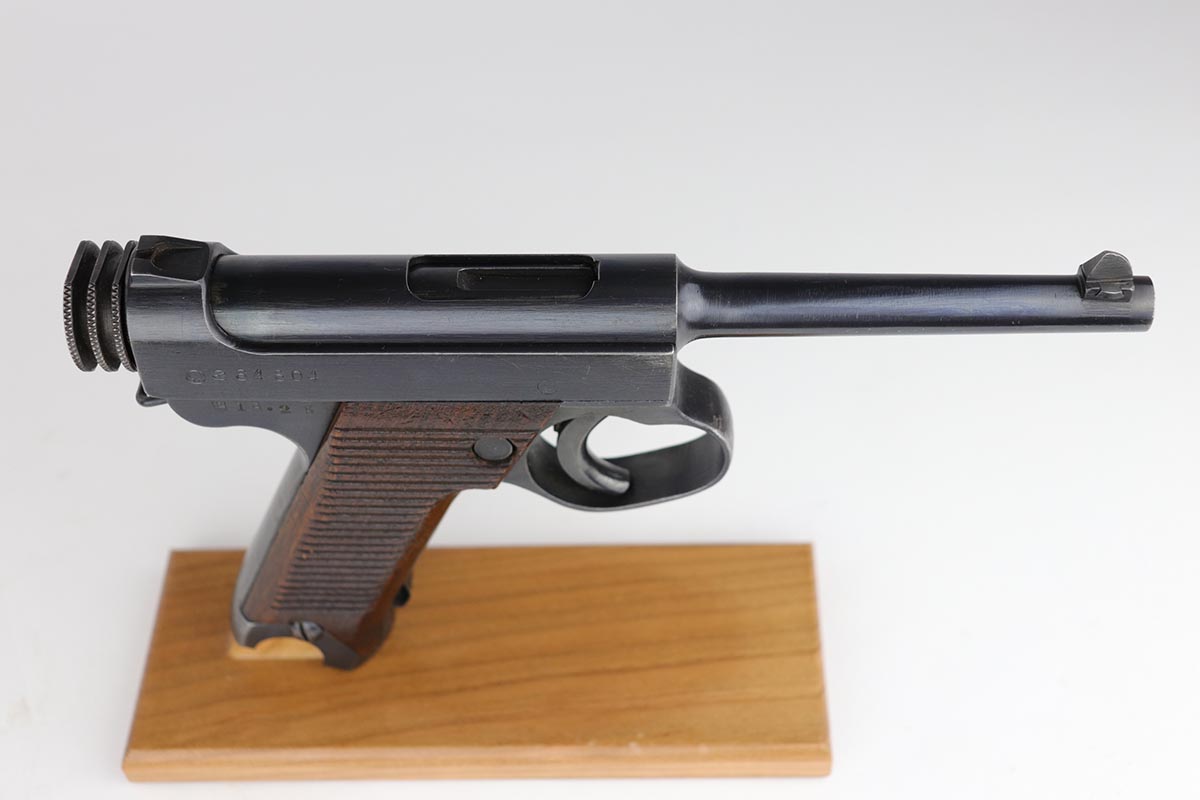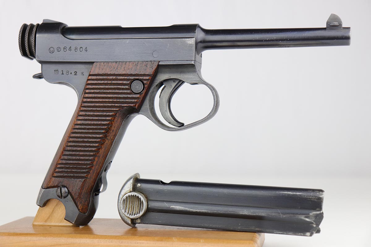 6/25/19 – Made in February of 1943, this is an excellent Nambu Type 14 with 95-97% original blue. There’s minor thinning of the straps and a hint of wear on the barrel, but most of the finish loss is on the trigger guard. There are also a few dings in the metal there. It’s a large trigger guard variation, which was adapted to fit a gloved hand in cold weather. Excellent grips and period original but mismatched magazine. The grips are not numbered, but the numbers may have been lightly scrubbed. Mint bore.