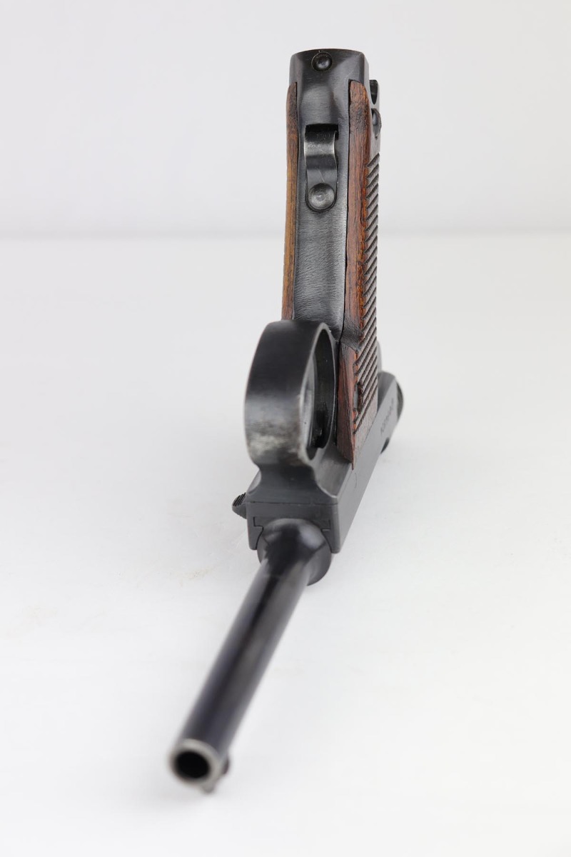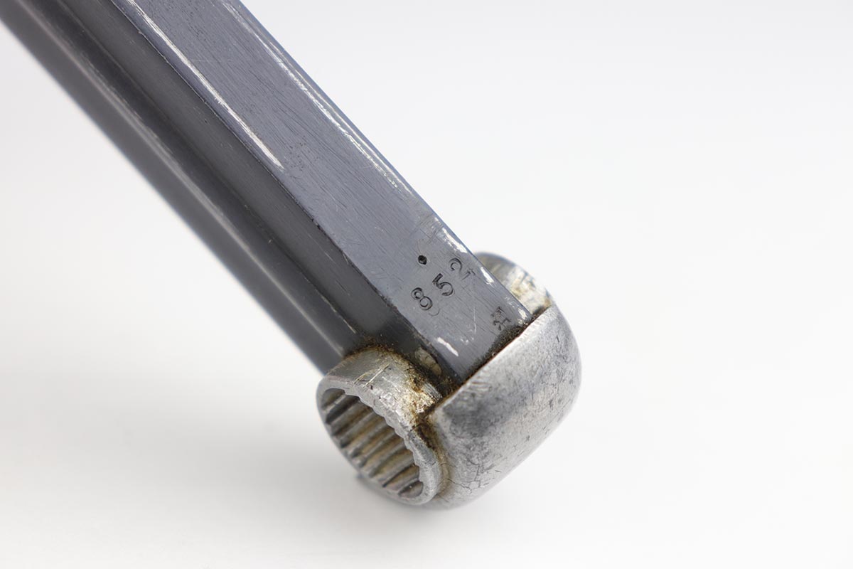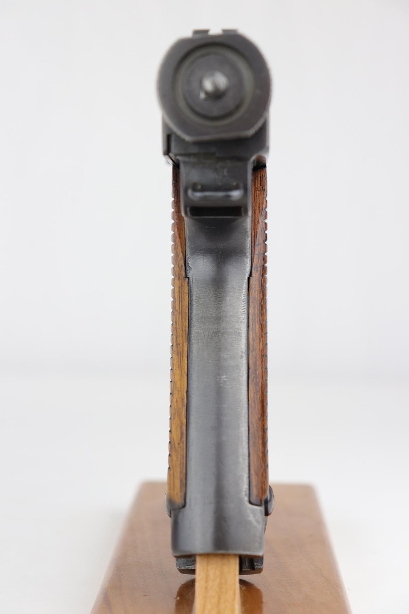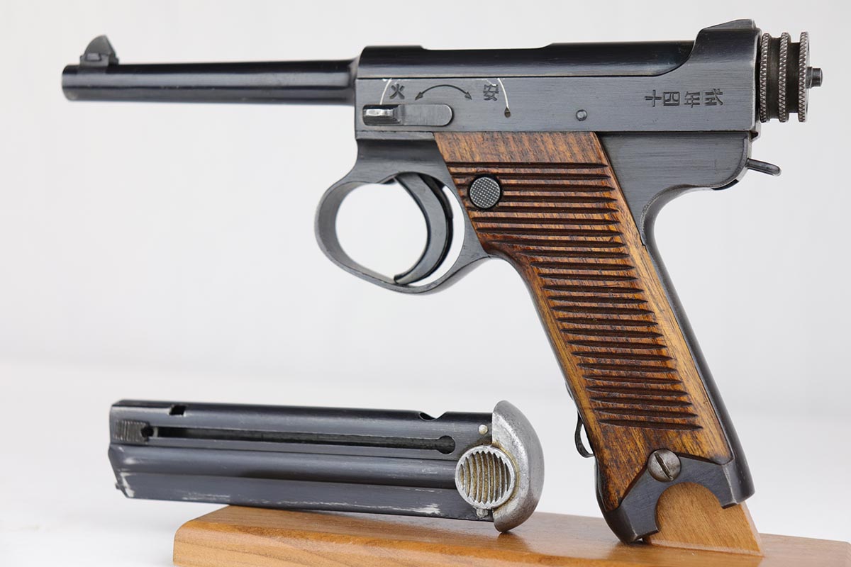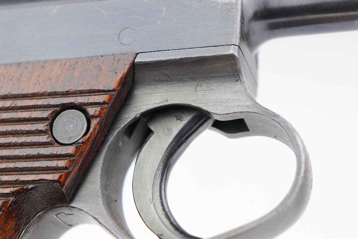 6/25/19 – Made in February of 1943, this is an excellent Nambu Type 14 with 95-97% original blue. There’s minor thinning of the straps and a hint of wear on the barrel, but most of the finish loss is on the trigger guard. There are also a few dings in the metal there. It’s a large trigger guard variation, which was adapted to fit a gloved hand in cold weather. Excellent grips and period original but mismatched magazine. The grips are not numbered, but the numbers may have been lightly scrubbed. Mint bore.