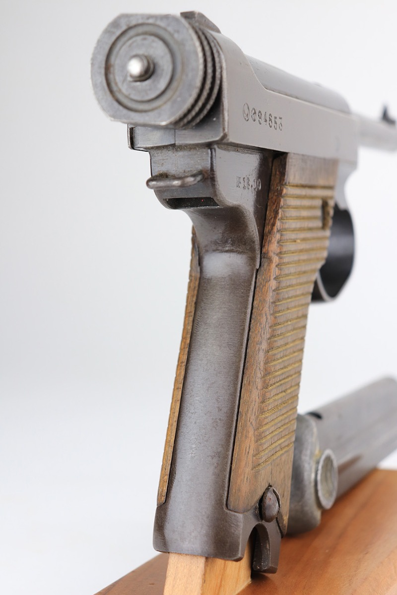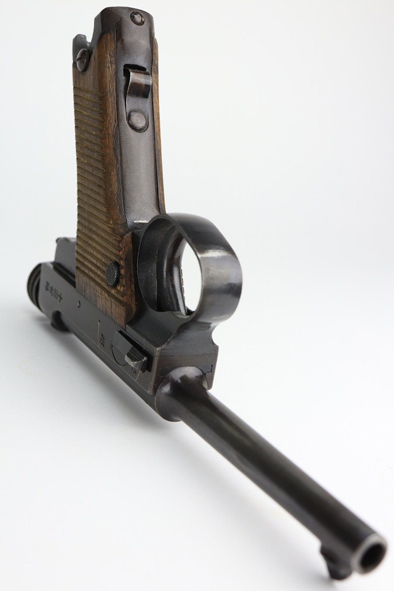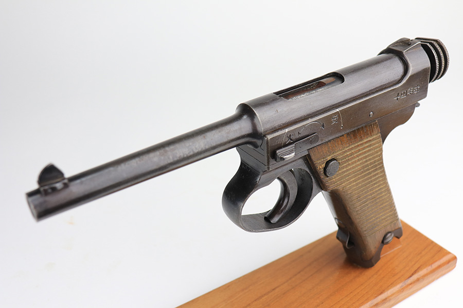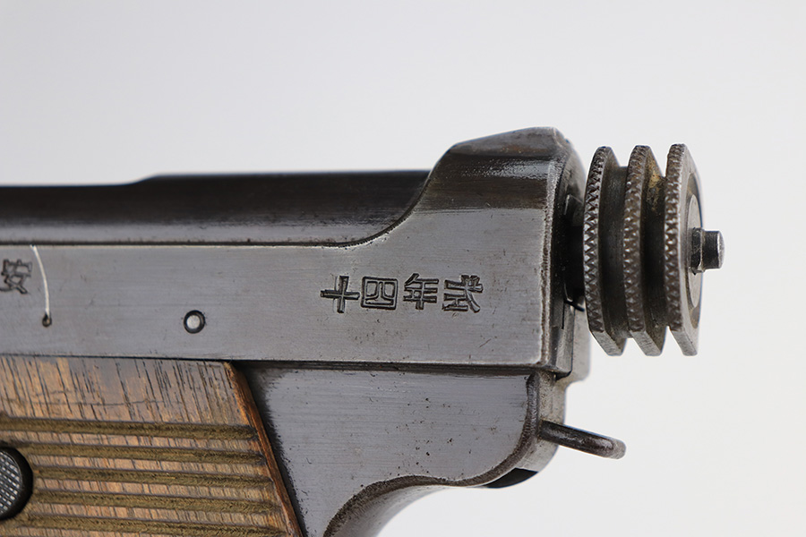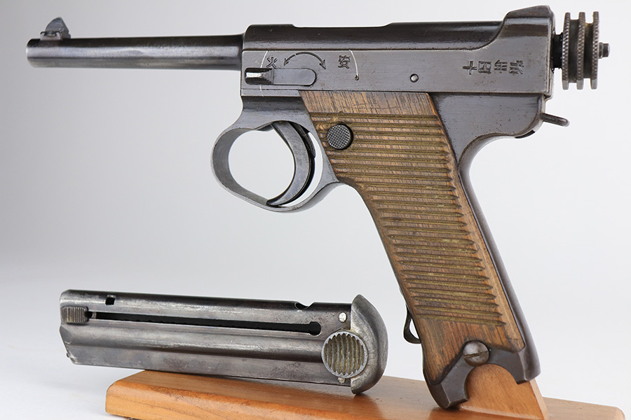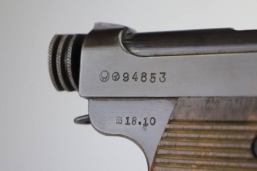 4/11/22 – This is an excellent example of Nambu Type 14 issued to the Japanese military in October of 1943. The gun is all matching and comes with one original matching-numbered magazine. It has retained about 97% of its original bluing. There is very little actual finish loss, but there is some very mild dulling in the finish throughout. There are just hints of wear on some of the high edges and just a hint of thinning along the barrel. One small spot of wear on the underside of the trigger guard. Some tiny dots of oxidation and pin-pricking on the left side of the gun. Comes with excellent matching-numbered wood grips. The bore is shiny with strong rifling with some tiny dots of freckling here and there.