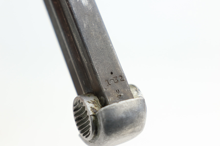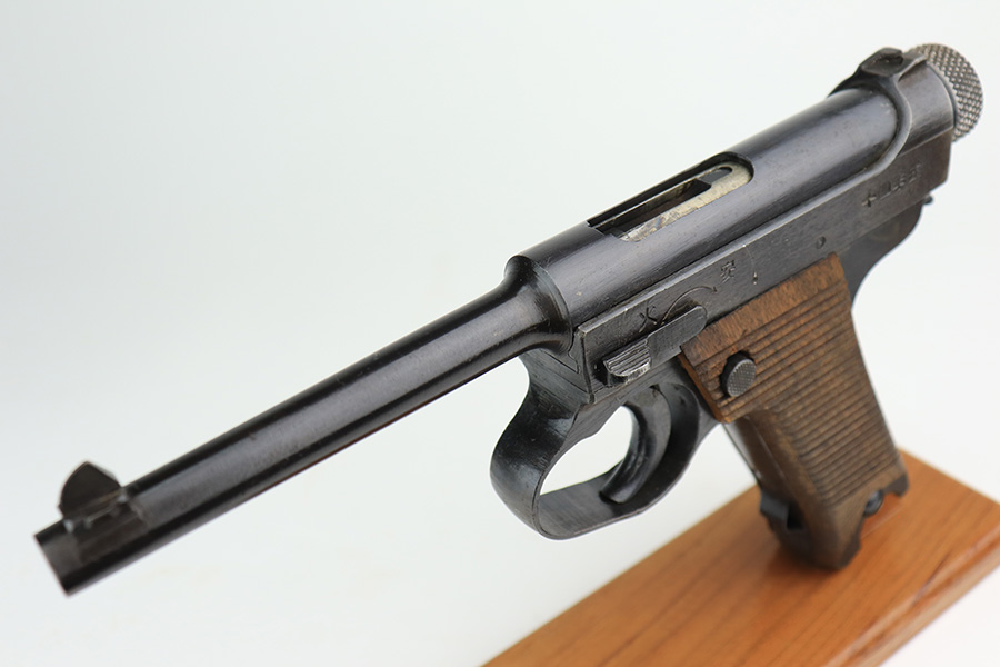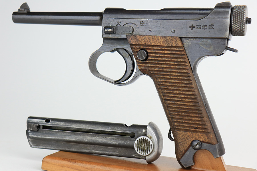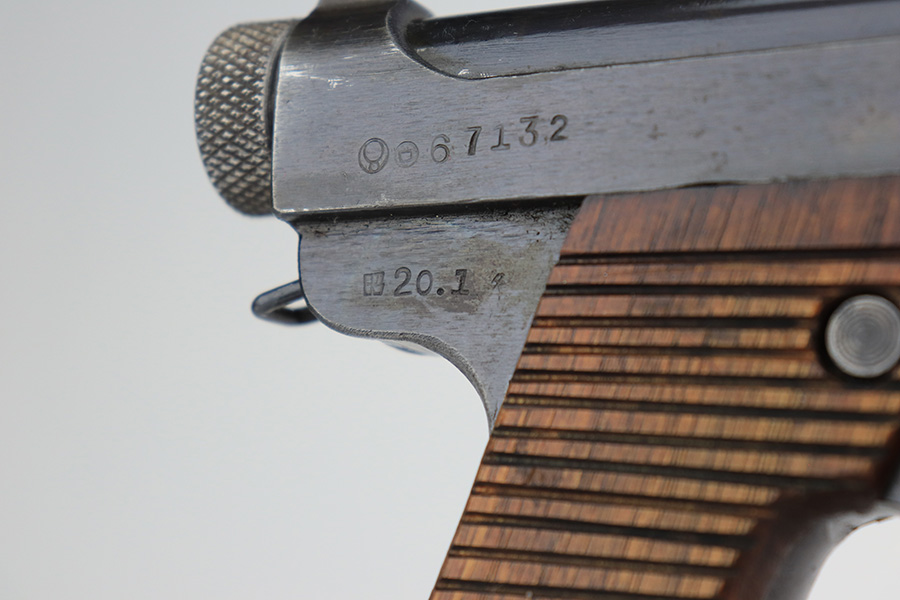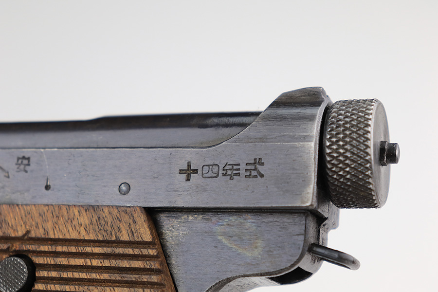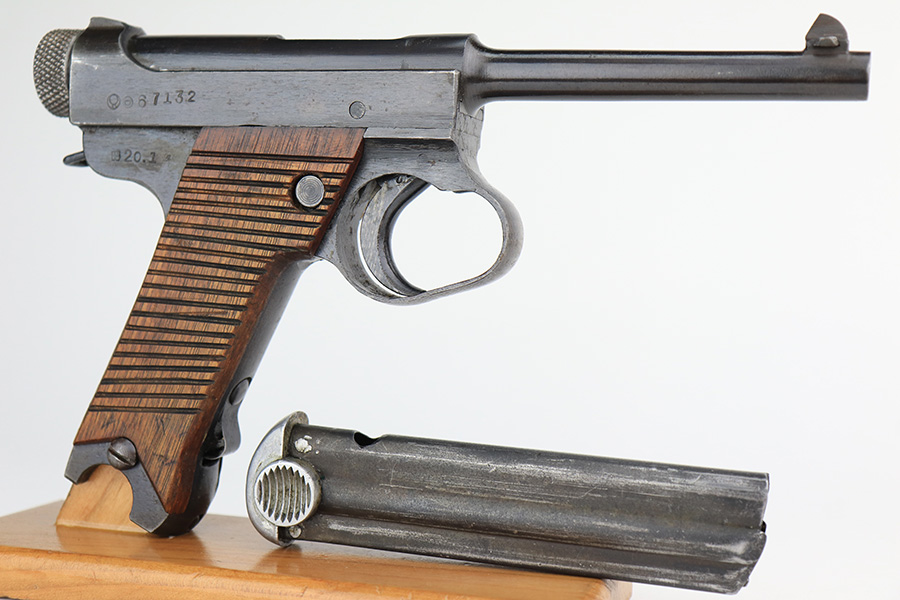 4/19/22 – This is an excellent example of a Nambu Type 14 issued to the Japanese military at the end of WW2, in January of 1945. The gun is all matching and comes with one matching-numbered magazine. It has retained about 97% of its finish with very light thinning on the back strap, minor wear on the underside of the trigger guard, and very minor wear at the back of the slide. While there is very little actual finish loss, there are some tiny dots of oxidation on the grip straps and right side of the gun. Comes with excellent wood grips – the right panel is matching, the left panel is mismatched. Mint bore.