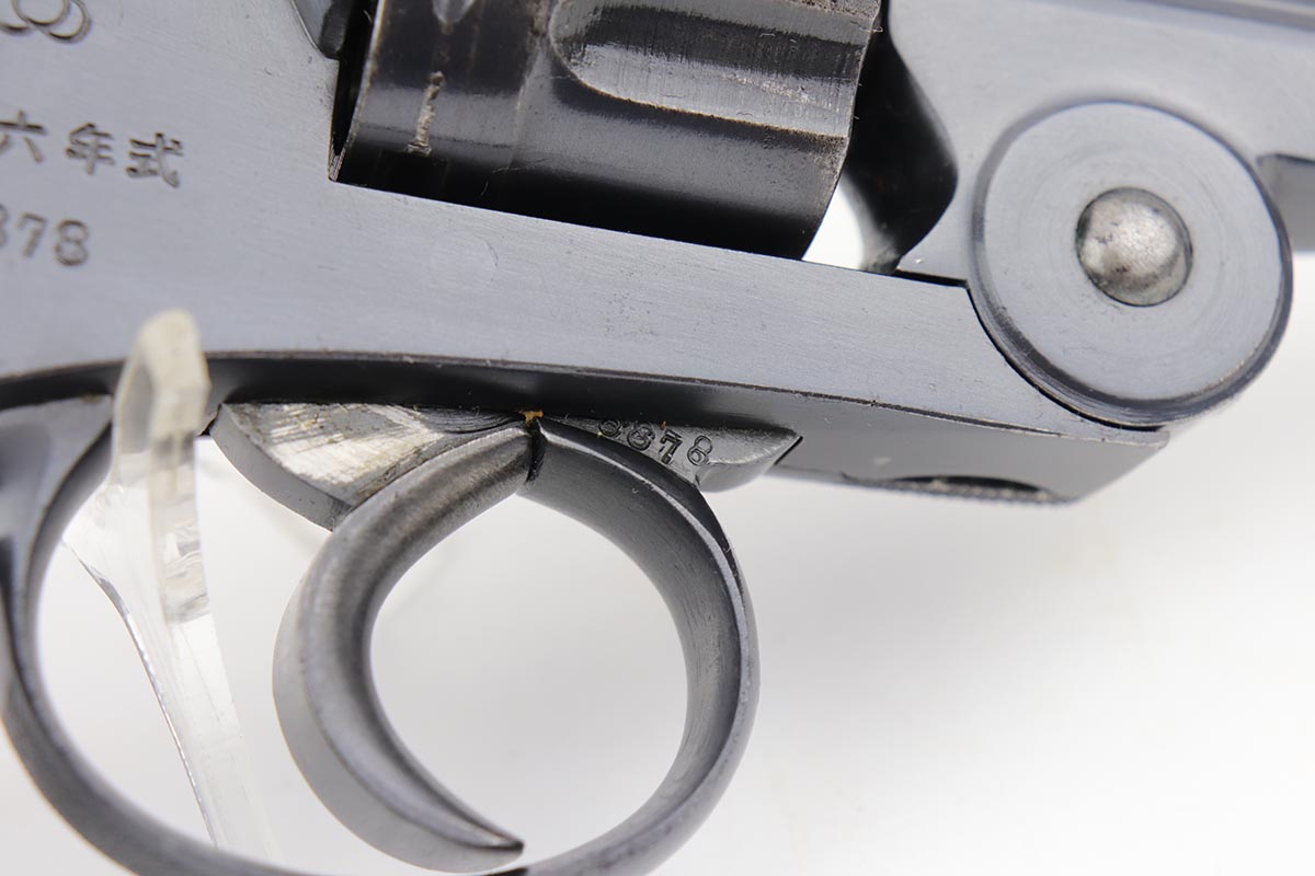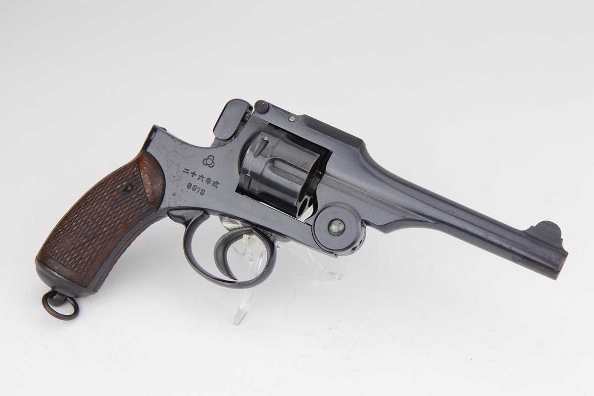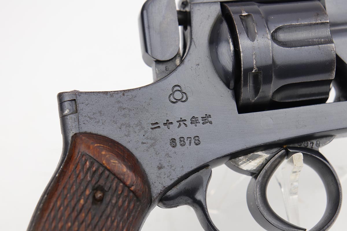 8/19/19 – This is terrific example of a Nambu Type 26 revolver. The Type 26 or Model 26 “hammerless” revolver was the first modern revolver adopted by the Imperial Japanese Army. It was developed at the Koishikawa Arsenal and is named for its year of adoption in the Japanese dating system (the 26th year of the reign of the Meiji emperor, i.e., 1893). The revolver saw action in conflicts including the Russo-Japanese War, World War I and World War II. This particular revolver has a fairly early serial and terrific bluing, rating at about 97%. There is minor muzzle and cylinder wear, and some minor oxidation on the right side of the frame. Minty bore and excellent grips. Smooth mechanics.