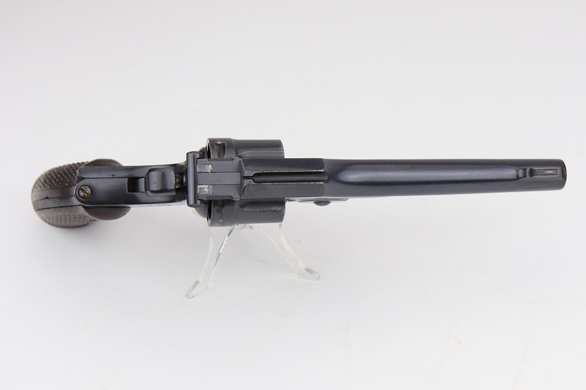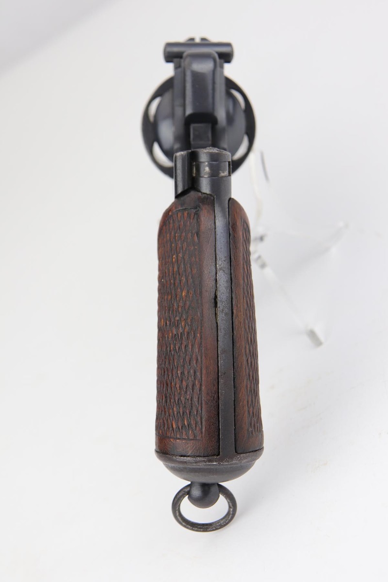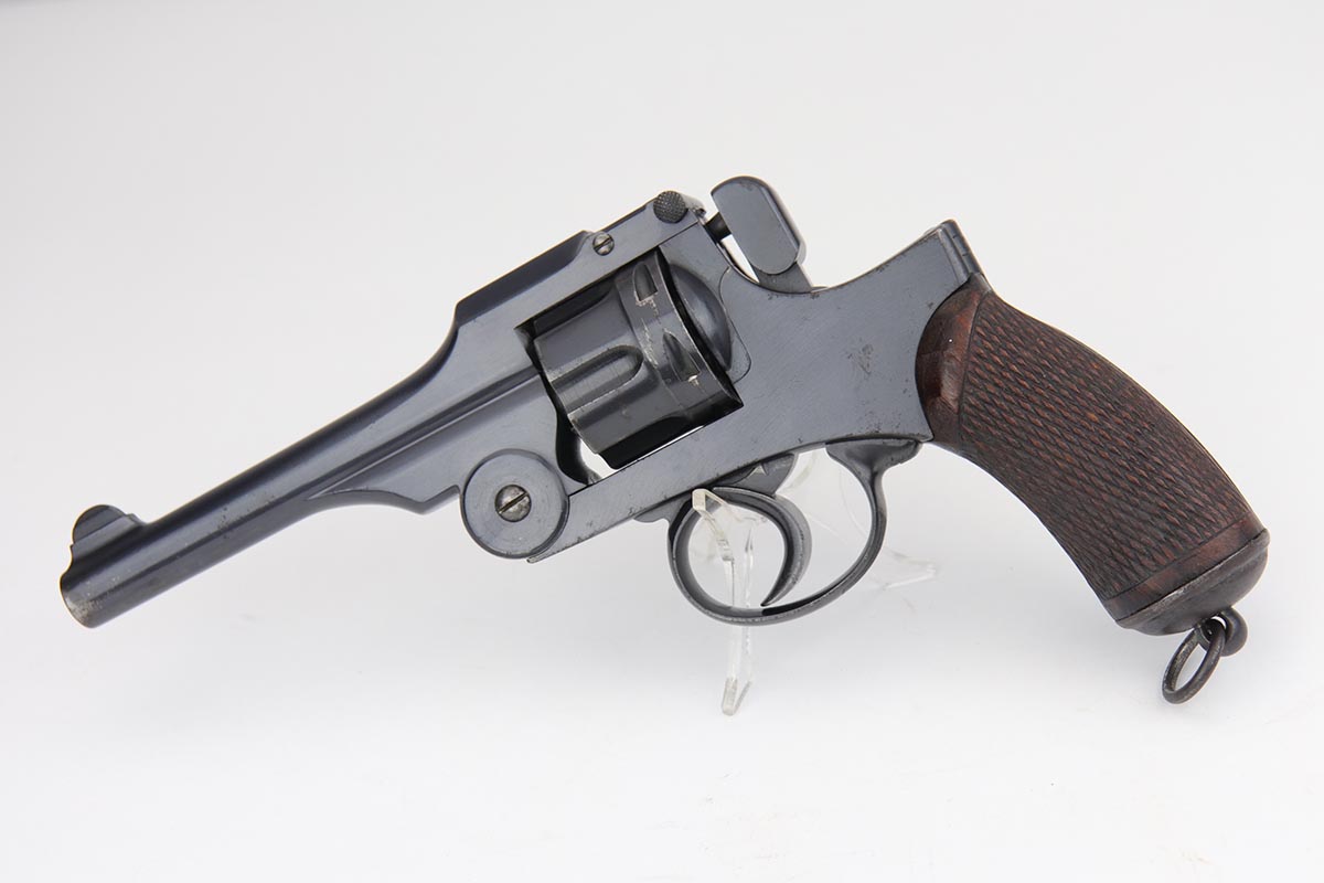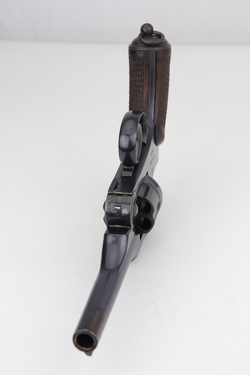 8/19/19 – This is terrific example of a Nambu Type 26 revolver. The Type 26 or Model 26 “hammerless” revolver was the first modern revolver adopted by the Imperial Japanese Army. It was developed at the Koishikawa Arsenal and is named for its year of adoption in the Japanese dating system (the 26th year of the reign of the Meiji emperor, i.e., 1893). The revolver saw action in conflicts including the Russo-Japanese War, World War I and World War II. This particular revolver has a fairly early serial and terrific bluing, rating at about 97%. There is minor muzzle and cylinder wear, and some minor oxidation on the right side of the frame. Minty bore and excellent grips. Smooth mechanics.