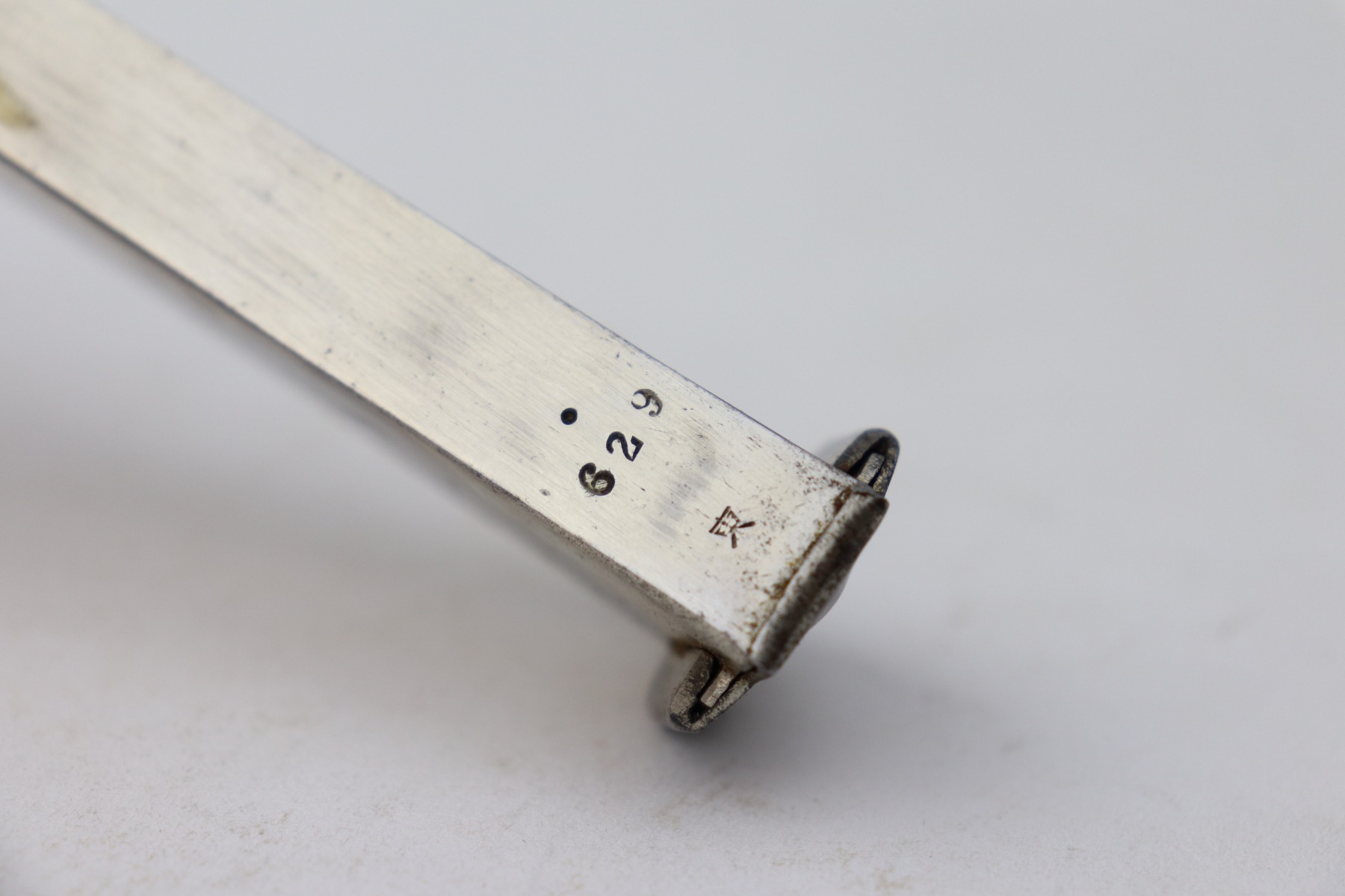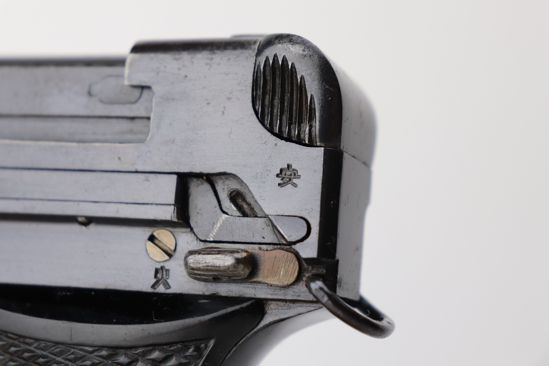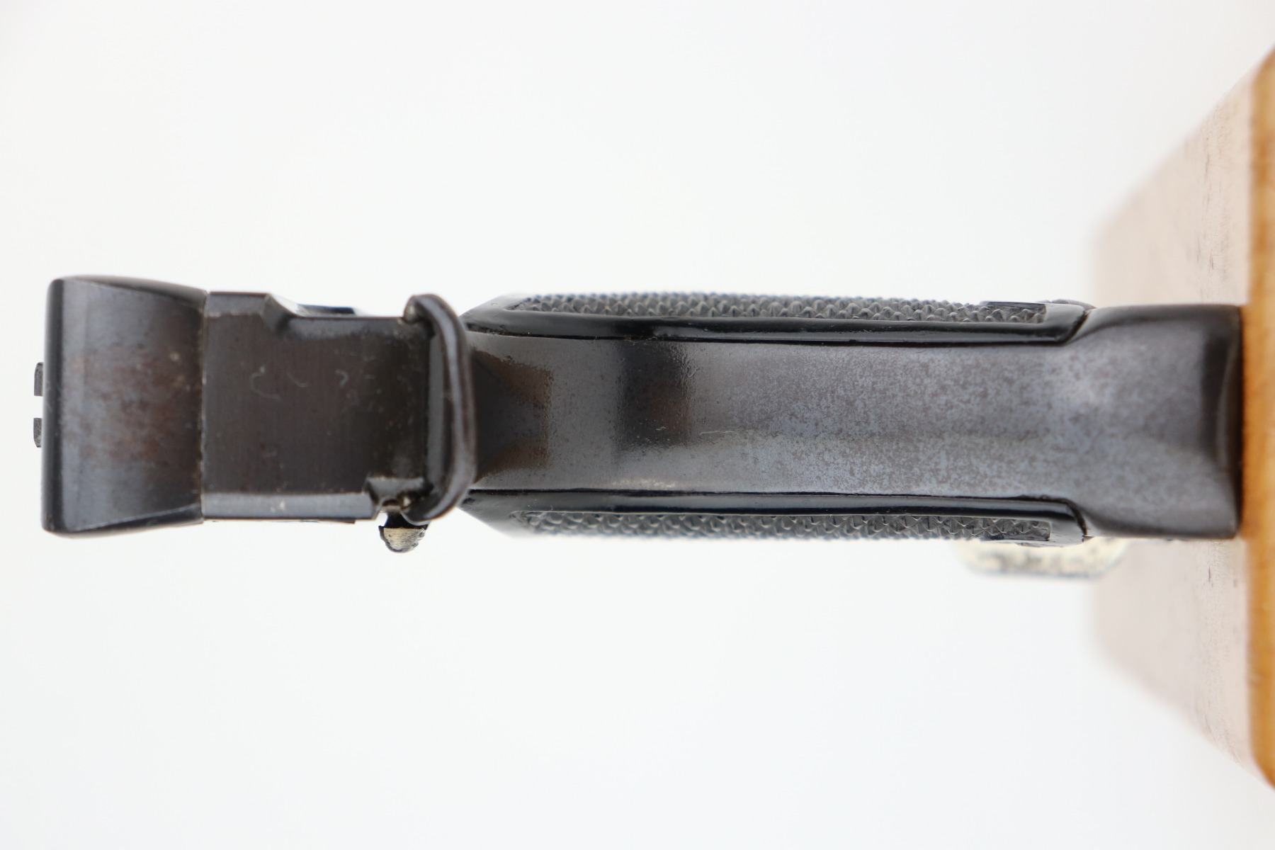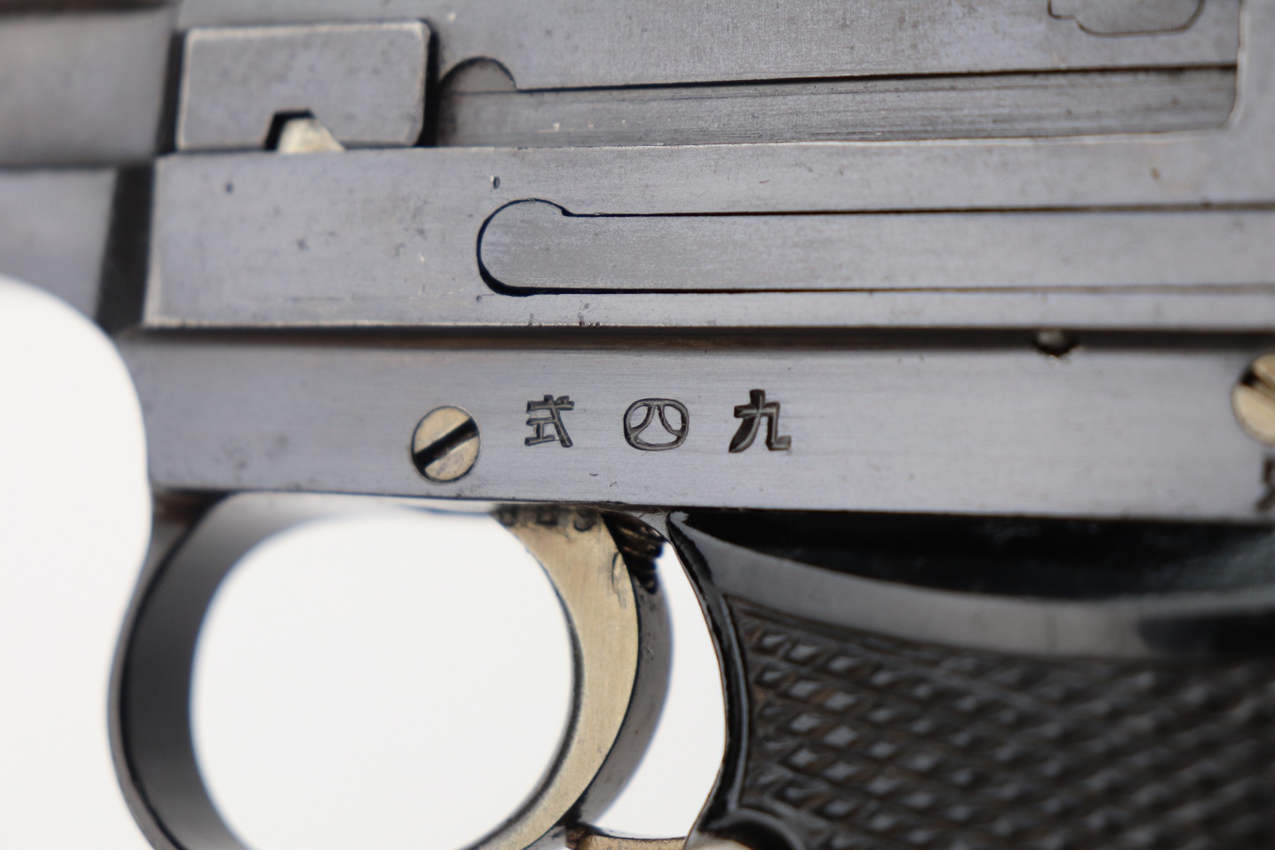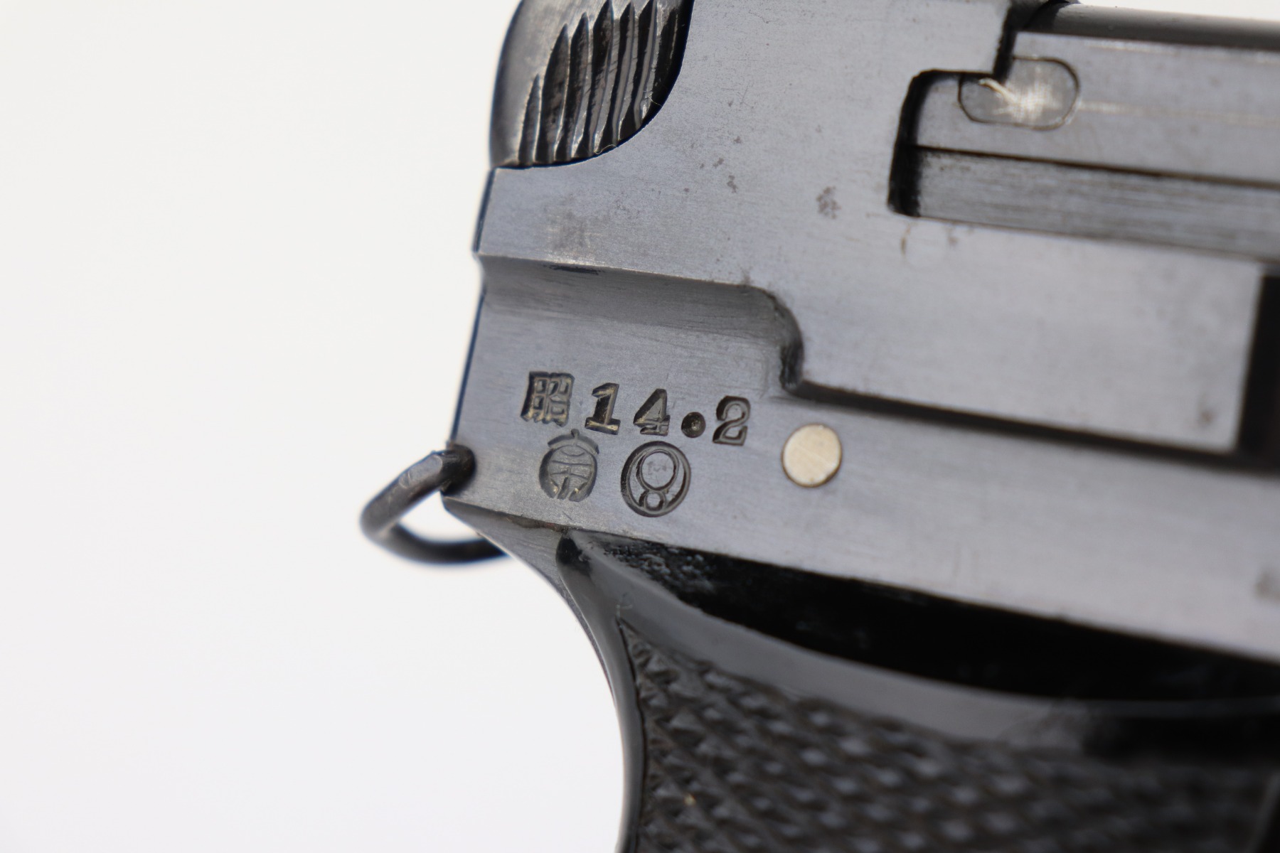 4/26/21 – This is an excellent example of a Nambu Type 94 issued to the Japanese military in February of 1939. The gun is all matching and has retained about 96-97% of its original finish. There is minor wear on the barrel, on some of the high edges, and a spot on the front strap. Spotty oxidation throughout. Straw on the trigger is in tact. Comes with excellent black bakelite grips and one matching magazine. The bore is excellent – shiny with strong rifling.