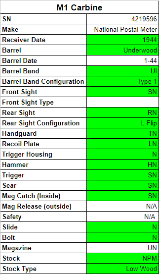 09/12/2024 – For sale is a M1 Carbine made by National Postal Meter in 1944. This carbine is “parts correct” for a NPM M1. The rifle has a great parkerized finish with some minor wear and scratches on the finish. The barrel has wear on the finish behind the front sight. The stock is in great condition but has been lightly sanded and is properly “TN” marked in the sling well and has the NPM stamp on the other side. The bore is mirror bright with great rifling. The included magazine is marked UN. The parts list is included in the photos.