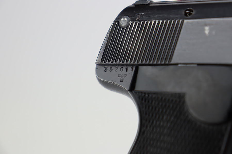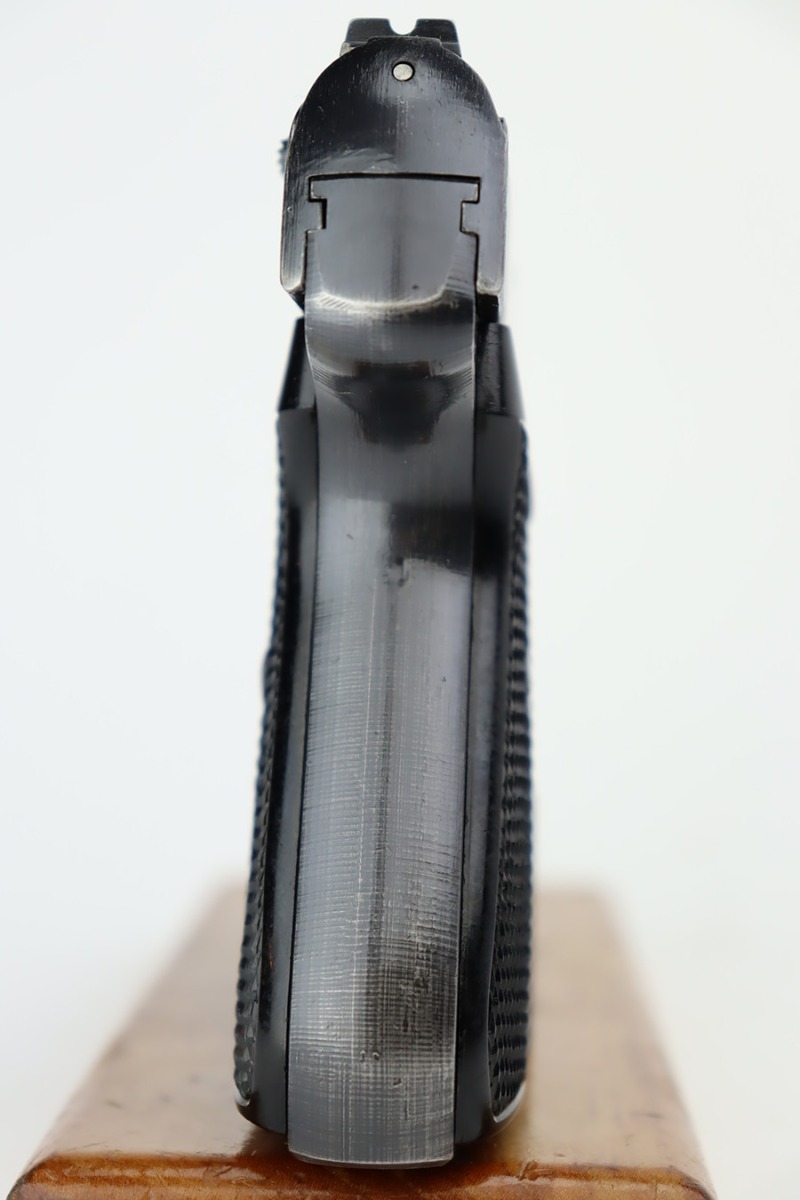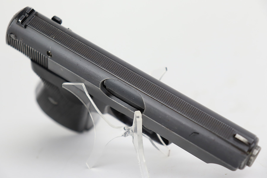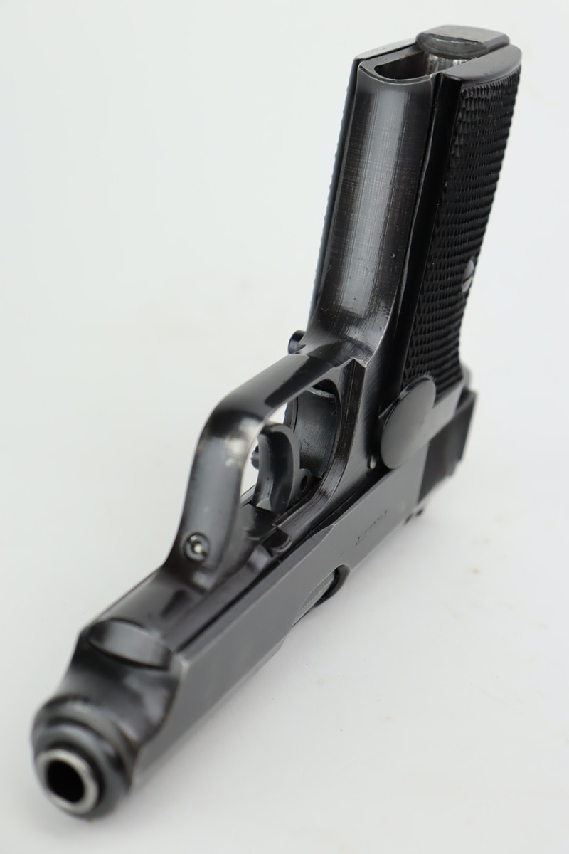 8/29/23 – This is an excellent example of a Sauer 38h issued to the Nazi military during WW2. It is all matching and has the proper “Eagle 37” military acceptance proof on the left side of the trigger guard. It comes as a rig with two Sauer & Sohn marked magazines and a black waffen-proofed, 1944-dated holster. The gun itself has retained about 95% of its original wartime finish with minor wear around the muzzle and on the high edges in general. Hints of thinning on the grip straps. Fitted with excellent period-correct black bakelite grips. Mint bore.