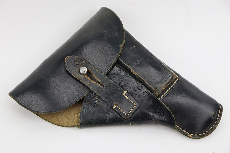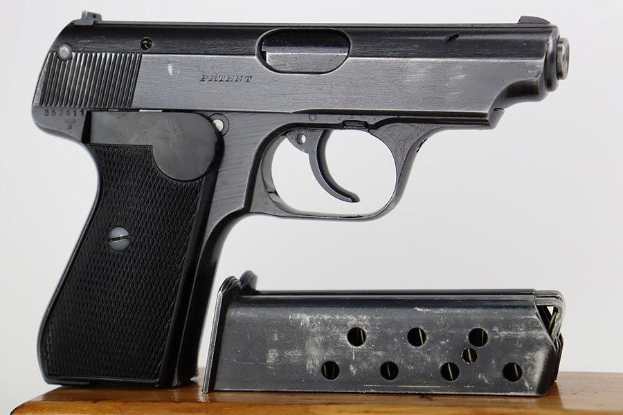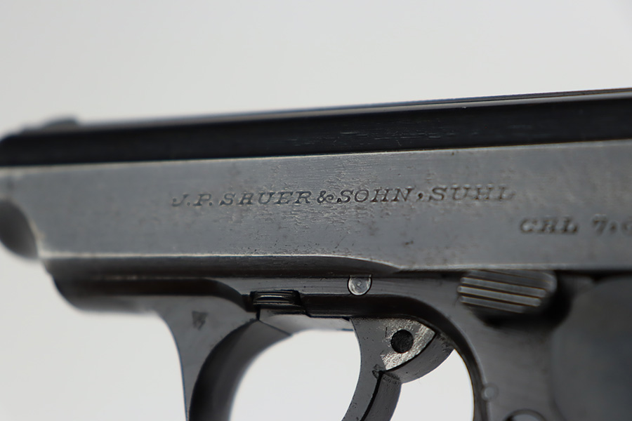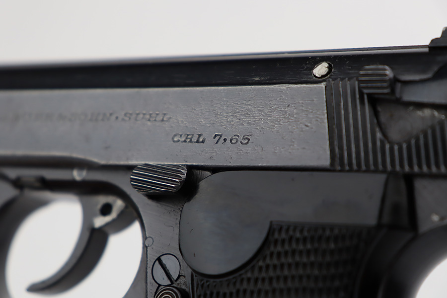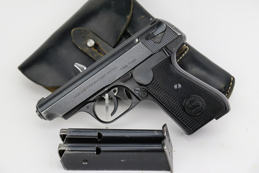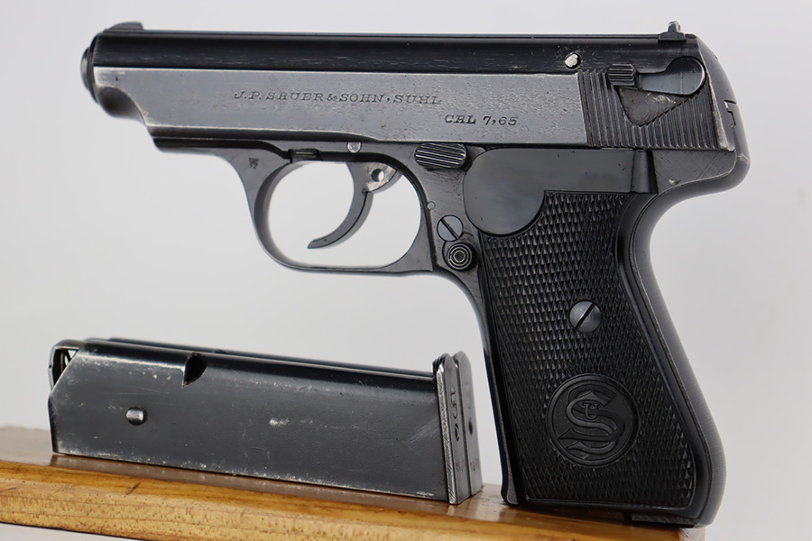 8/29/23 – This is an excellent example of a Sauer 38h issued to the Nazi military during WW2. It is all matching and has the proper “Eagle 37” military acceptance proof on the left side of the trigger guard. It comes as a rig with two Sauer & Sohn marked magazines and a black waffen-proofed, 1944-dated holster. The gun itself has retained about 95% of its original wartime finish with minor wear around the muzzle and on the high edges in general. Hints of thinning on the grip straps. Fitted with excellent period-correct black bakelite grips. Mint bore.
