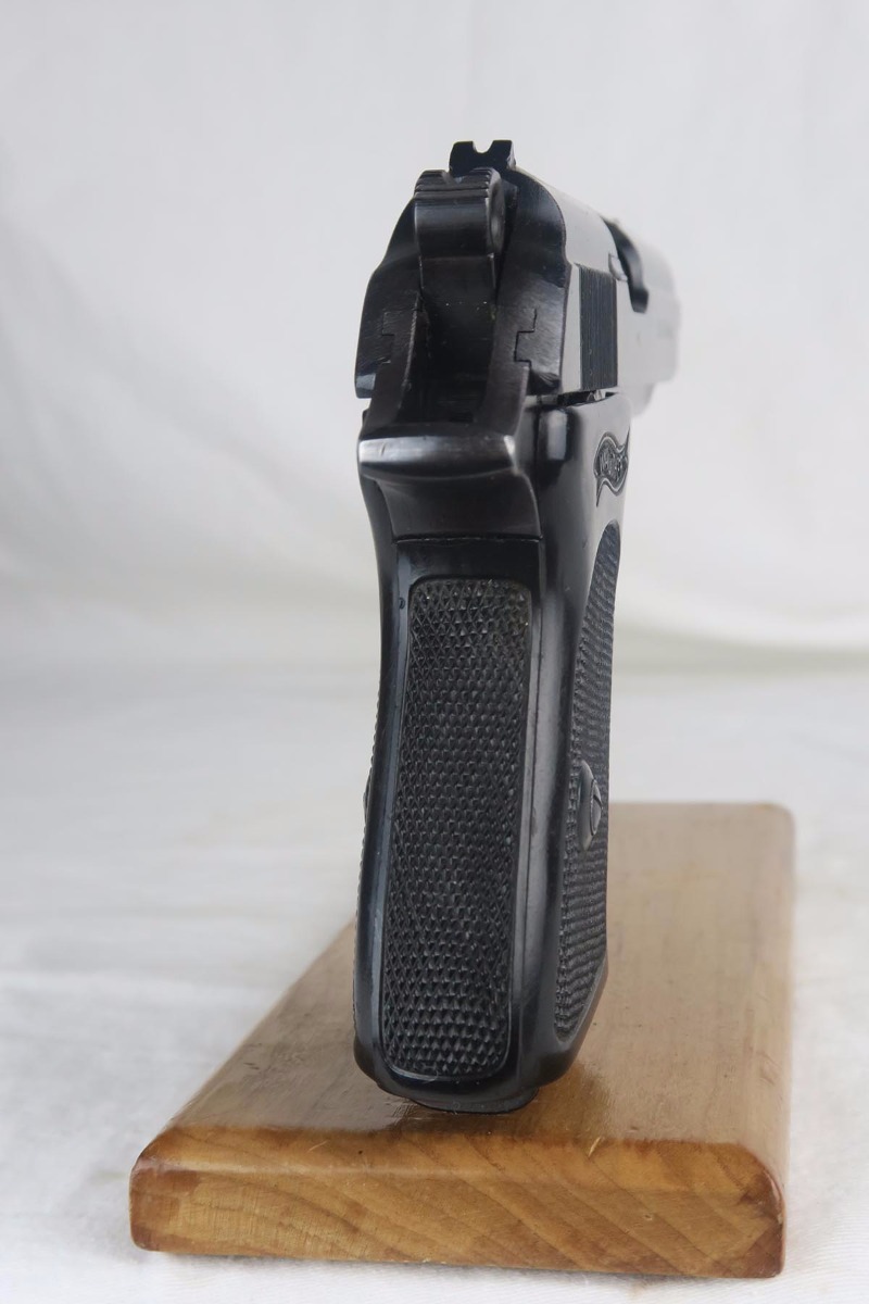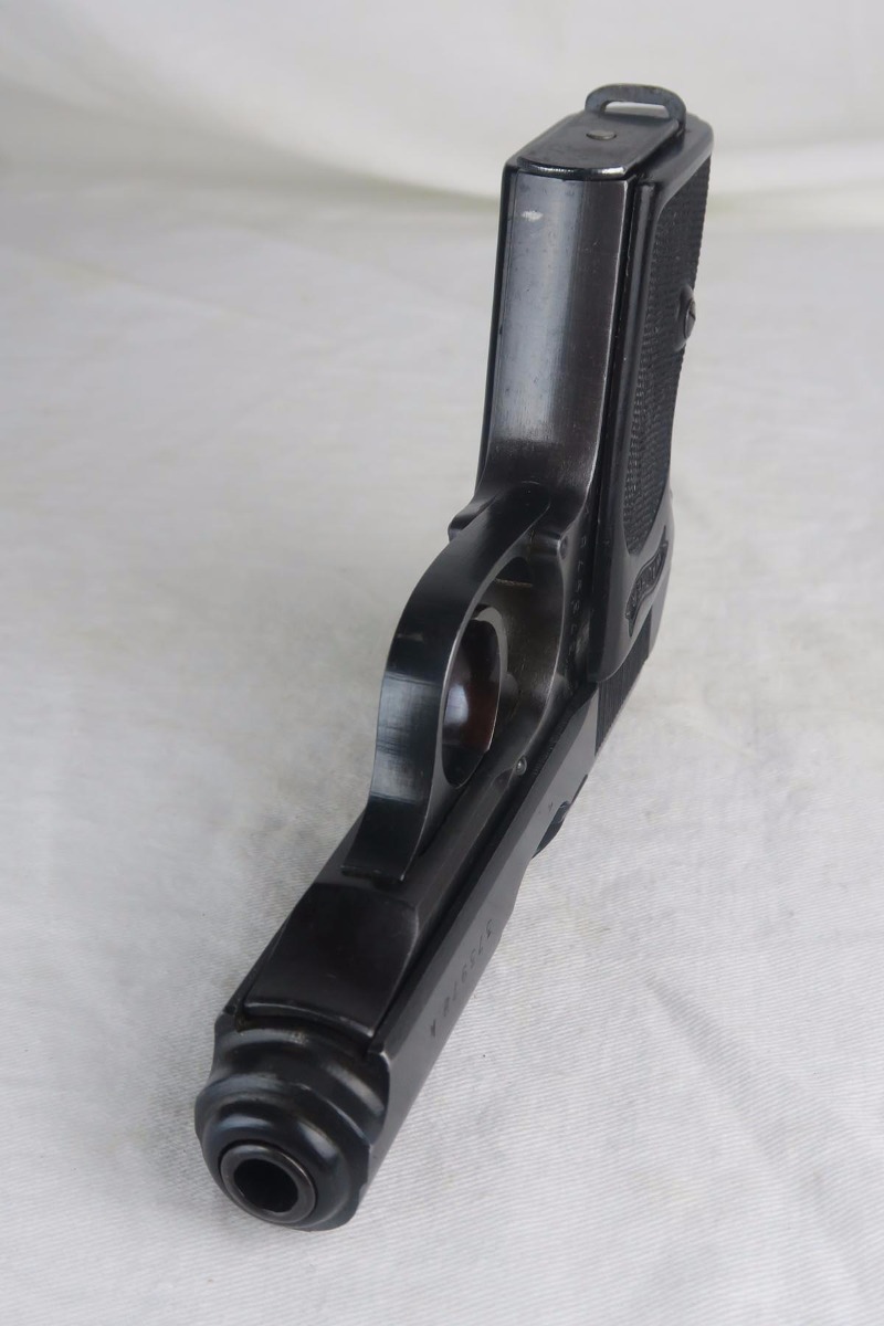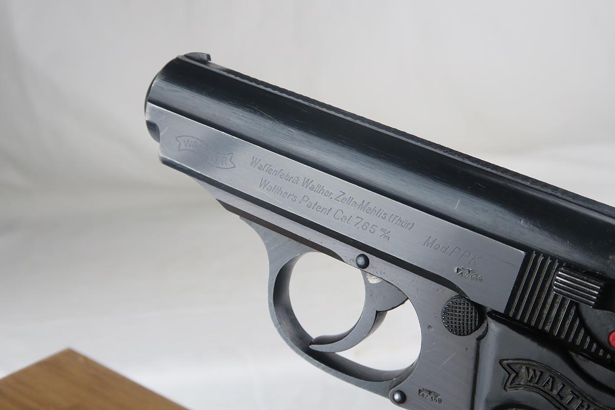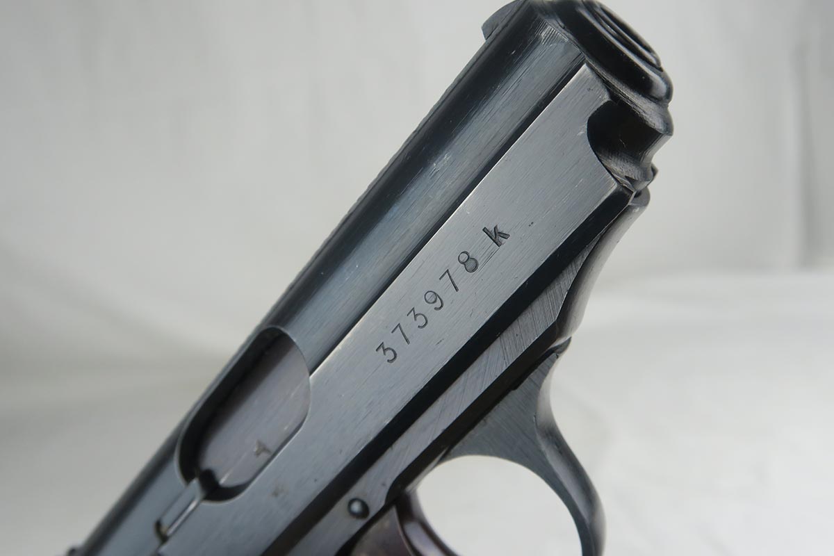 11/24/17 – This is a very nice, all original Walther PPK that was issued to the German Army during World War II. All matching and correct, the military blue rates at about 97%. There is muzzle wear on both sides of the slide and a spot of finish loss on the front strap. This is a third variation army PPK, with WaA359 proof on frame and slide. There were only 12,500 of this variation produced. Black grip is in excellent shape aside from the common stress crack on the spine. Wartime magazine. Minty bore.
