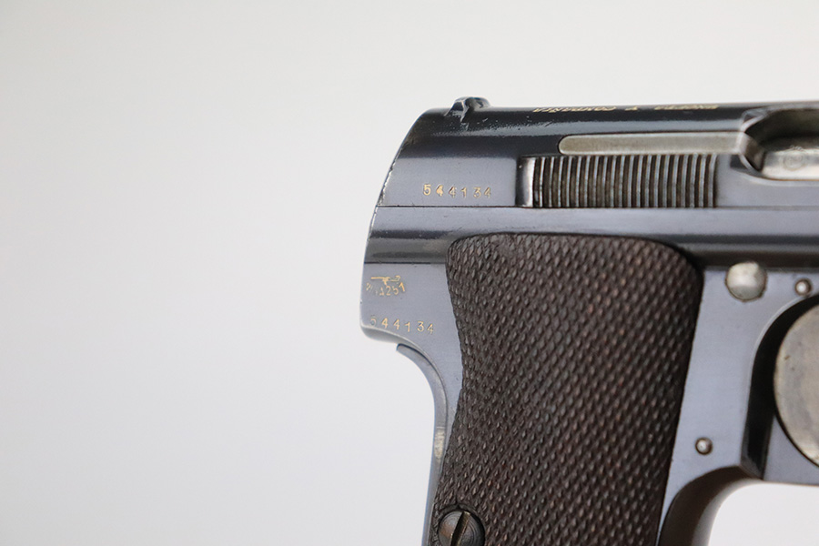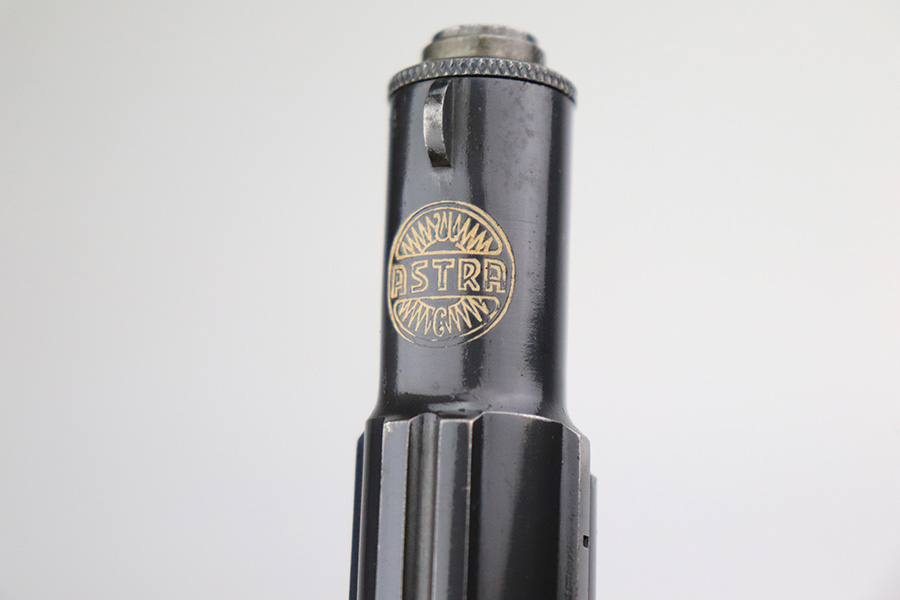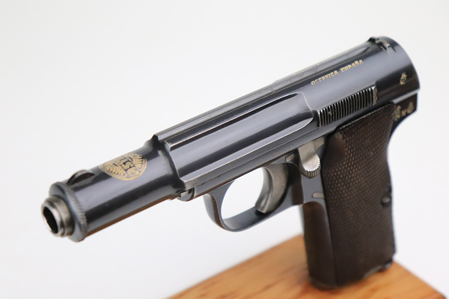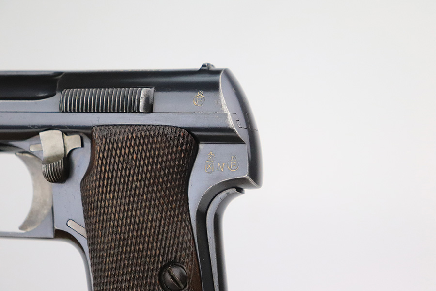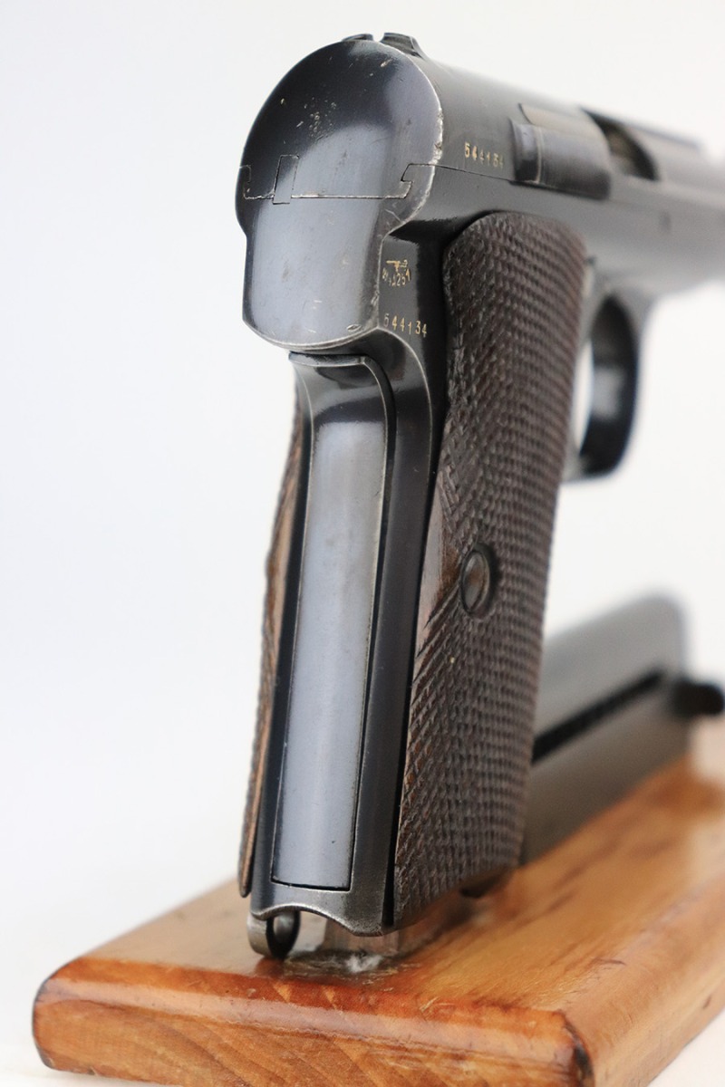 7/14/22 – This is an excellent example of an Astra Model 300 delivered to the Nazi military on April 30th, 1942. The gun is all matching and has the proper “Waffen 251” military acceptance proof on the right side of the tang. It has retained about 97% of its original finish. There is very minor wear around the high edges and an area of light freckling around the muzzle. Comes with very nice period-correct wood grips and one proper magazine. The bore has strong rifling with some areas of very minor pin-pricking here and there.