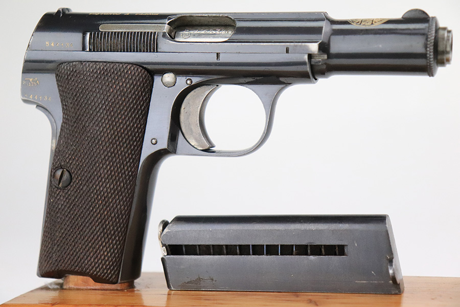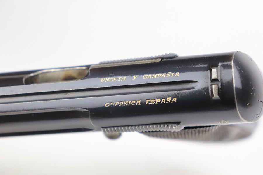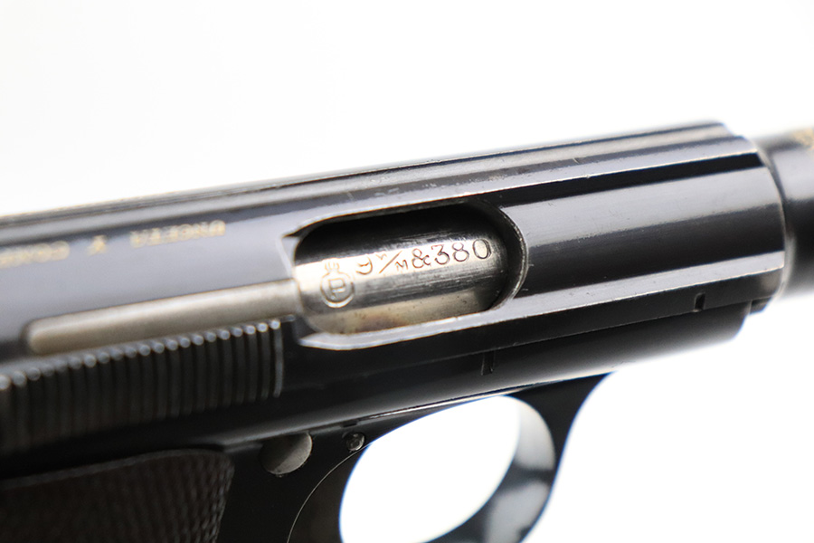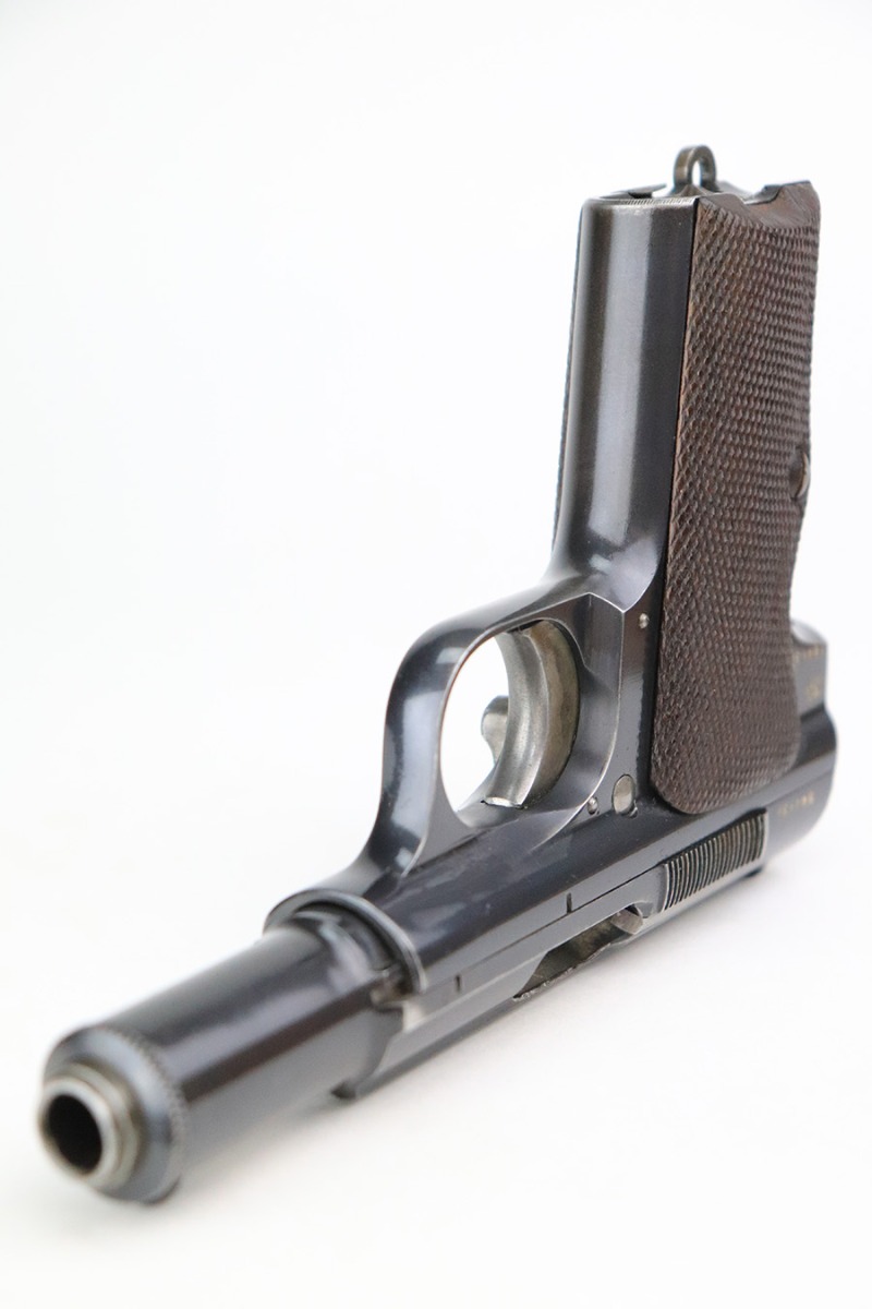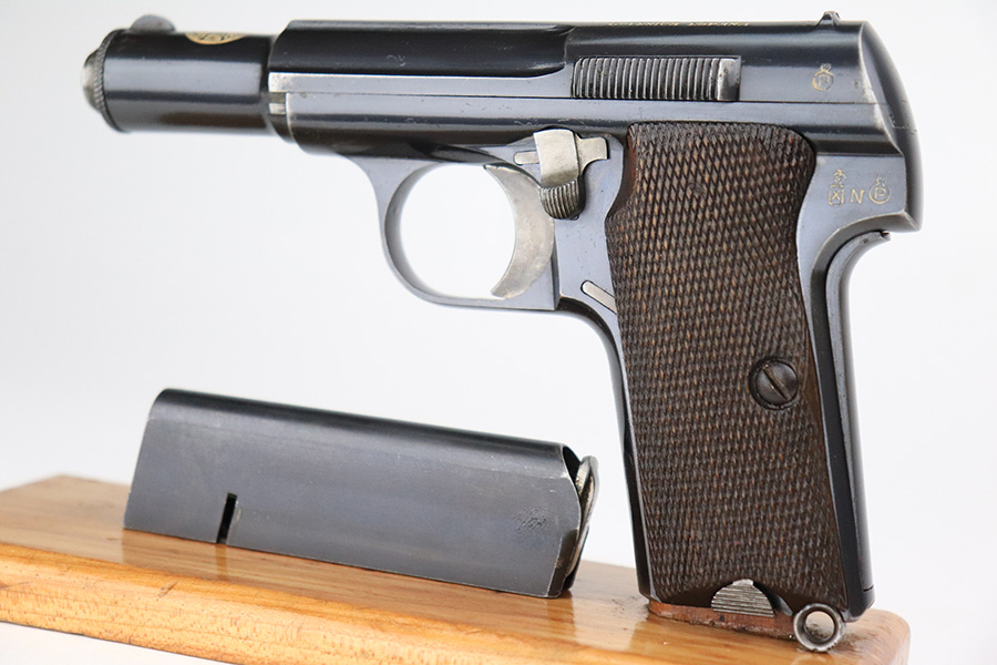 7/14/22 – This is an excellent example of an Astra Model 300 delivered to the Nazi military on April 30th, 1942. The gun is all matching and has the proper “Waffen 251” military acceptance proof on the right side of the tang. It has retained about 97% of its original finish. There is very minor wear around the high edges and an area of light freckling around the muzzle. Comes with very nice period-correct wood grips and one proper magazine. The bore has strong rifling with some areas of very minor pin-pricking here and there.