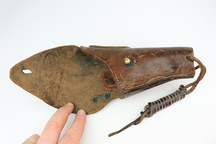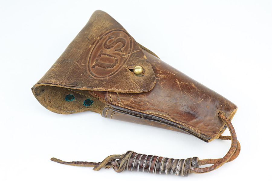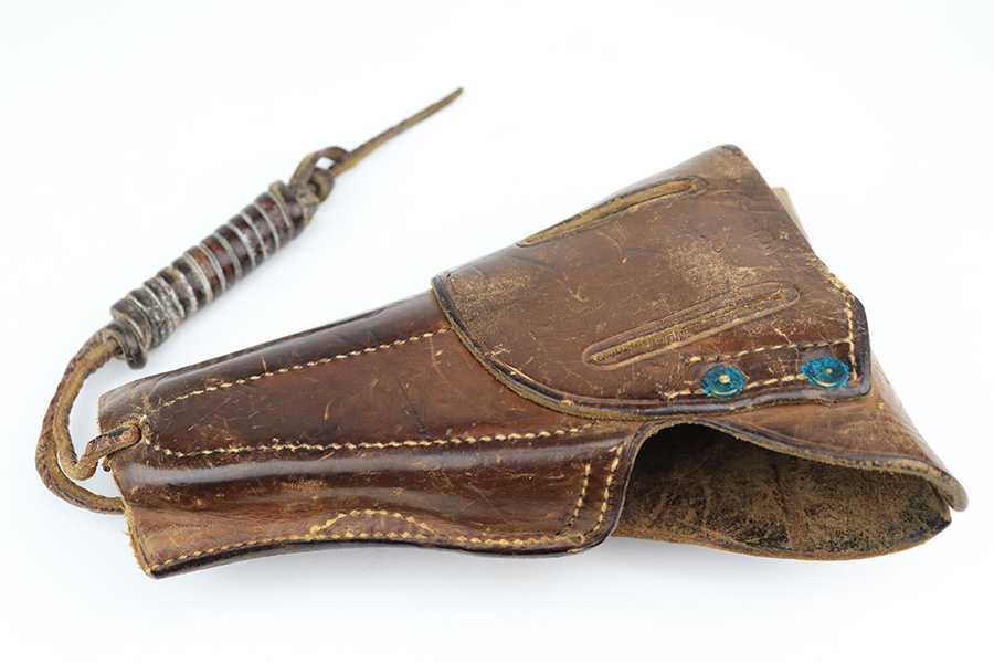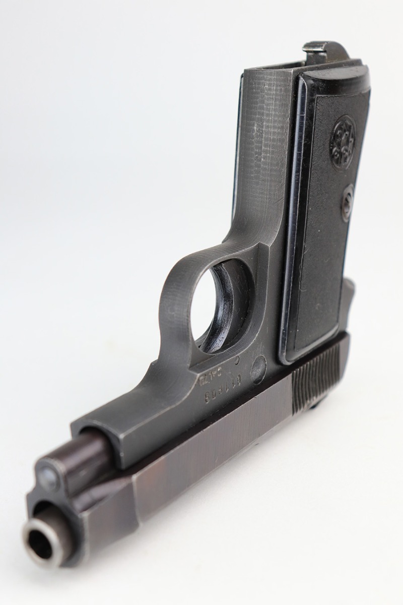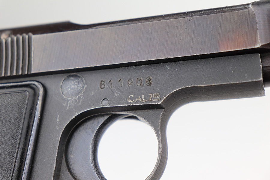 3/31/22 – This is an excellent Beretta M1935 with 4UT marking on frame and cool U.S. marked holster. Jan Still’s book on the axis pistols notes that a Beretta factory letter indicates the ‘4UT’ marking found on the frame of this pistol as having been a “German acceptance quality control” and being part of a lot that was delivered to the German Army headquarters in Italy. The pistol is matching and original with about 98% of the parkerized finish remaining. Minty bore and grips. Original magazine. The pistol comes with an interesting holster, as an original 1911A1 holster was modified to fit this Beretta. So either the Italian soldier that carried the pistol captured an American holster and modified it to fit their pistol, or an American soldier captured the pistol and modified their own holster to fit the gun. Haven’t seen one like it before though.