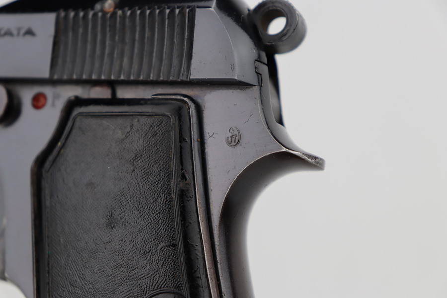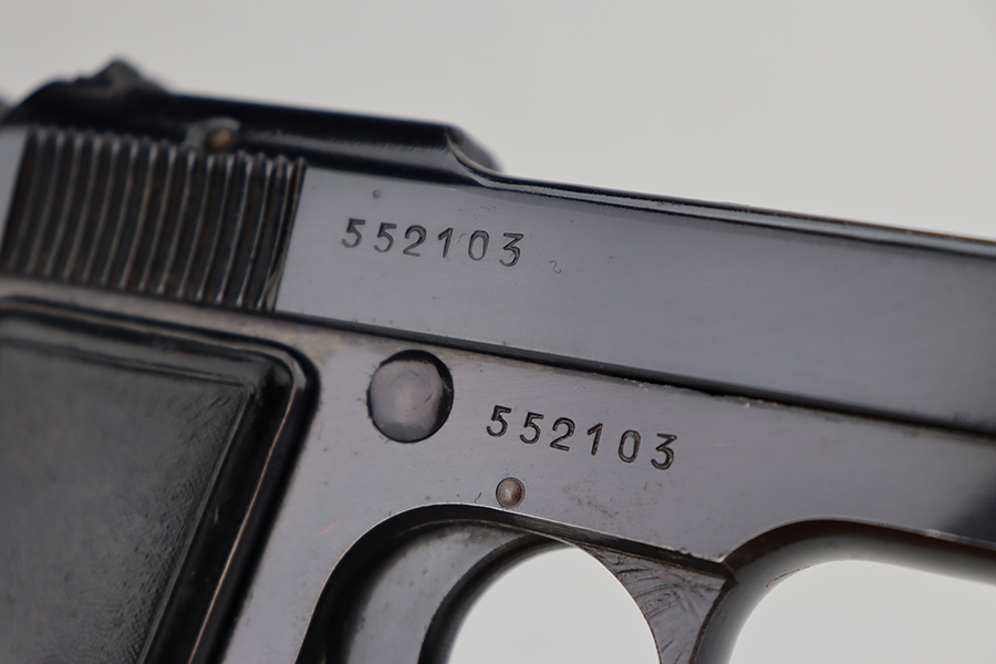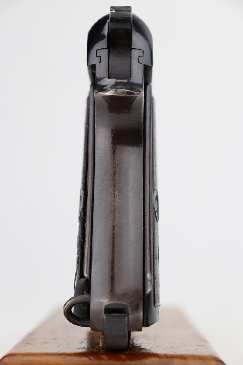 6/12/23 – This is an excellent example of a Beretta Model 1935 manufactured in 1944 and chambered in 7.65mm. All matching. There is a “4UT” marking on the left side of the tang, indicating it was issued to the Nazi military. This particular gun has a more desirable and scarcer high polish finish. It has retained about 97% with very minor thinning and some light brown patina on the grip straps. Fitted with excellent period-correct black bakelite grips. Comes with one proper magazine. Mint bore.