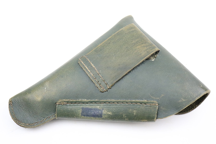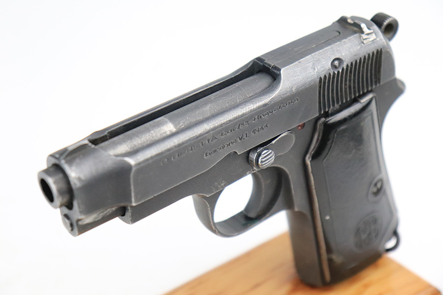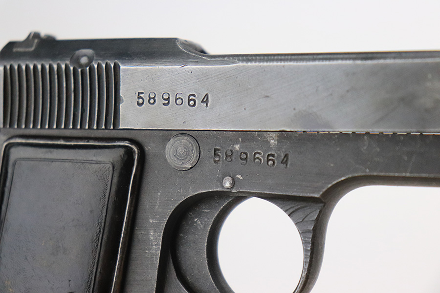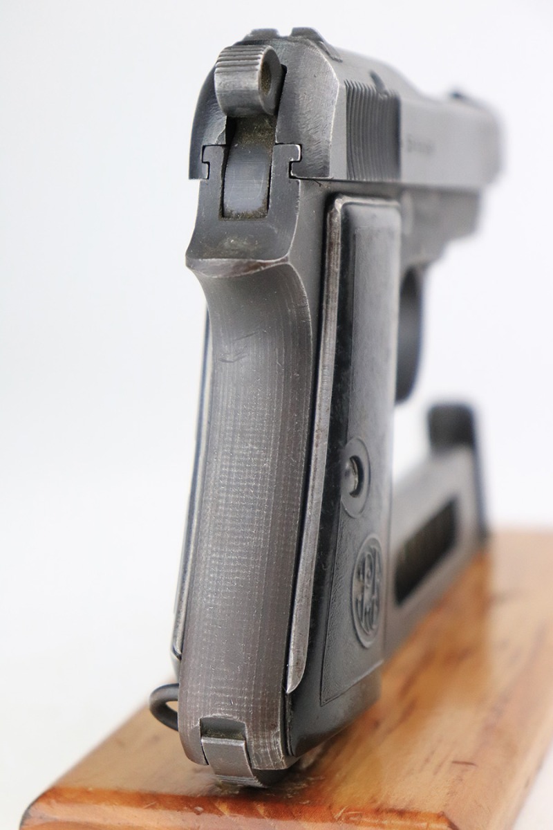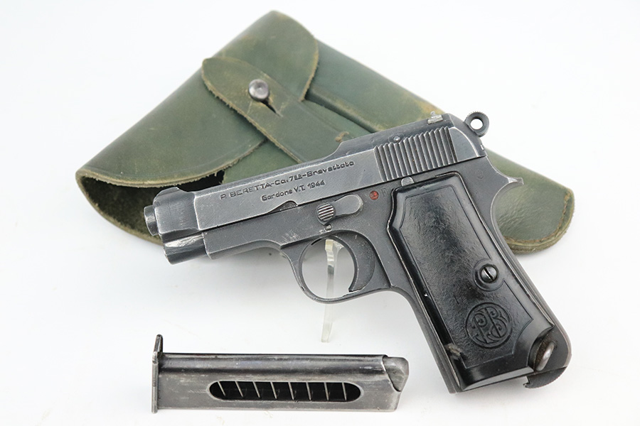 7/5/22 – This is an excellent example of a Beretta Model 1935 manufactured in 1944. It is all matching and has a “4UT” marking on the left side of the frame, indicating it was issued to the Nazi military. It comes as a rig with an excellent period-correct green leather holster (unmarked) and one flat-bottom magazine. The gun itself has retained about 95% of its original wartime finish. There are hints of thinning on the grip straps and minor wear concentrated around the muzzle and high edges of the slide. Comes with very nice black bakelite grips – one small blemish on the left side. Mint bore.