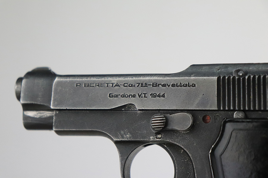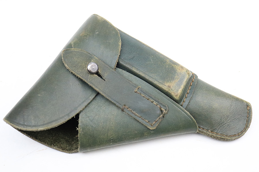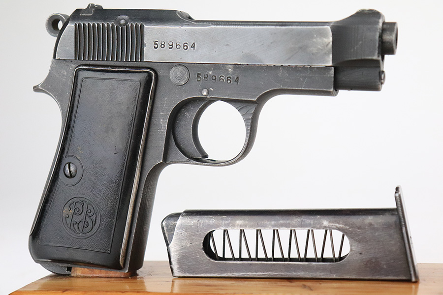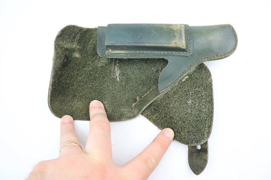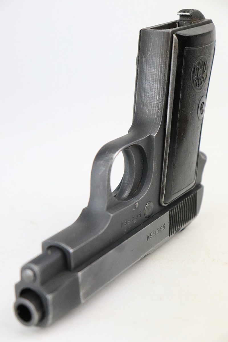 7/5/22 – This is an excellent example of a Beretta Model 1935 manufactured in 1944. It is all matching and has a “4UT” marking on the left side of the frame, indicating it was issued to the Nazi military. It comes as a rig with an excellent period-correct green leather holster (unmarked) and one flat-bottom magazine. The gun itself has retained about 95% of its original wartime finish. There are hints of thinning on the grip straps and minor wear concentrated around the muzzle and high edges of the slide. Comes with very nice black bakelite grips – one small blemish on the left side. Mint bore.