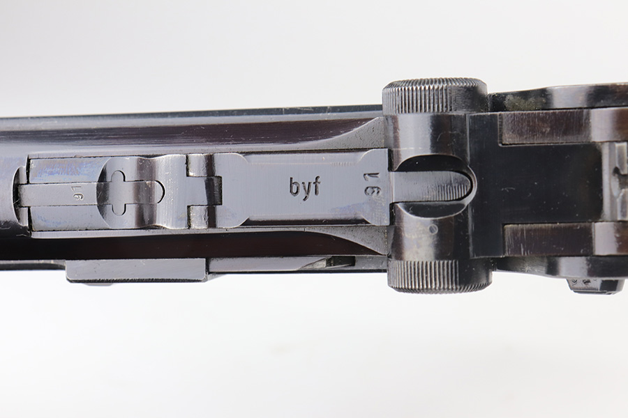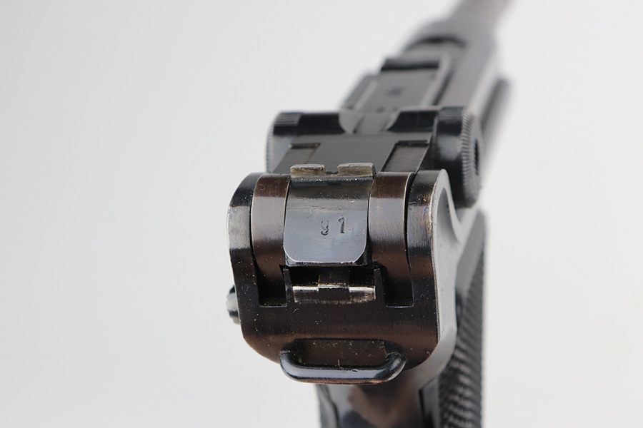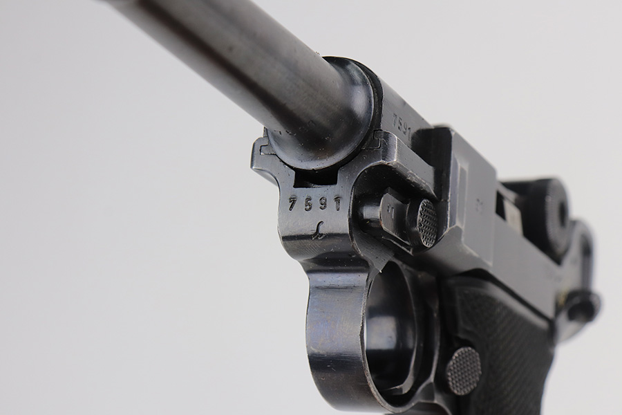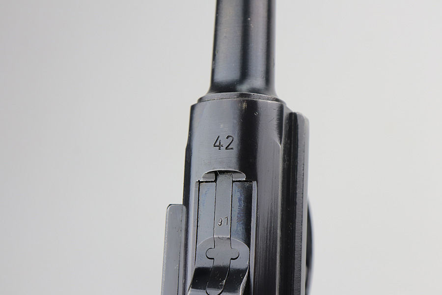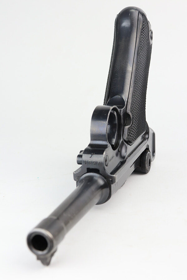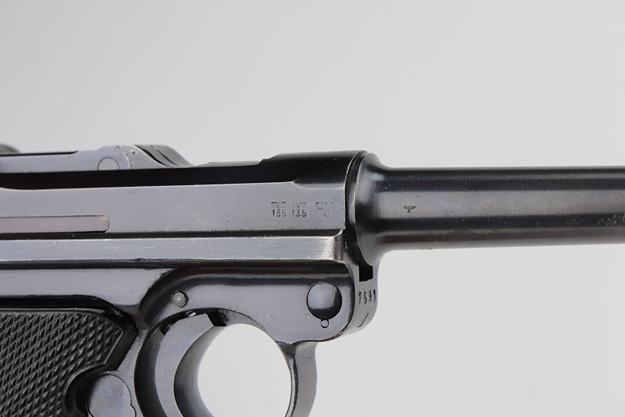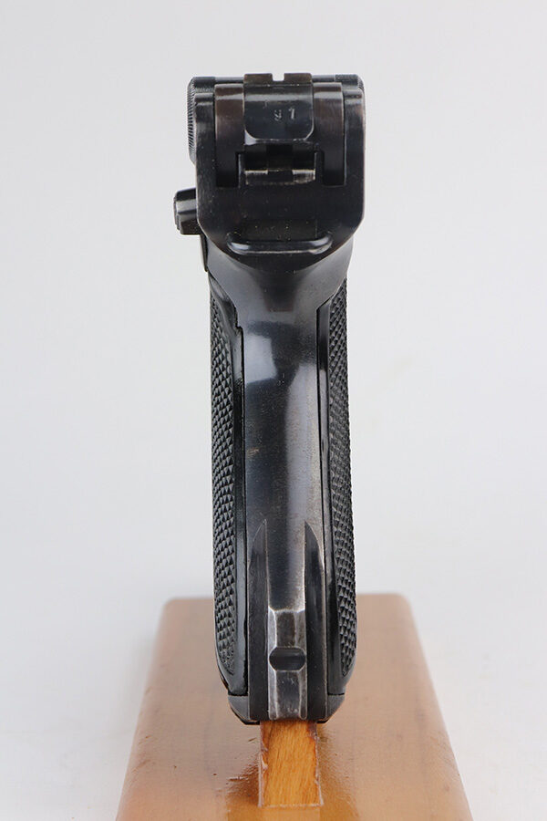 6/11/21 – This is an excellent example of a Black Widow Mauser Luger issued to the Nazi military in 1942. It is all matching and has the proper “Eagle 135” military proofs. It has retained about 95-96% of its original finish. There are areas of minor wear on the side plate, side rails, and around the muzzle. Some very tiny dings on the underside of the barrel. Very minor thinning on the straps. Comes with excellent original black widow grips and a proper black widow magazine. Mint bore.