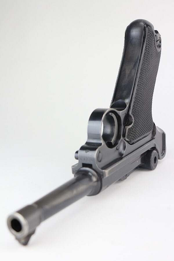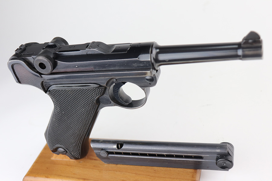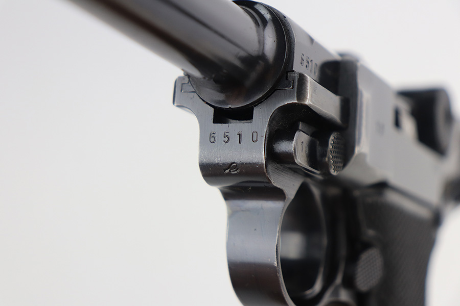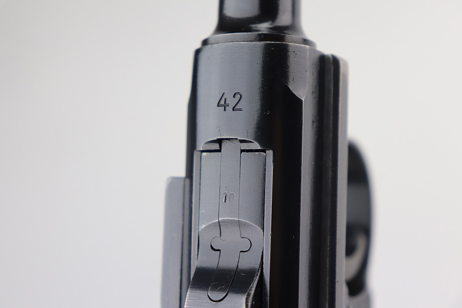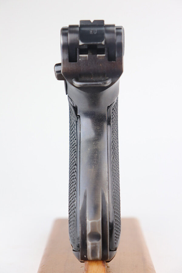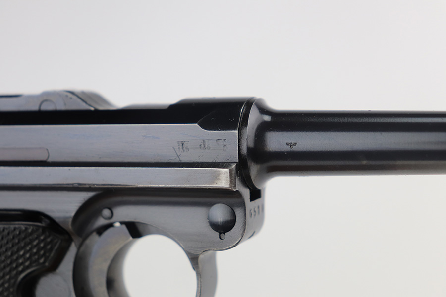 6/22/21 – This is an excellent example of a “Black Widow” Mauser Luger issued to the Nazi military in 1942. The gun is all matching and the proper “Eagle 135” military proofs. It comes with a nice 1941-dated waffen-proofed holster and two correct black widow magazines. One of the magazines is numbered on the bottom in the “ku” Luger style. The gun has retained about 96% of its bluing. There is minor wear on the side plate, side rails, and around the muzzle. A few spots of wear on the barrel. Minor thinning and pin-pricking on the straps. A small “H” scratched into the back strap. Comes with excellent black widow grips. The bore has strong rifling with freckling in the grooves.