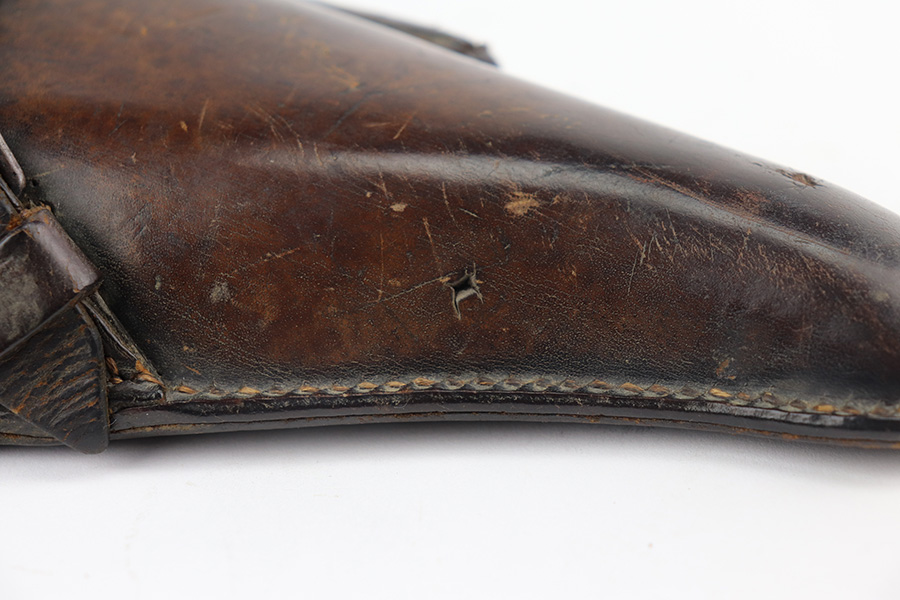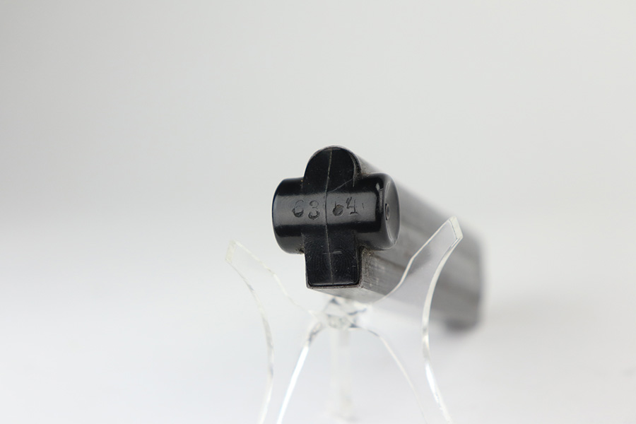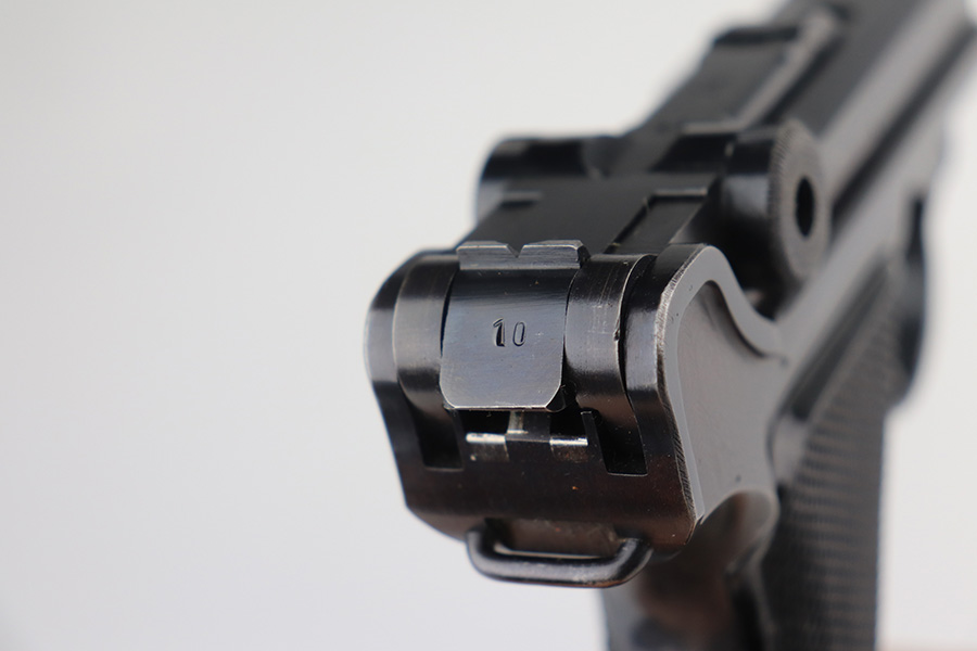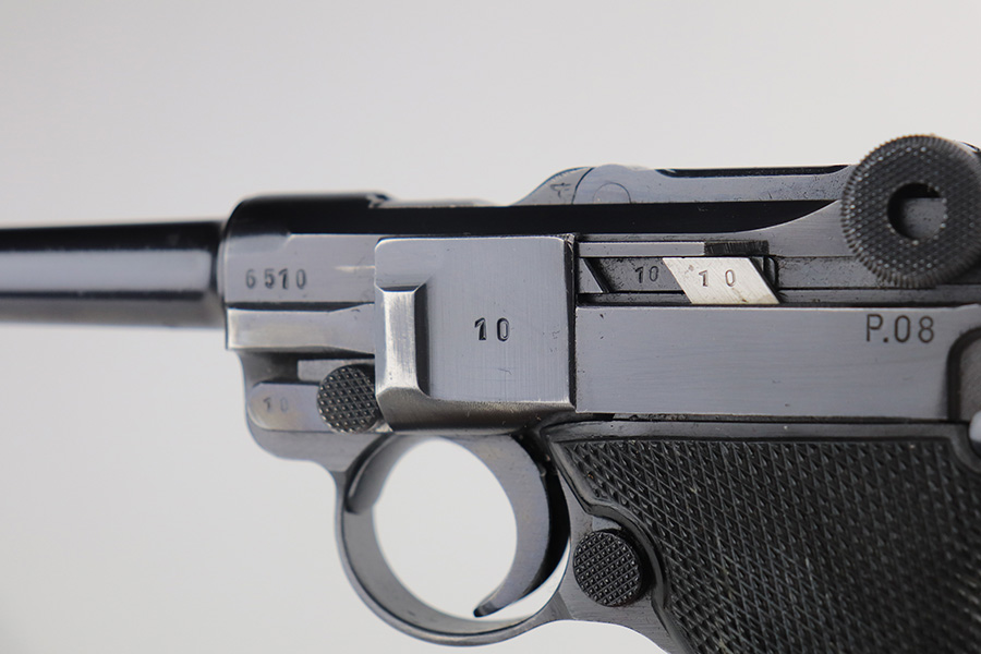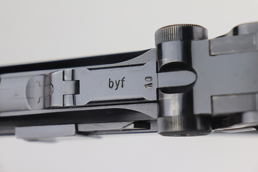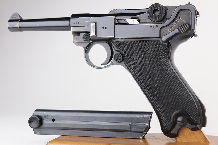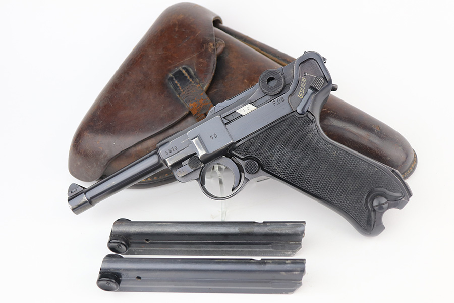 6/22/21 – This is an excellent example of a “Black Widow” Mauser Luger issued to the Nazi military in 1942. The gun is all matching and the proper “Eagle 135” military proofs. It comes with a nice 1941-dated waffen-proofed holster and two correct black widow magazines. One of the magazines is numbered on the bottom in the “ku” Luger style. The gun has retained about 96% of its bluing. There is minor wear on the side plate, side rails, and around the muzzle. A few spots of wear on the barrel. Minor thinning and pin-pricking on the straps. A small “H” scratched into the back strap. Comes with excellent black widow grips. The bore has strong rifling with freckling in the grooves.