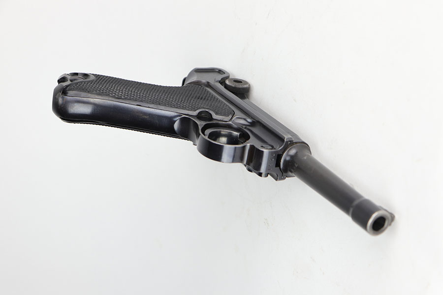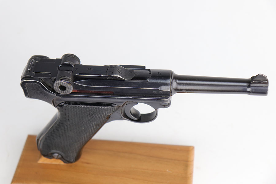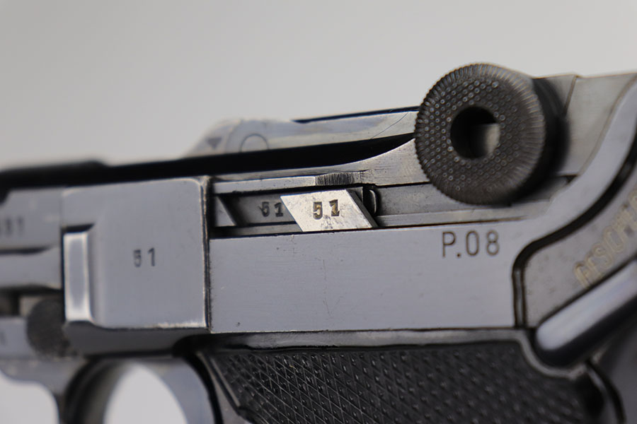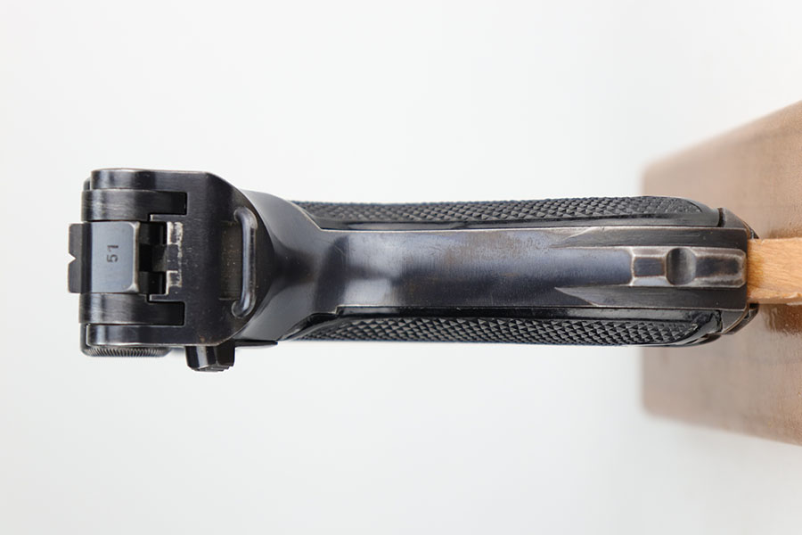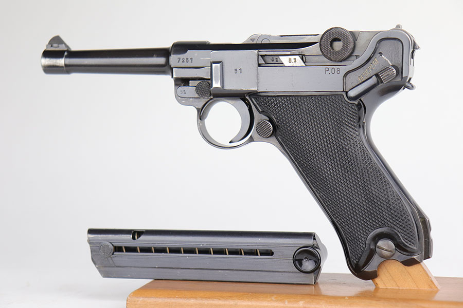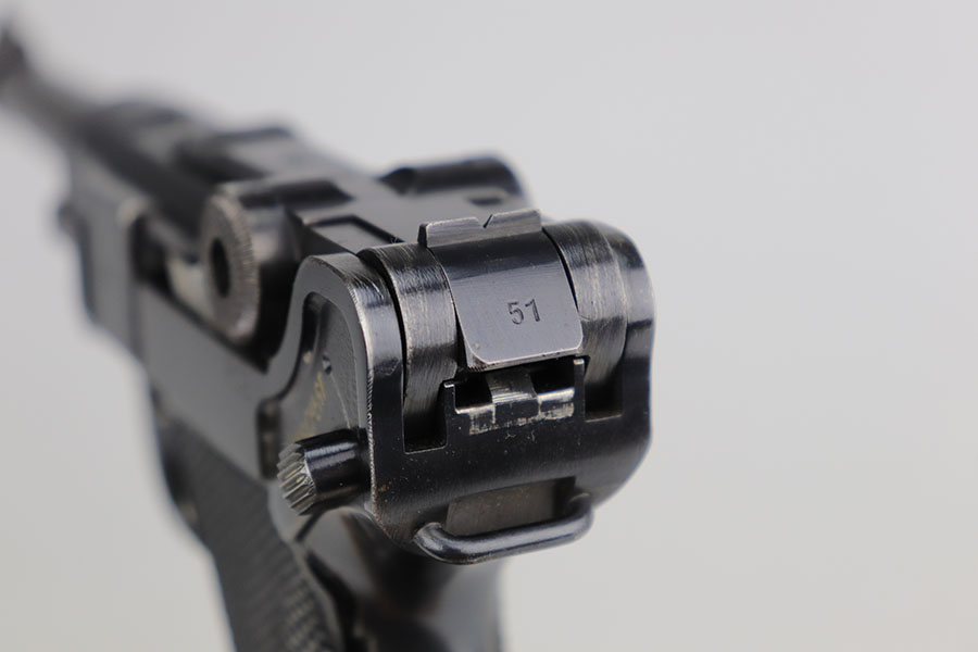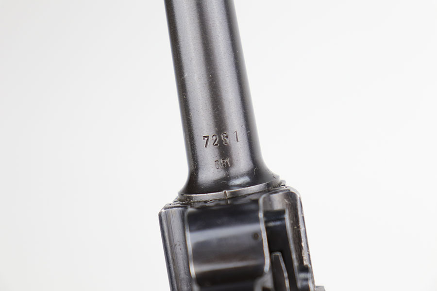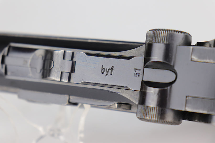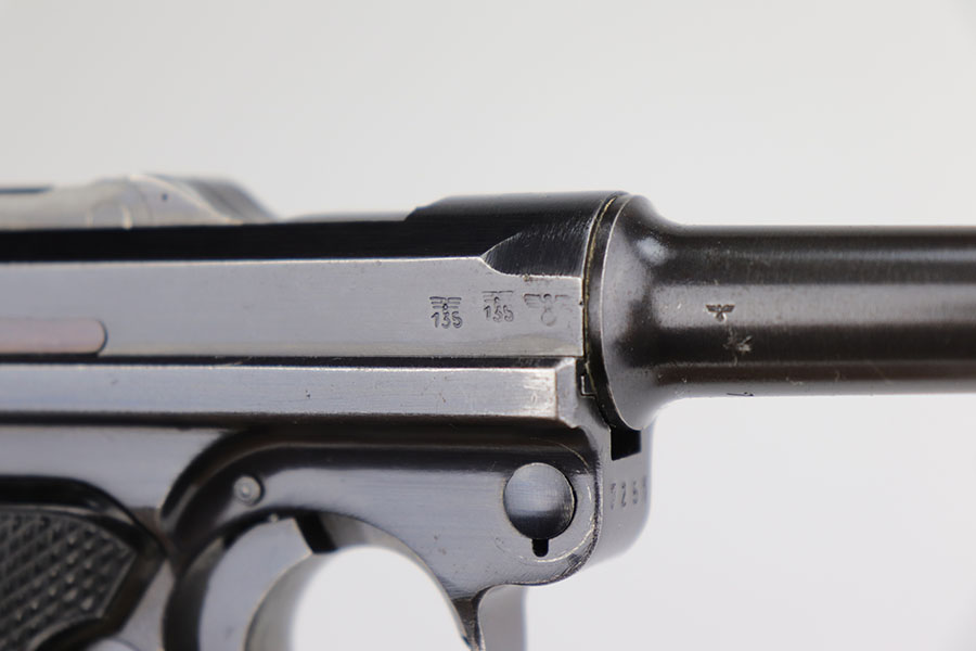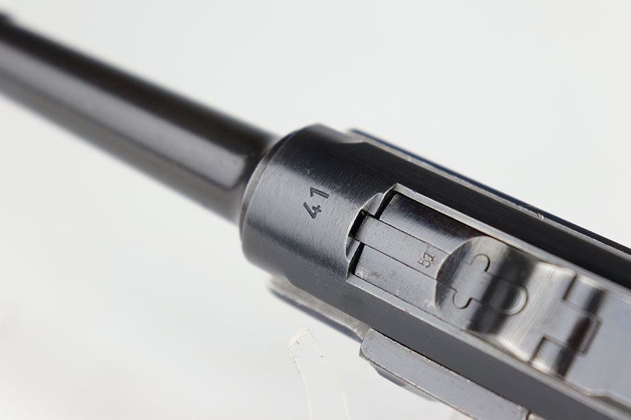 8/28/20 – This is an original Black Widow Mauser Luger, issued to the Nazi military in 1941. The toggle has the “byf” Mauser makers-mark and the chamber is dated 1941. The right side of the slide has the proper “Eagle 135” Nazi military acceptance proofs. The gun is all matching and in excellent condition, retaining about 95-96% of its original bluing. There is minor muzzle wear and high edge wear on the side plate and both sides of the frame. Minor wear and freckling on the straps. Minor wear on the toggle. It comes with excellent original grips and an excellent magazine. The bore is shiny with strong rifling with minor freckling here and there.
