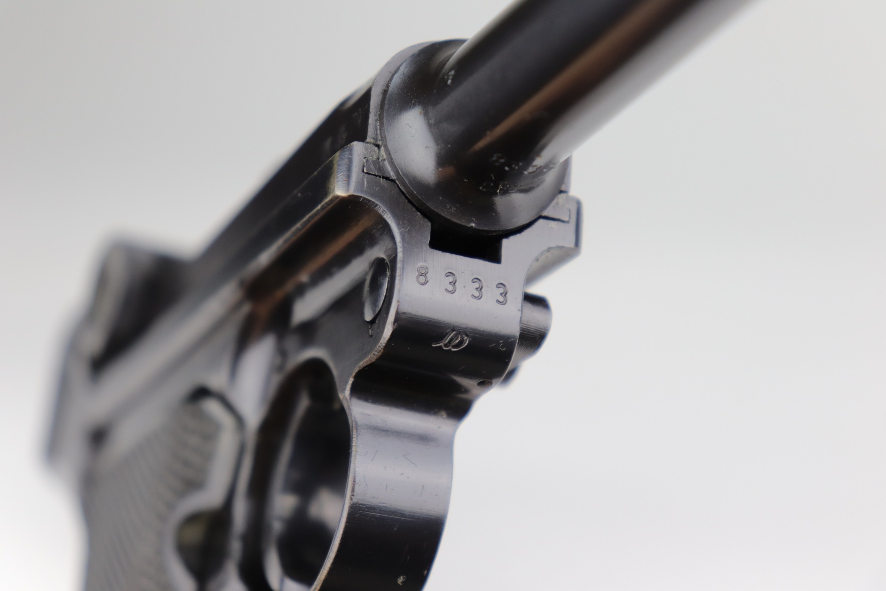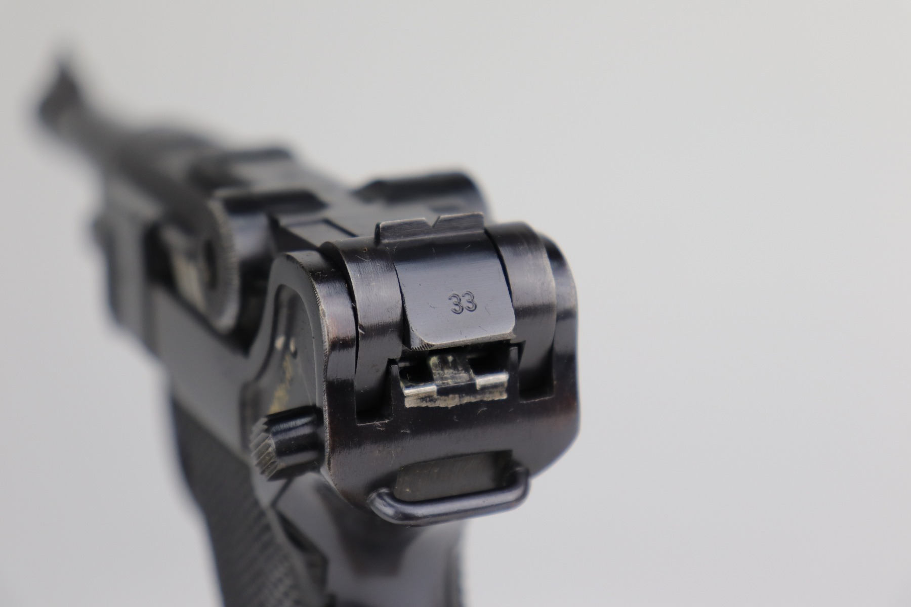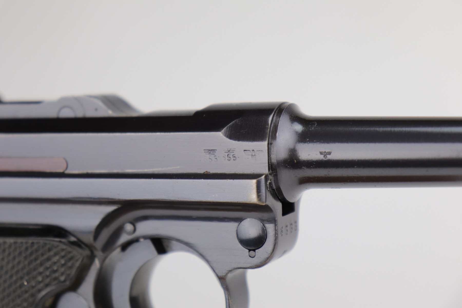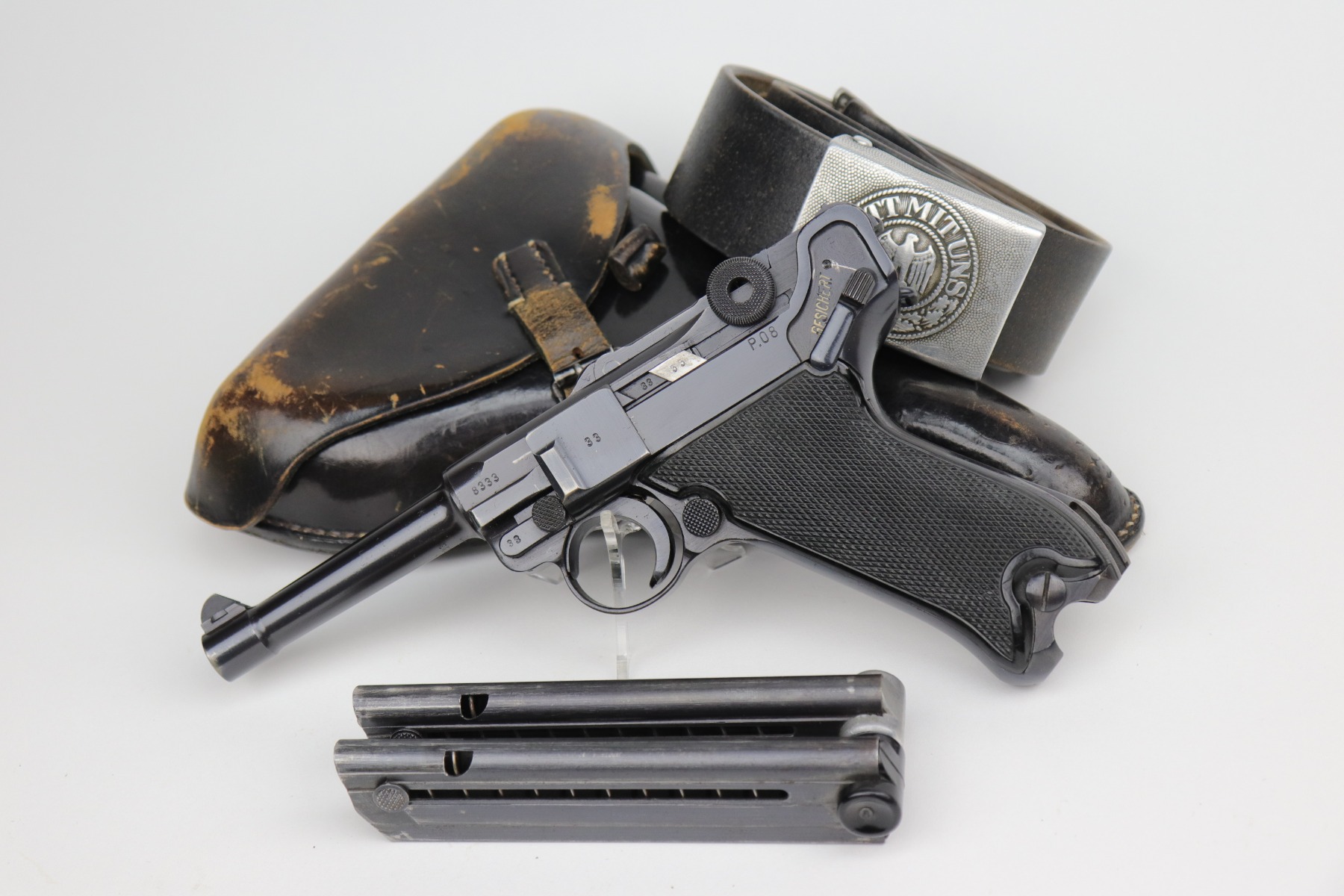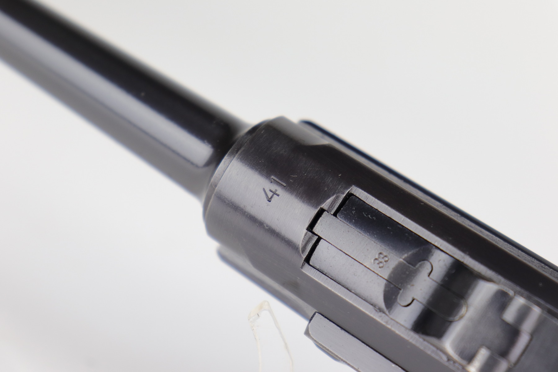 10/8/20 – This is an excellent example of a “Black Widow” Luger issued to the Nazi military in 1941. The rig comes with a 1941-dated holster, an original Belt and “Gott Mit Uns” buckle, a black widow magazine, and one mismatched period-correct aluminum-bottom luger magazine. The gun is all matching and has the proper “Eagle 655” Nazi military acceptance proofs. It is excellent, having retained between 97-98% of its original bluing. There is very minor wear around the muzzle, on the side plate, and at the very bottom of both straps. There is minor freckling on the straps. The grips are original and excellent. The bore is near-mint. The holster is very nice, but it has scuffing throughout.