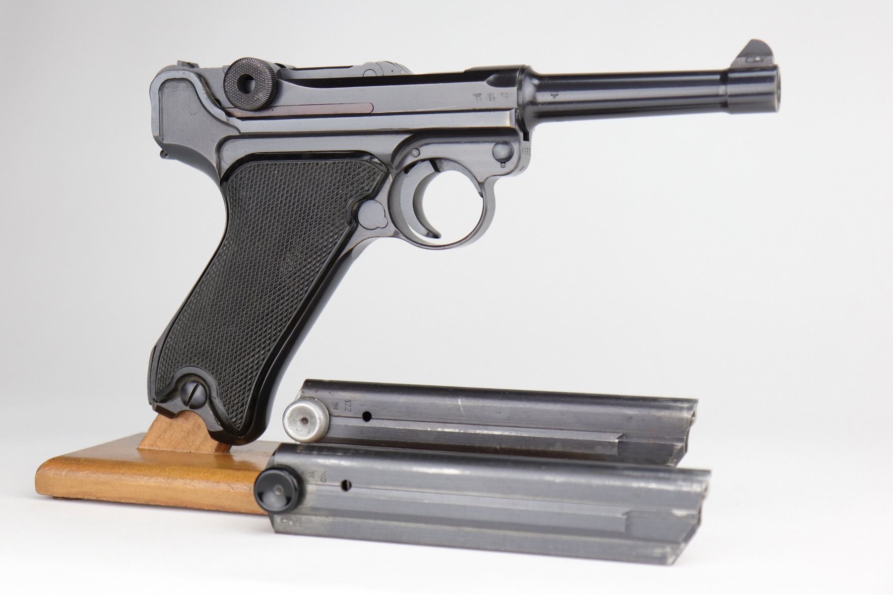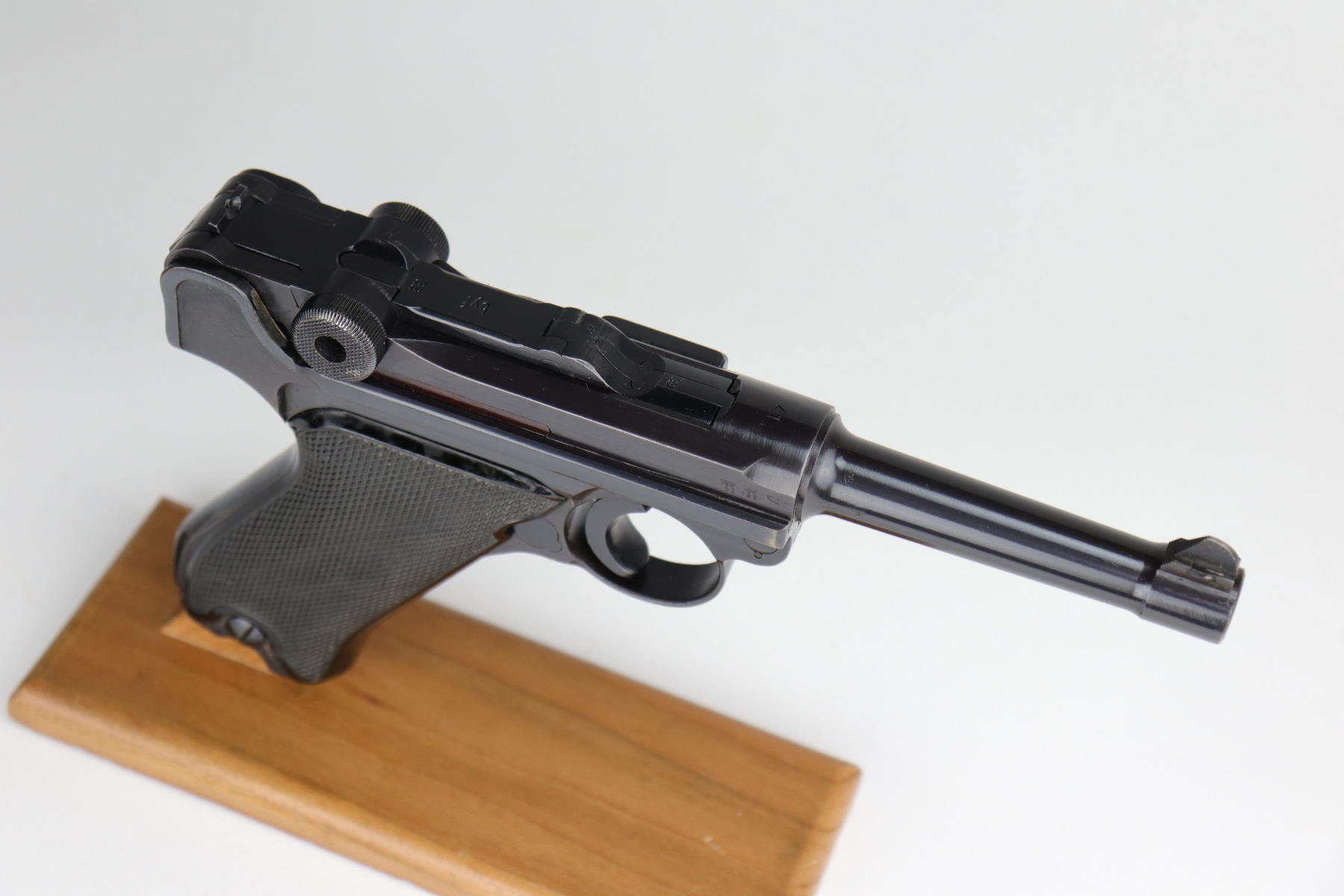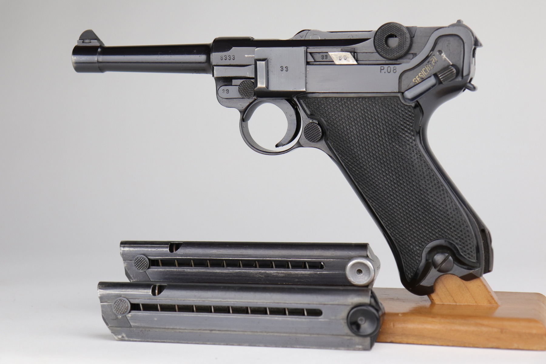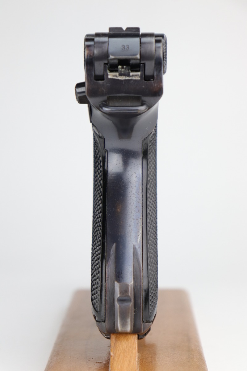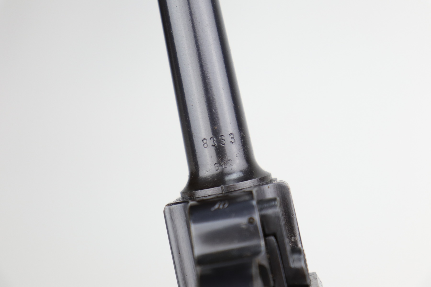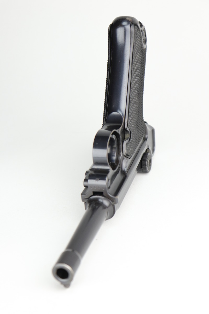 10/8/20 – This is an excellent example of a “Black Widow” Luger issued to the Nazi military in 1941. The rig comes with a 1941-dated holster, an original Belt and “Gott Mit Uns” buckle, a black widow magazine, and one mismatched period-correct aluminum-bottom luger magazine. The gun is all matching and has the proper “Eagle 655” Nazi military acceptance proofs. It is excellent, having retained between 97-98% of its original bluing. There is very minor wear around the muzzle, on the side plate, and at the very bottom of both straps. There is minor freckling on the straps. The grips are original and excellent. The bore is near-mint. The holster is very nice, but it has scuffing throughout.