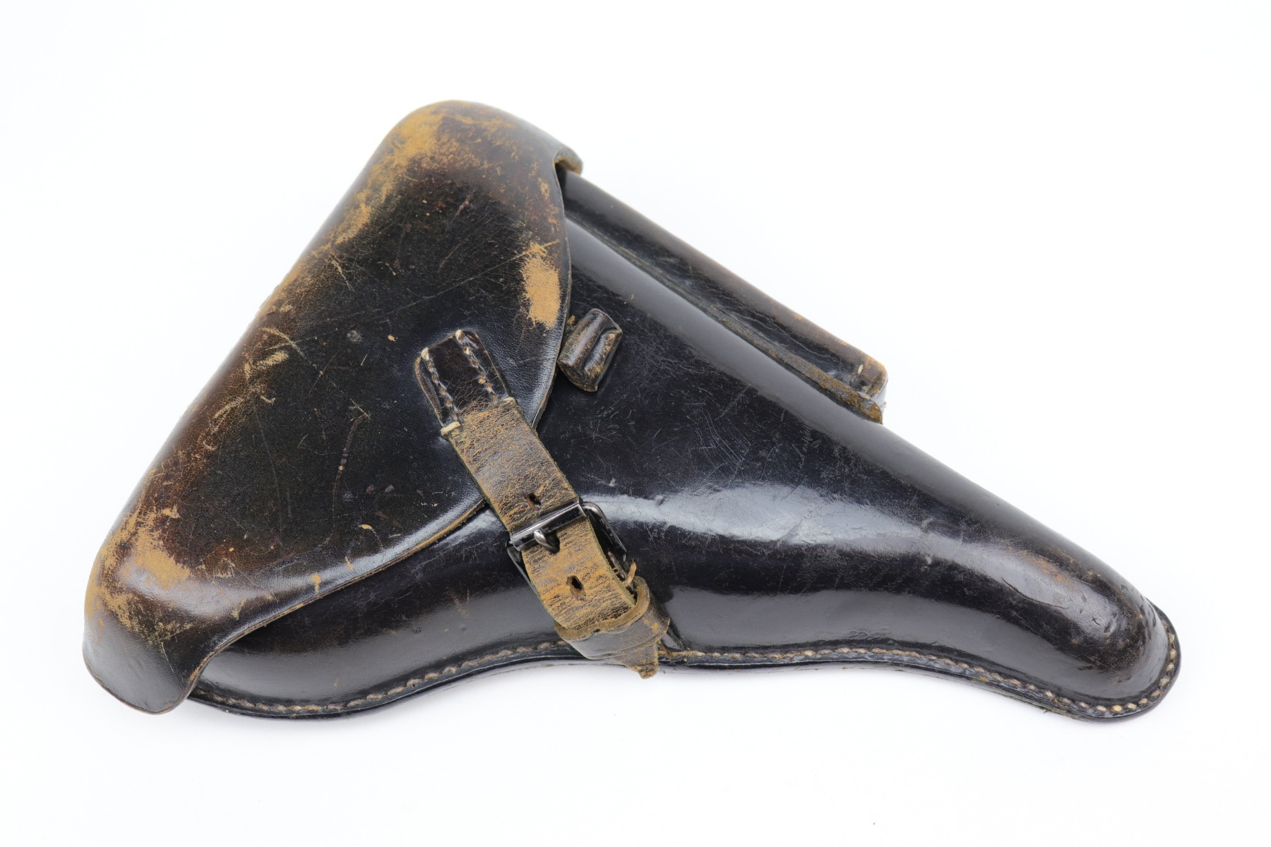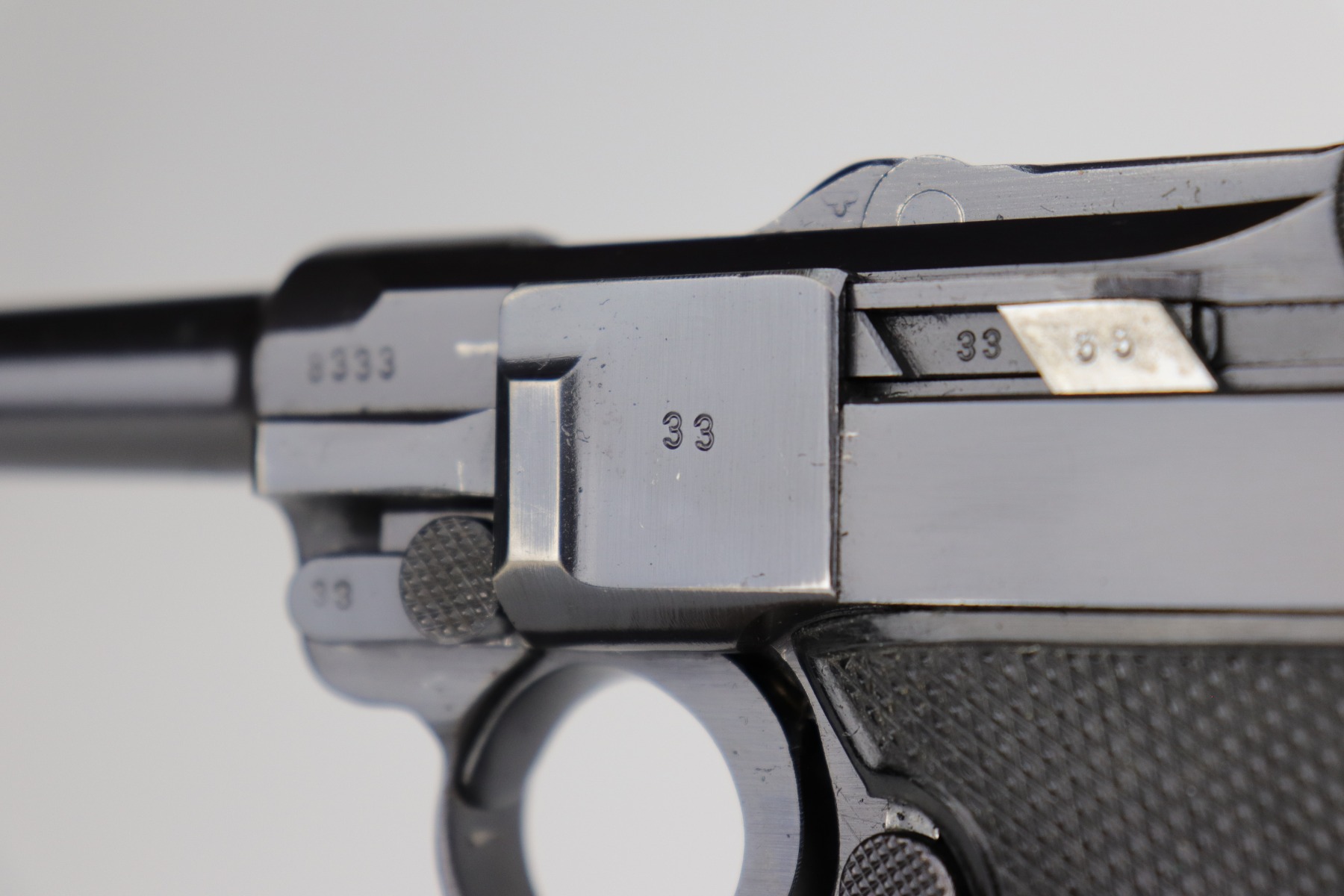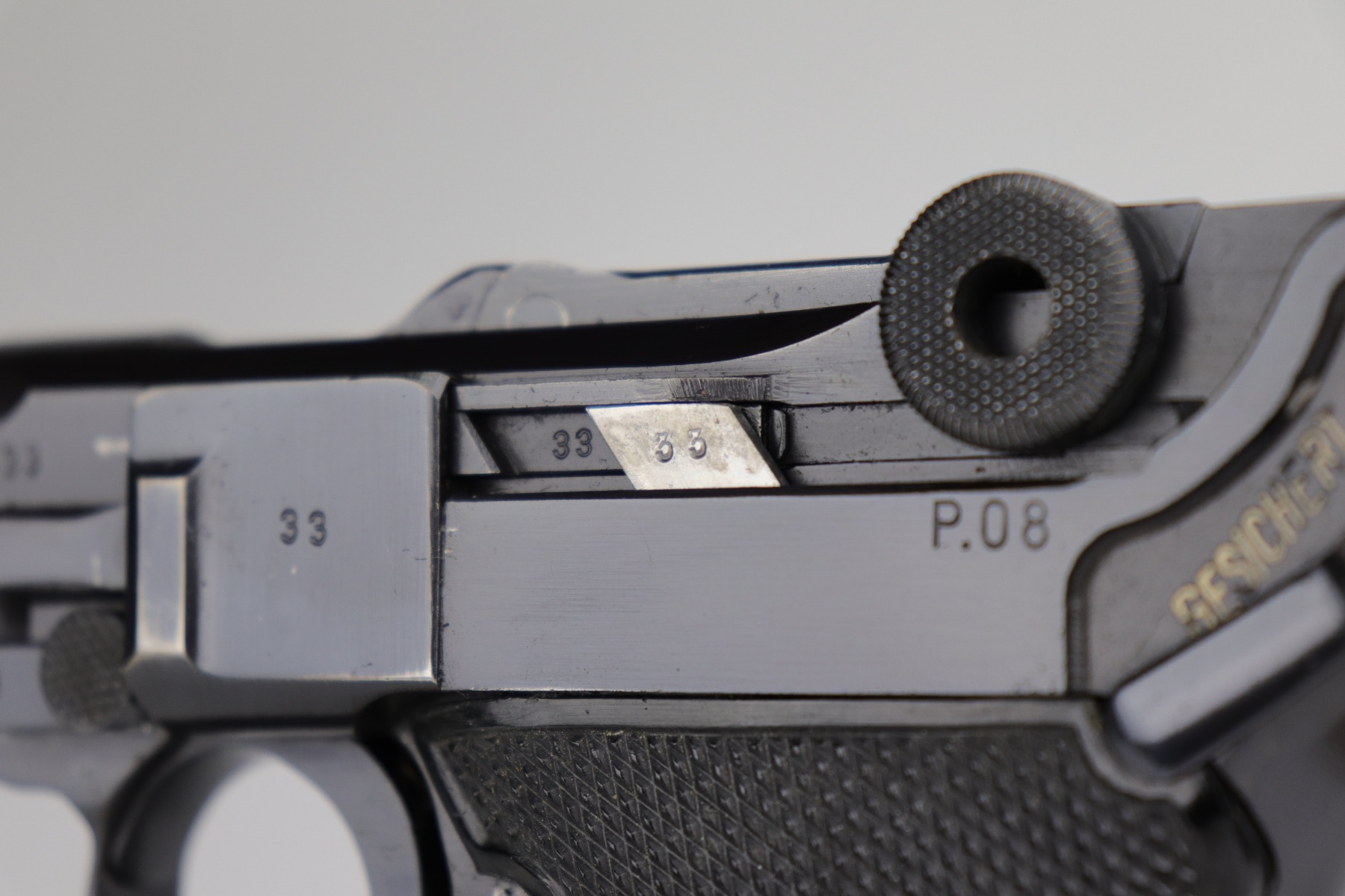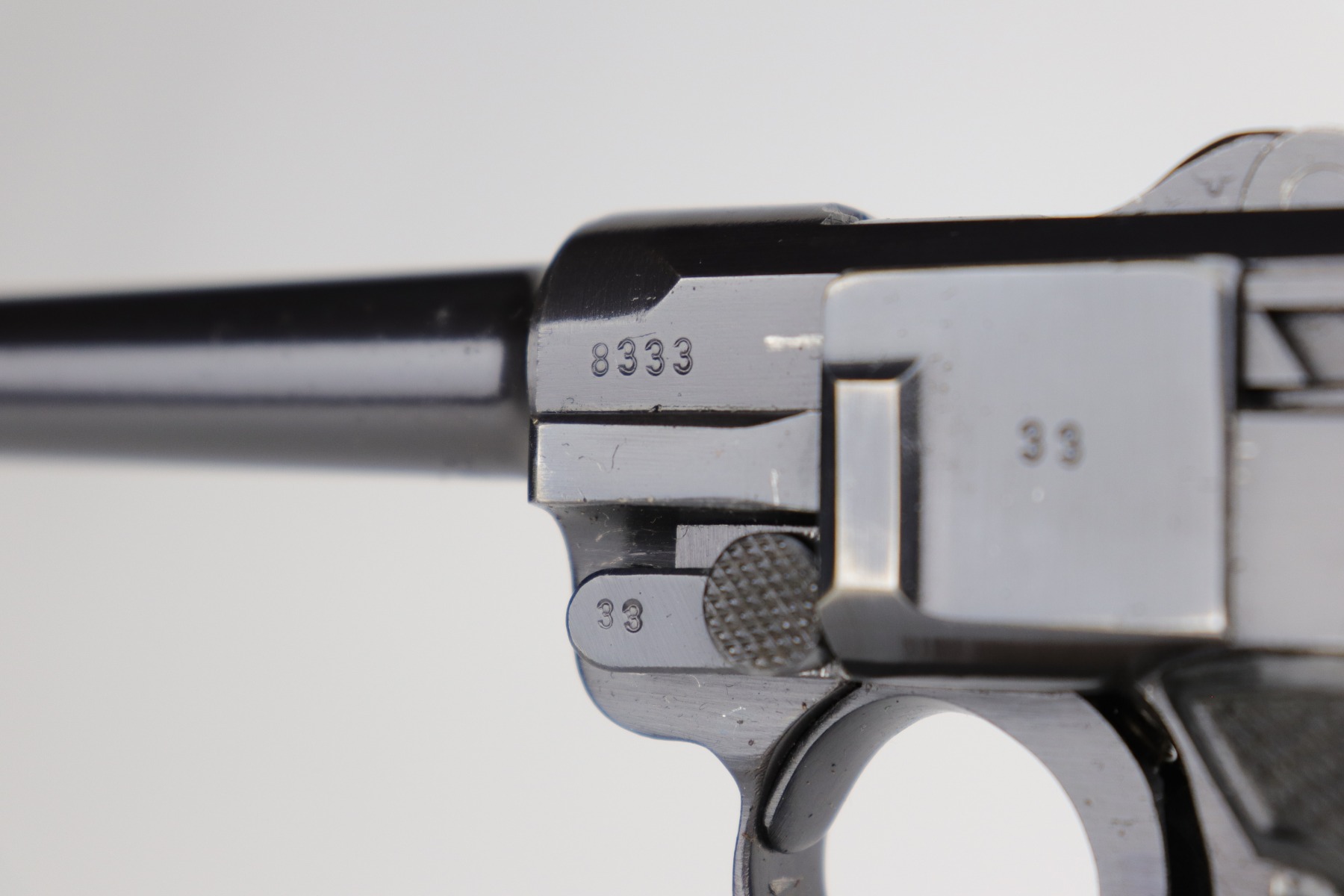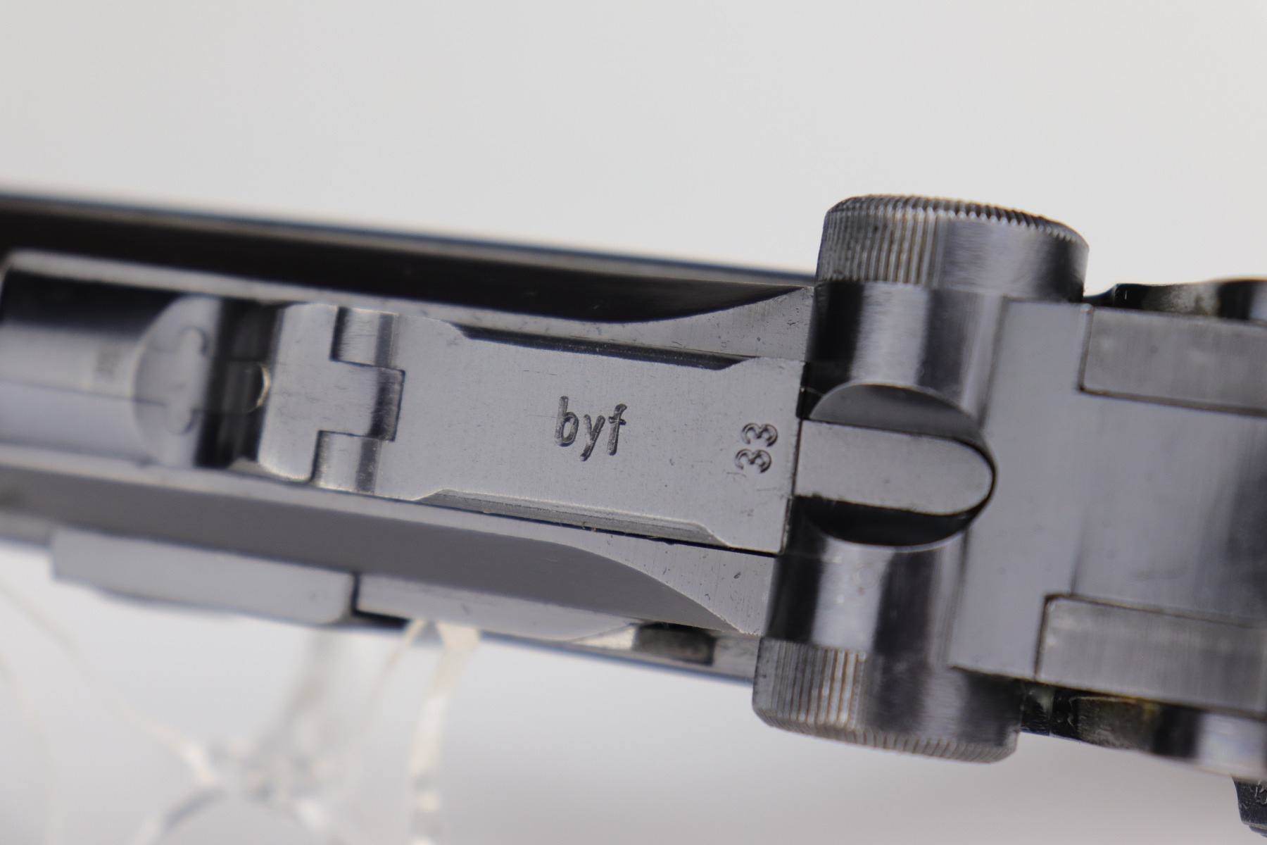 10/8/20 – This is an excellent example of a “Black Widow” Luger issued to the Nazi military in 1941. The rig comes with a 1941-dated holster, an original Belt and “Gott Mit Uns” buckle, a black widow magazine, and one mismatched period-correct aluminum-bottom luger magazine. The gun is all matching and has the proper “Eagle 655” Nazi military acceptance proofs. It is excellent, having retained between 97-98% of its original bluing. There is very minor wear around the muzzle, on the side plate, and at the very bottom of both straps. There is minor freckling on the straps. The grips are original and excellent. The bore is near-mint. The holster is very nice, but it has scuffing throughout.