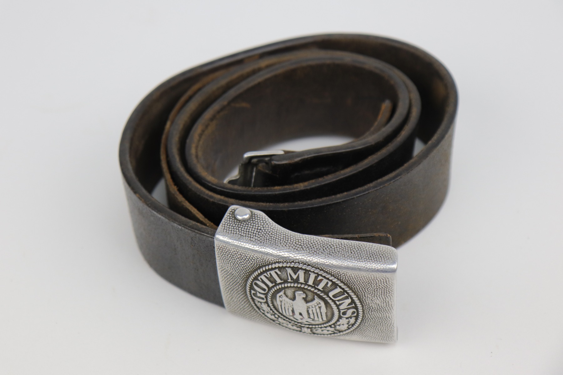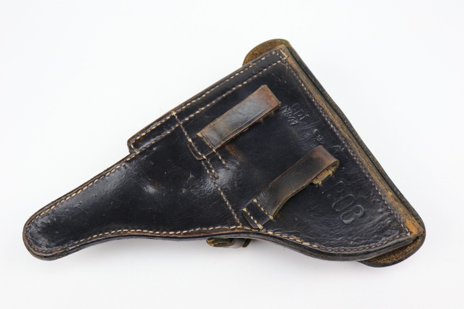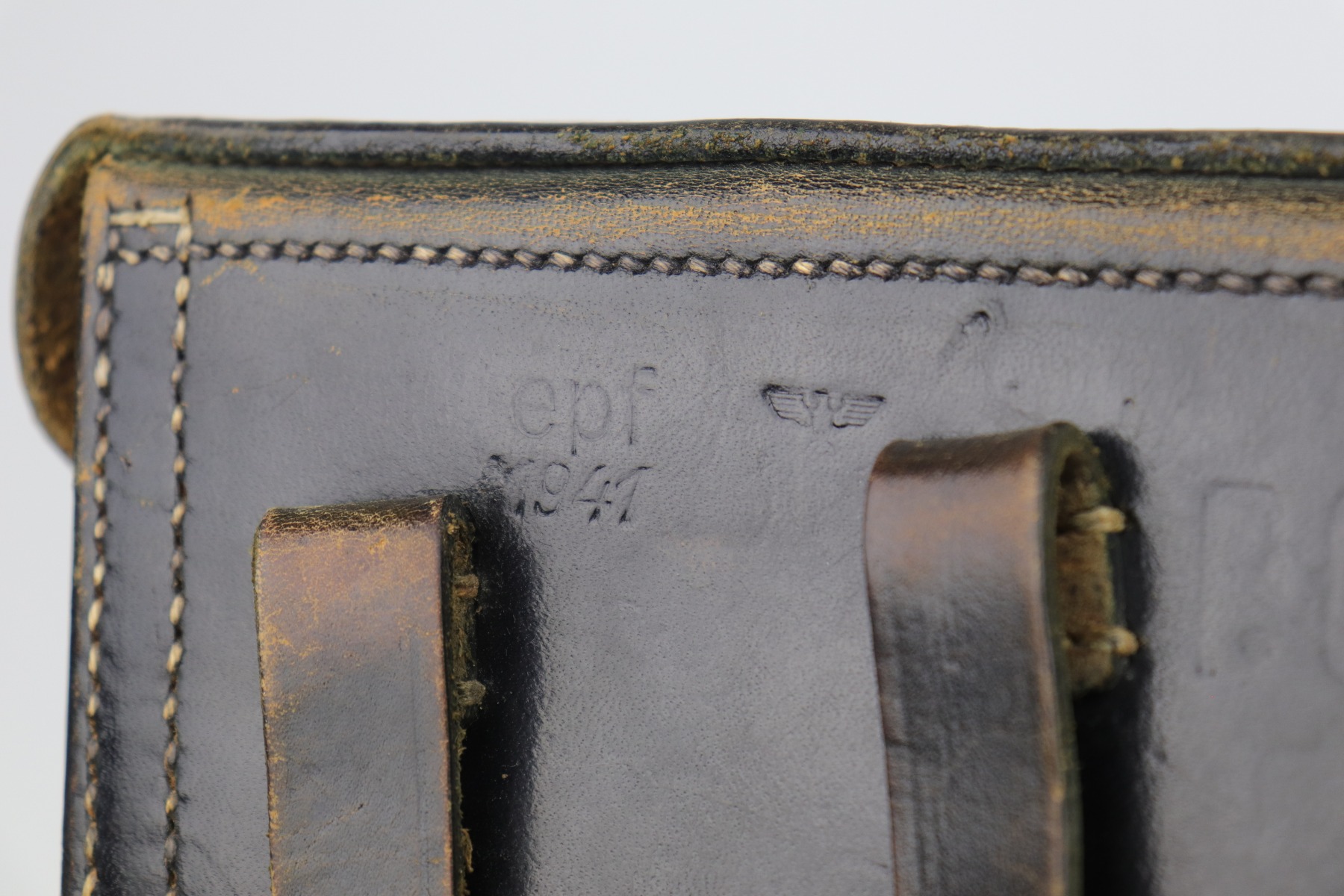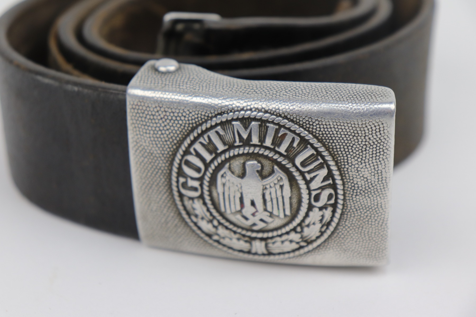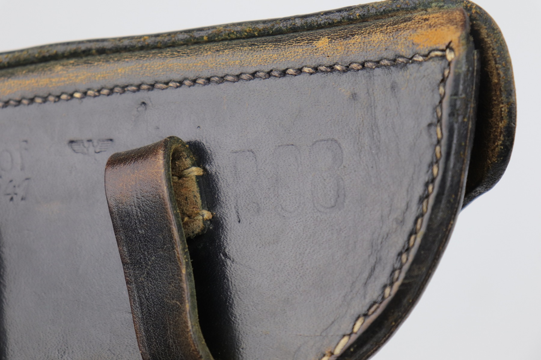 10/8/20 – This is an excellent example of a “Black Widow” Luger issued to the Nazi military in 1941. The rig comes with a 1941-dated holster, an original Belt and “Gott Mit Uns” buckle, a black widow magazine, and one mismatched period-correct aluminum-bottom luger magazine. The gun is all matching and has the proper “Eagle 655” Nazi military acceptance proofs. It is excellent, having retained between 97-98% of its original bluing. There is very minor wear around the muzzle, on the side plate, and at the very bottom of both straps. There is minor freckling on the straps. The grips are original and excellent. The bore is near-mint. The holster is very nice, but it has scuffing throughout.