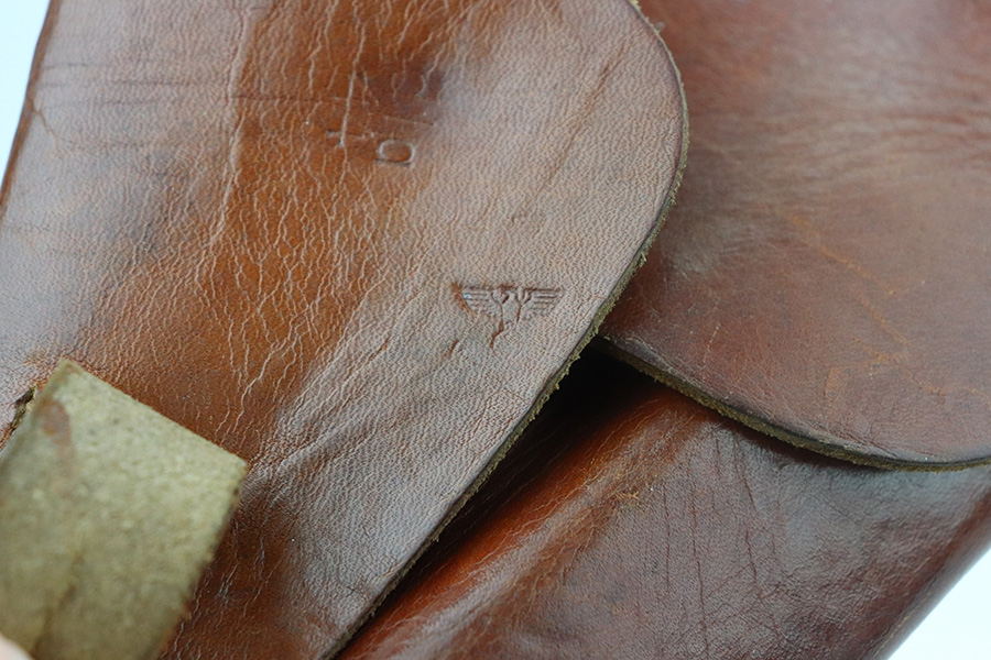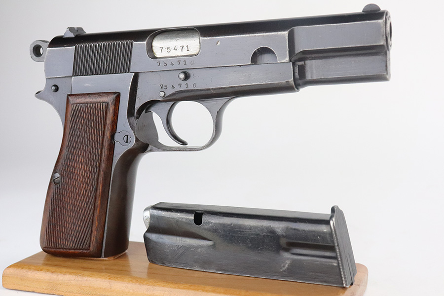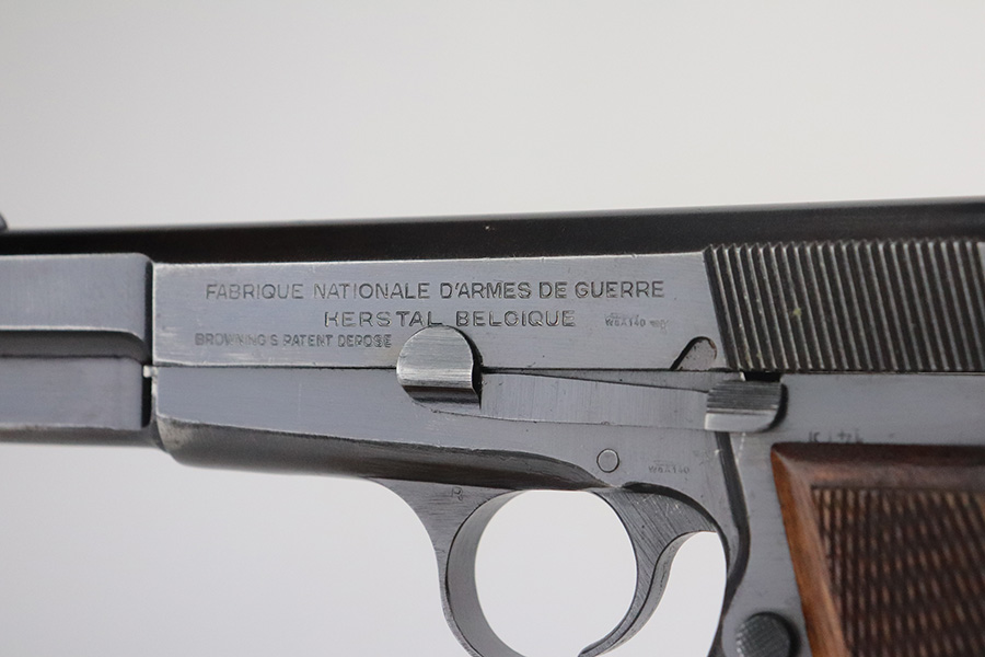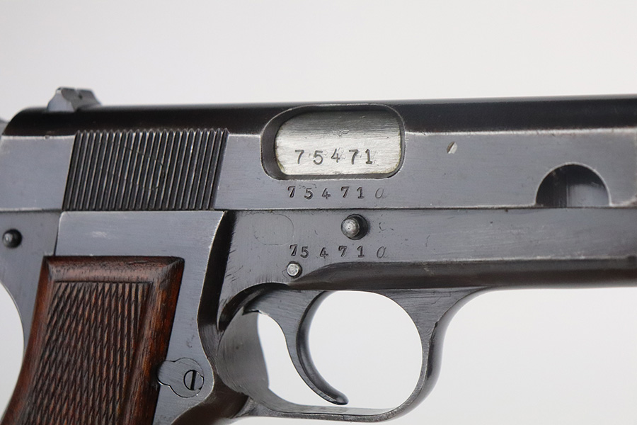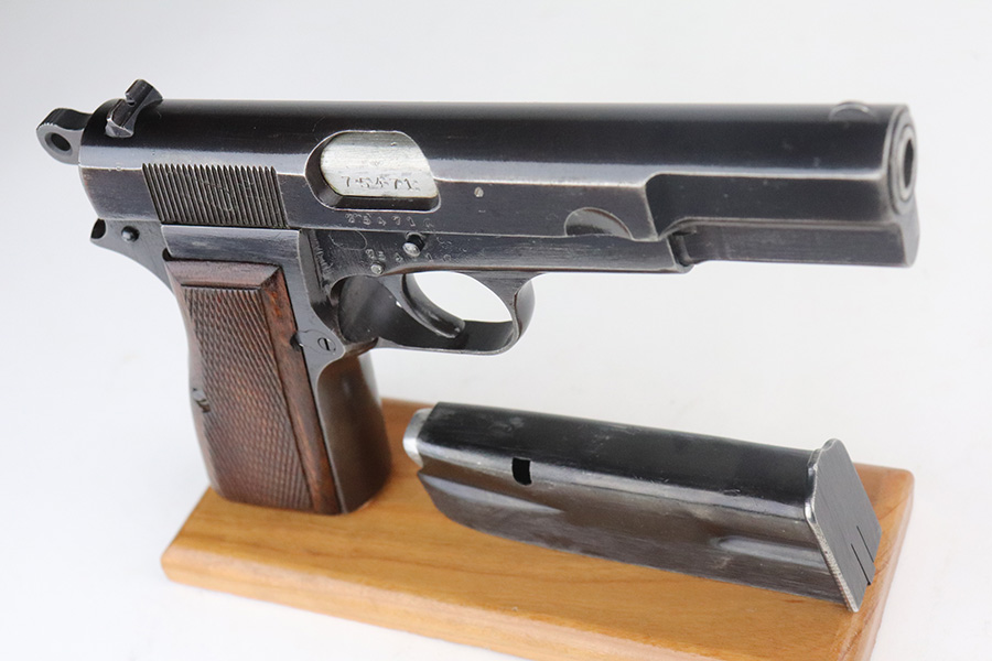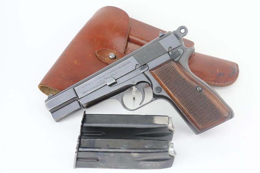 7/13/21 – This is an excellent example of an FN Browning Hi Power rig issued to the Nazi military during WW2. The gun is all matching and has the proper “Waffen 140” military proofs. The rig comes with an excellent 1944-dated waffen-proofed holster, one period-correct magazine (no waffen proof), and a post-WW2 magazine. The gun has retained about 95% of its original finish. There is minor wear on the high edges of the slide and around the muzzle. Very minor thinning and brown patina on the straps. A few tiny dings here and there along the slide. Excellent wood grips. Excellent bore – shiny with strong rifling.