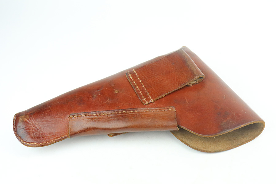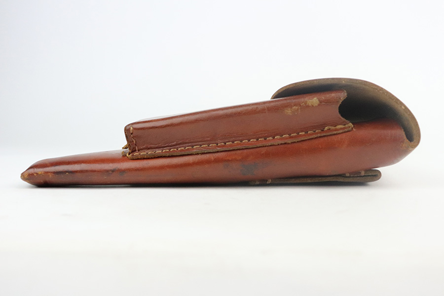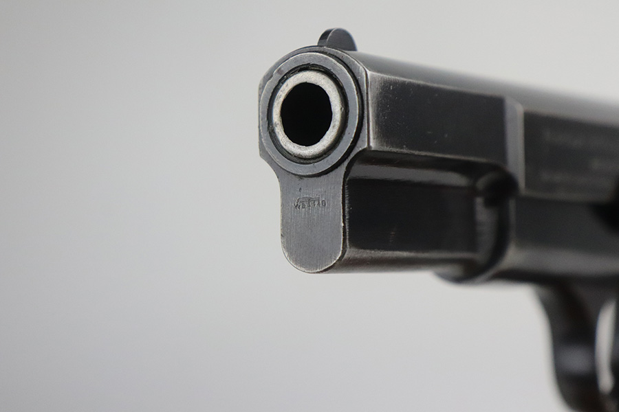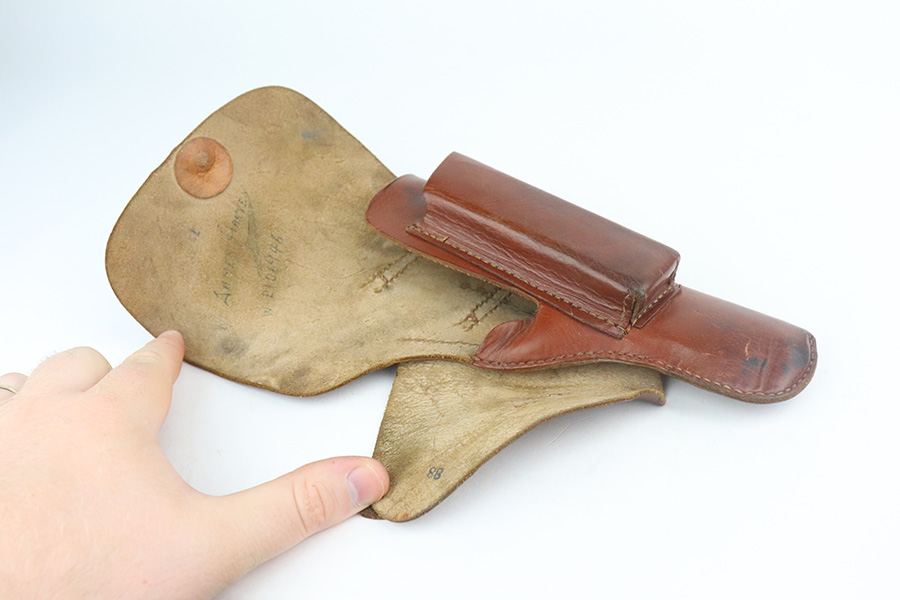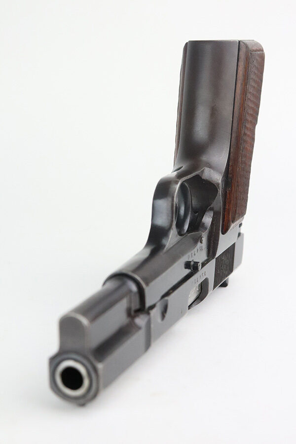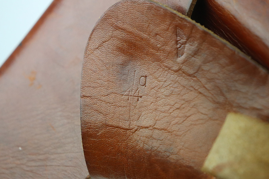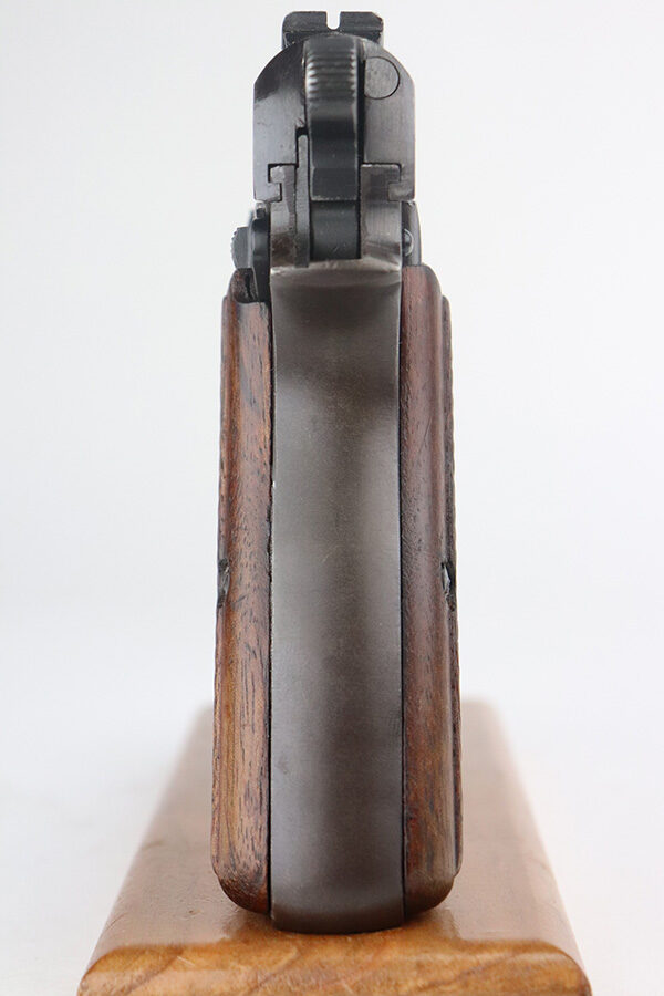 7/13/21 – This is an excellent example of an FN Browning Hi Power rig issued to the Nazi military during WW2. The gun is all matching and has the proper “Waffen 140” military proofs. The rig comes with an excellent 1944-dated waffen-proofed holster, one period-correct magazine (no waffen proof), and a post-WW2 magazine. The gun has retained about 95% of its original finish. There is minor wear on the high edges of the slide and around the muzzle. Very minor thinning and brown patina on the straps. A few tiny dings here and there along the slide. Excellent wood grips. Excellent bore – shiny with strong rifling.