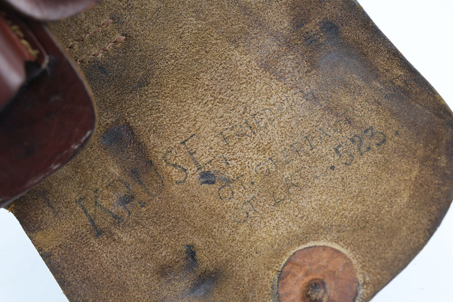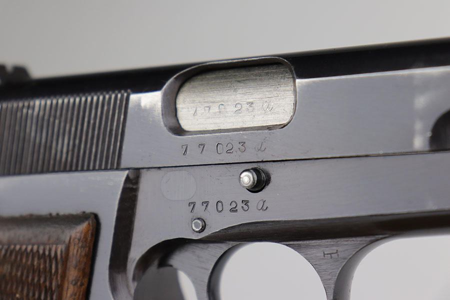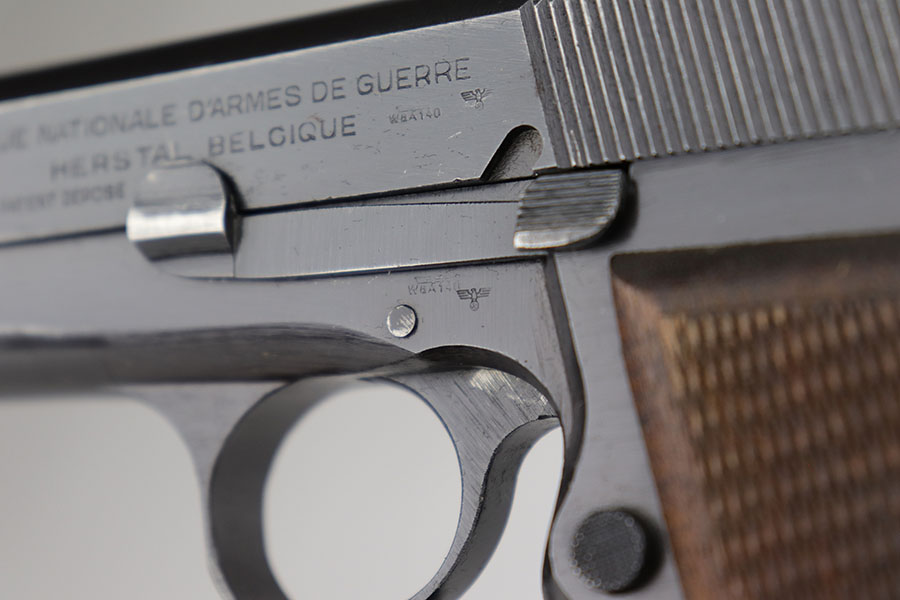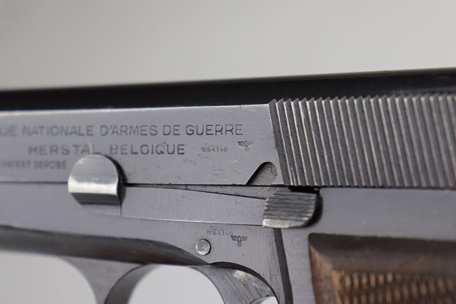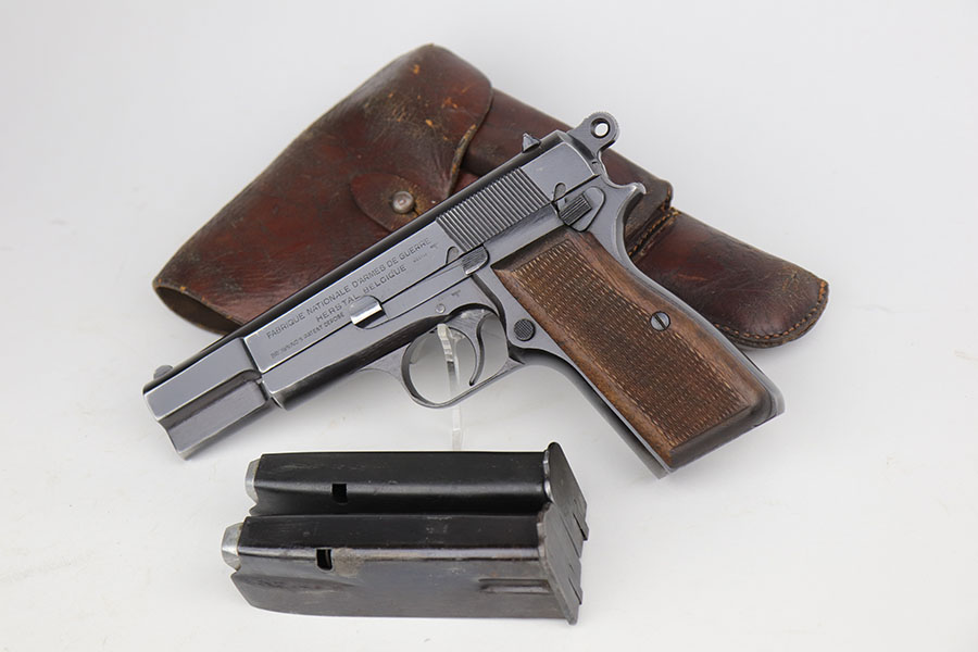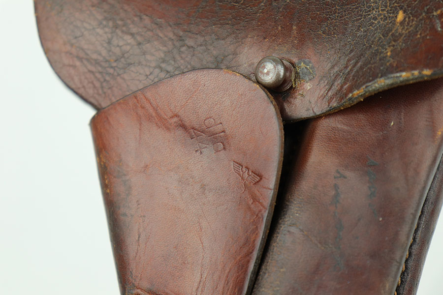 8/11/20 – This is a complete and a very nice FN Browning High Power rig that was issued to the German Army. It has about 93-94% blue with areas of wear on the front strap, trigger guard, bottom of back strap and middle right side of slide. Excellent bore and grips. WaA140 proofs on slide, frame and one of the magazines. Holster is ’44 dated and ‘dla’ marked with sharp waffenamt. It’s got some obvious cracking on both sides, and GIs name written inside.