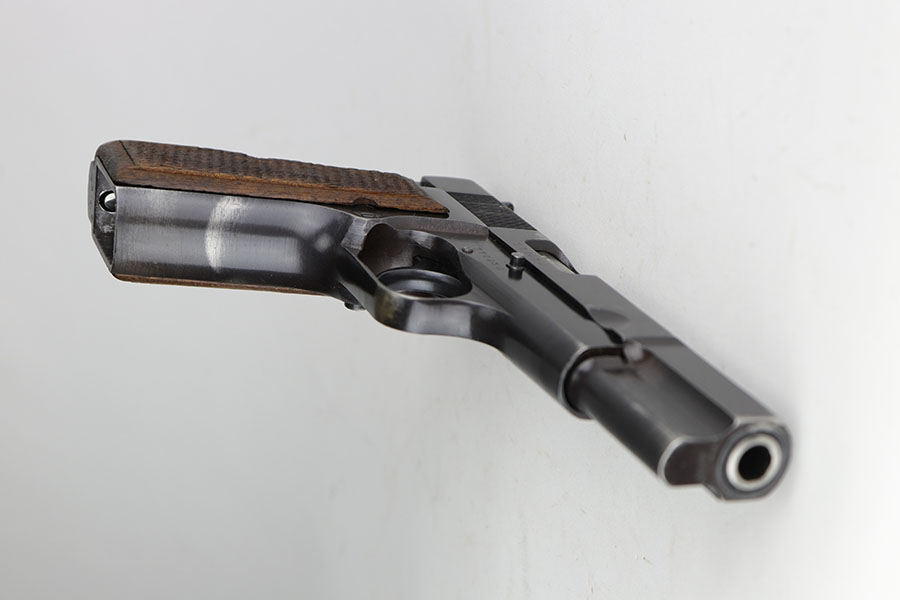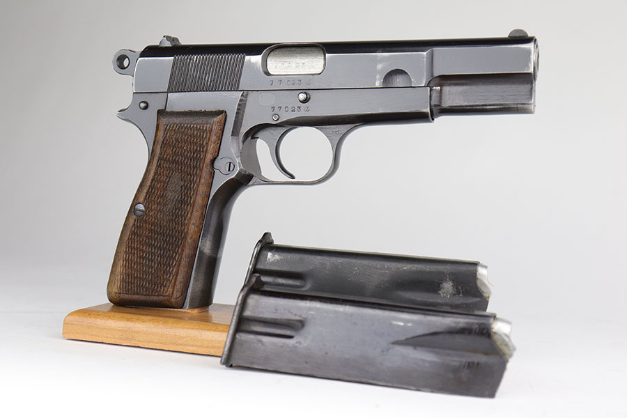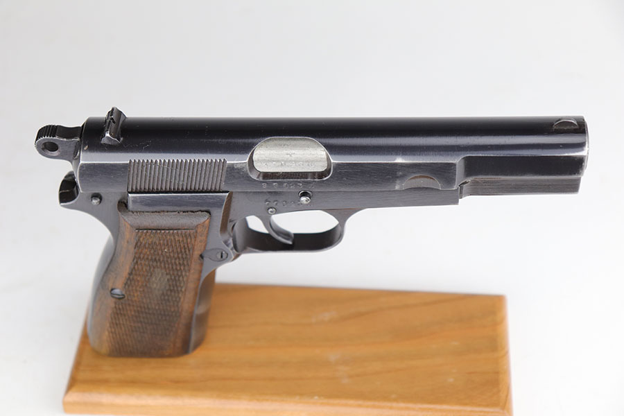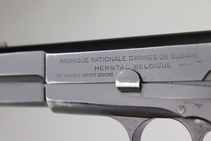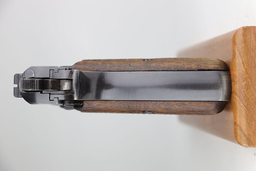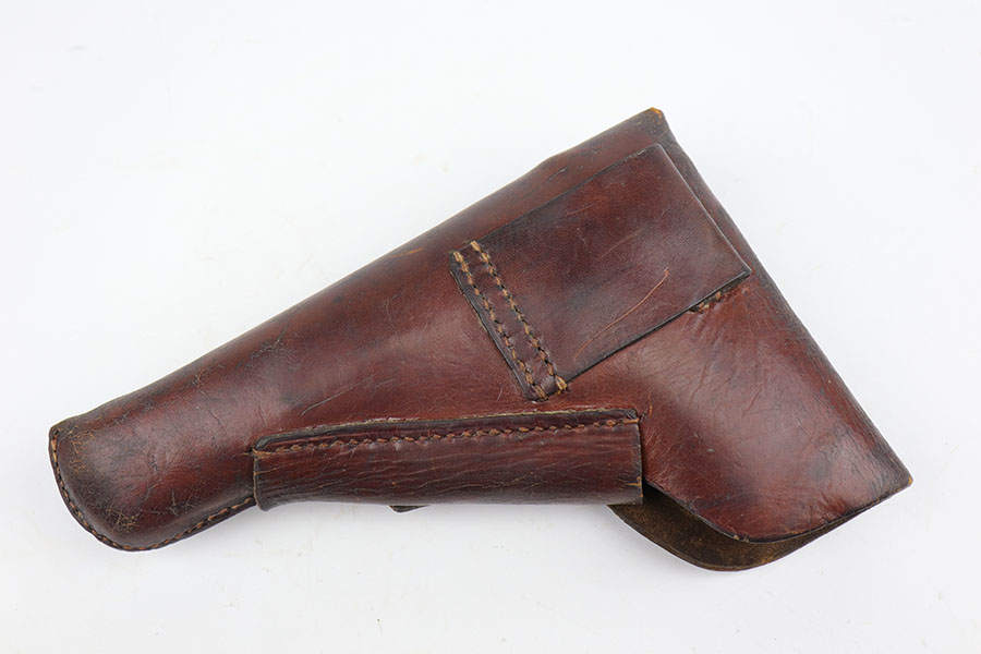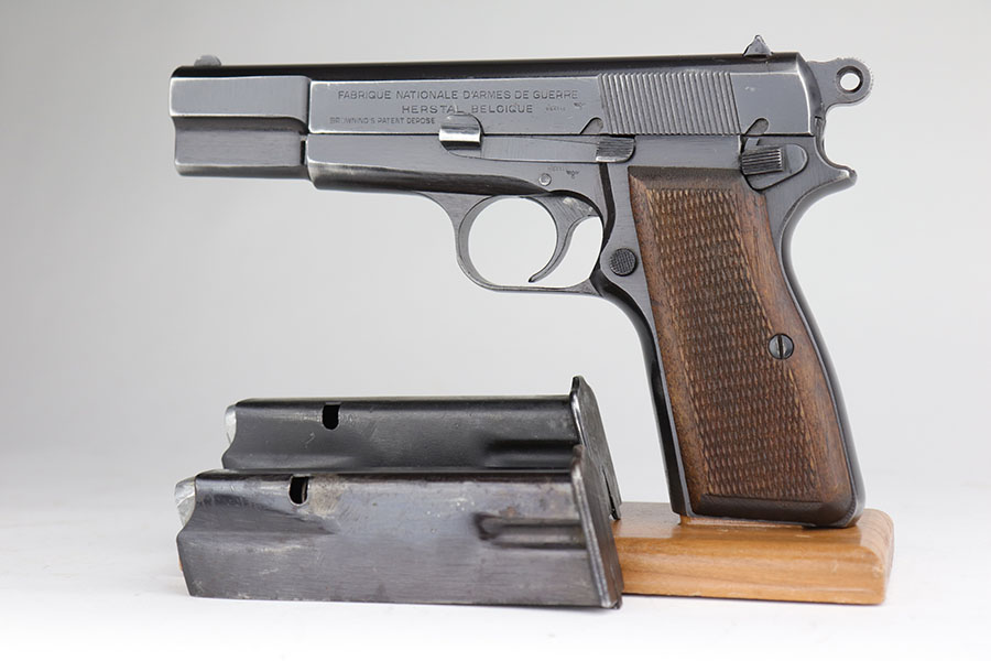 8/11/20 – This is a complete and a very nice FN Browning High Power rig that was issued to the German Army. It has about 93-94% blue with areas of wear on the front strap, trigger guard, bottom of back strap and middle right side of slide. Excellent bore and grips. WaA140 proofs on slide, frame and one of the magazines. Holster is ’44 dated and ‘dla’ marked with sharp waffenamt. It’s got some obvious cracking on both sides, and GIs name written inside.