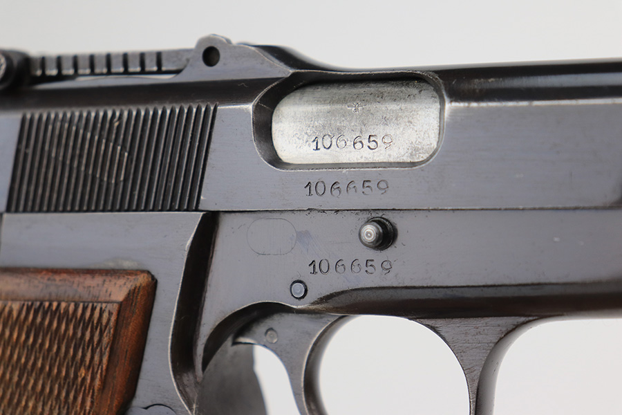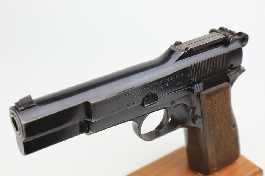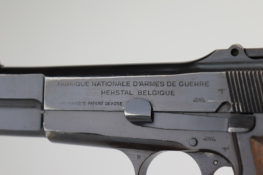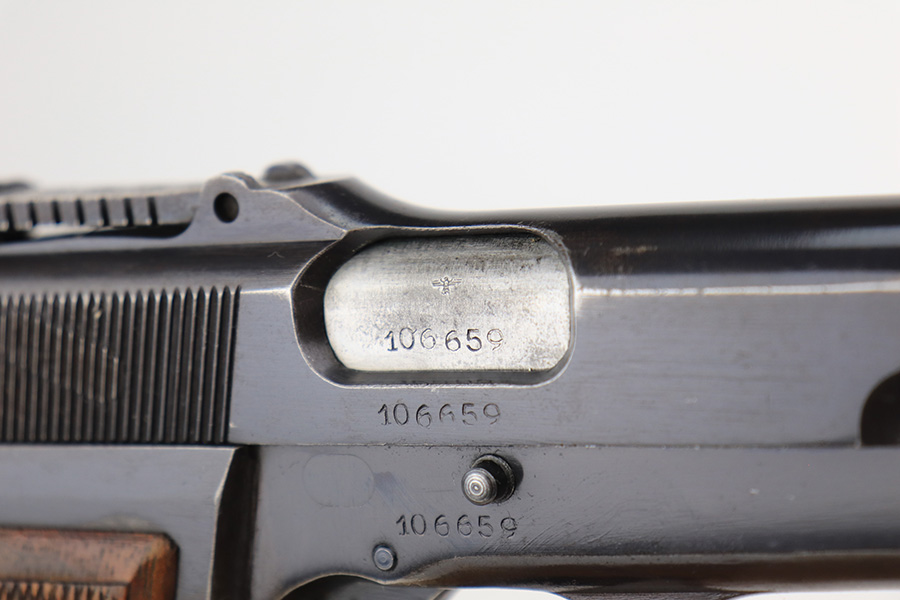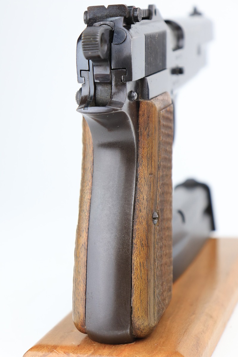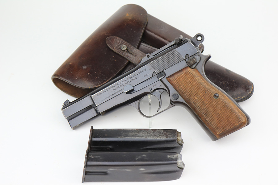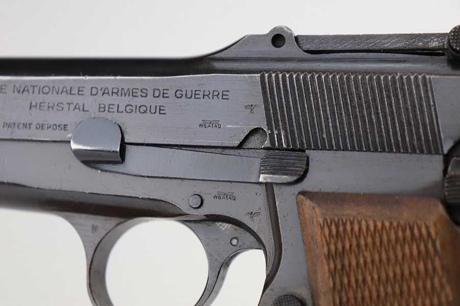 5/23/22 – This is an excellent example of an FN Browning Hi Power issued to the Nazi military during WW2. It is all matching and has the proper “Waffen 140” Nazi military acceptance proofs. This one is of the earlier variation with the adjustable tangent rear sight. It comes as a rig with an excellent 1942-dated holster, one “Waffen 140” proofed magazine, and one un-marked magazine. The gun has retained about 96% of its original finish. There is minor wear around the muzzle and around the high edges of the slide. Some minor thinning and spotty brown patina on both grip straps. A couple of very light scratches on the left side of the slide. Comes with excellent period-correct wood grips. The bore has strong rifling with some areas of very minor freckling here and there.
