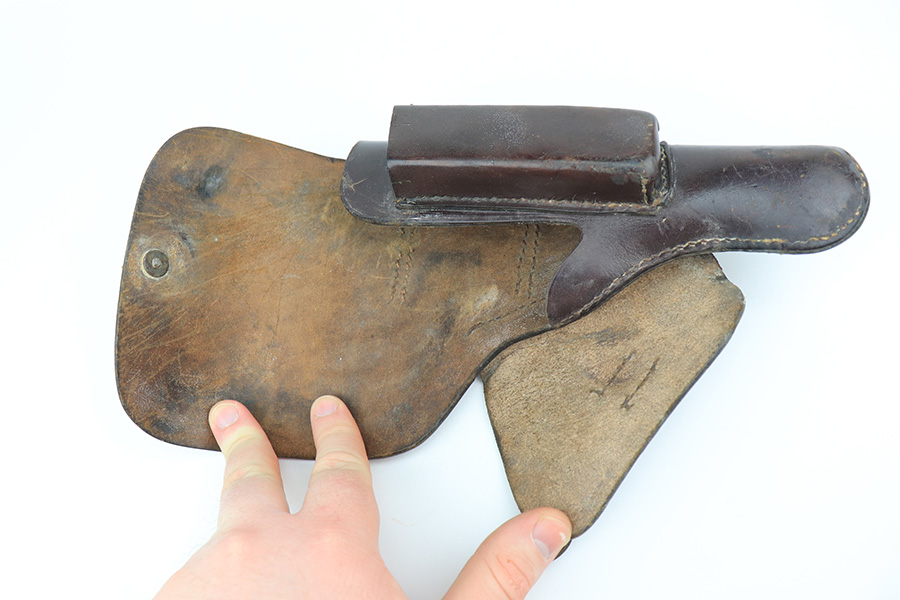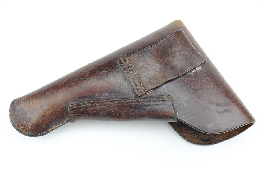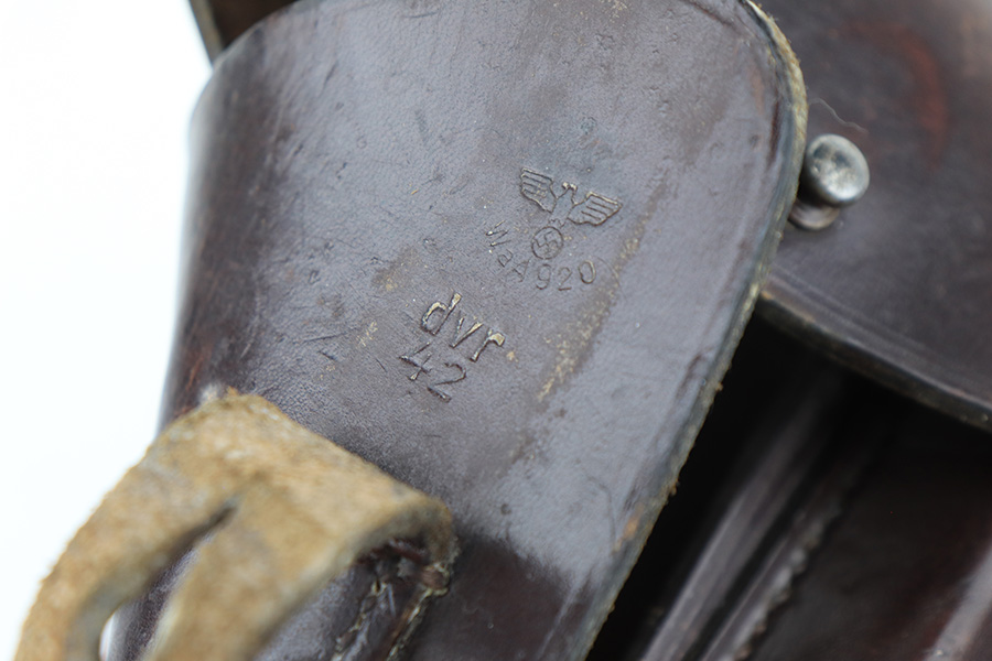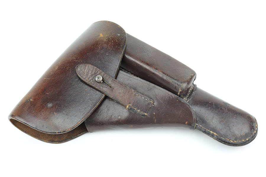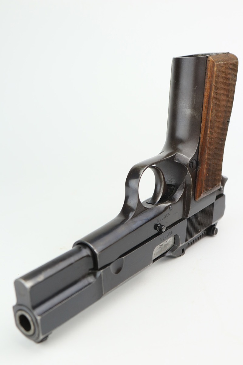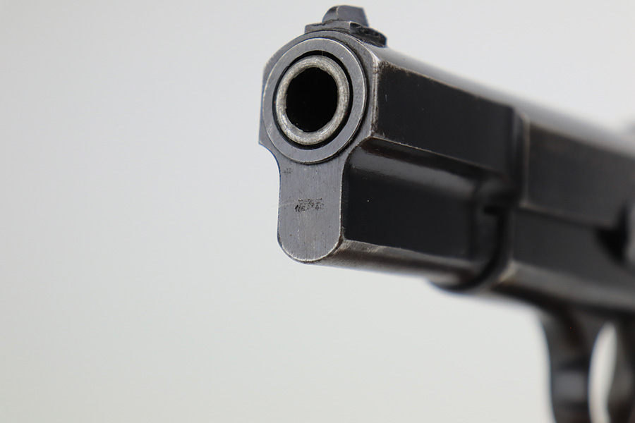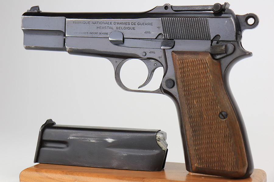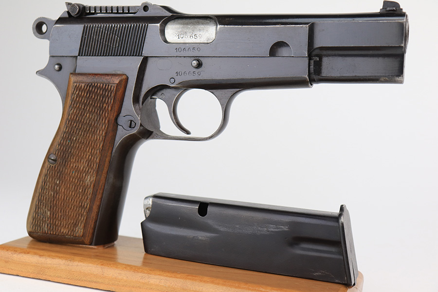 5/23/22 – This is an excellent example of an FN Browning Hi Power issued to the Nazi military during WW2. It is all matching and has the proper “Waffen 140” Nazi military acceptance proofs. This one is of the earlier variation with the adjustable tangent rear sight. It comes as a rig with an excellent 1942-dated holster, one “Waffen 140” proofed magazine, and one un-marked magazine. The gun has retained about 96% of its original finish. There is minor wear around the muzzle and around the high edges of the slide. Some minor thinning and spotty brown patina on both grip straps. A couple of very light scratches on the left side of the slide. Comes with excellent period-correct wood grips. The bore has strong rifling with some areas of very minor freckling here and there.