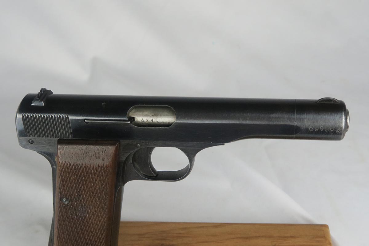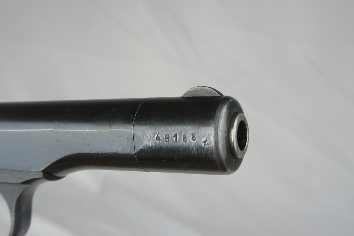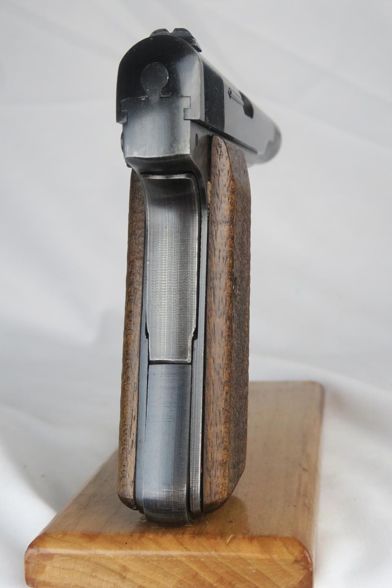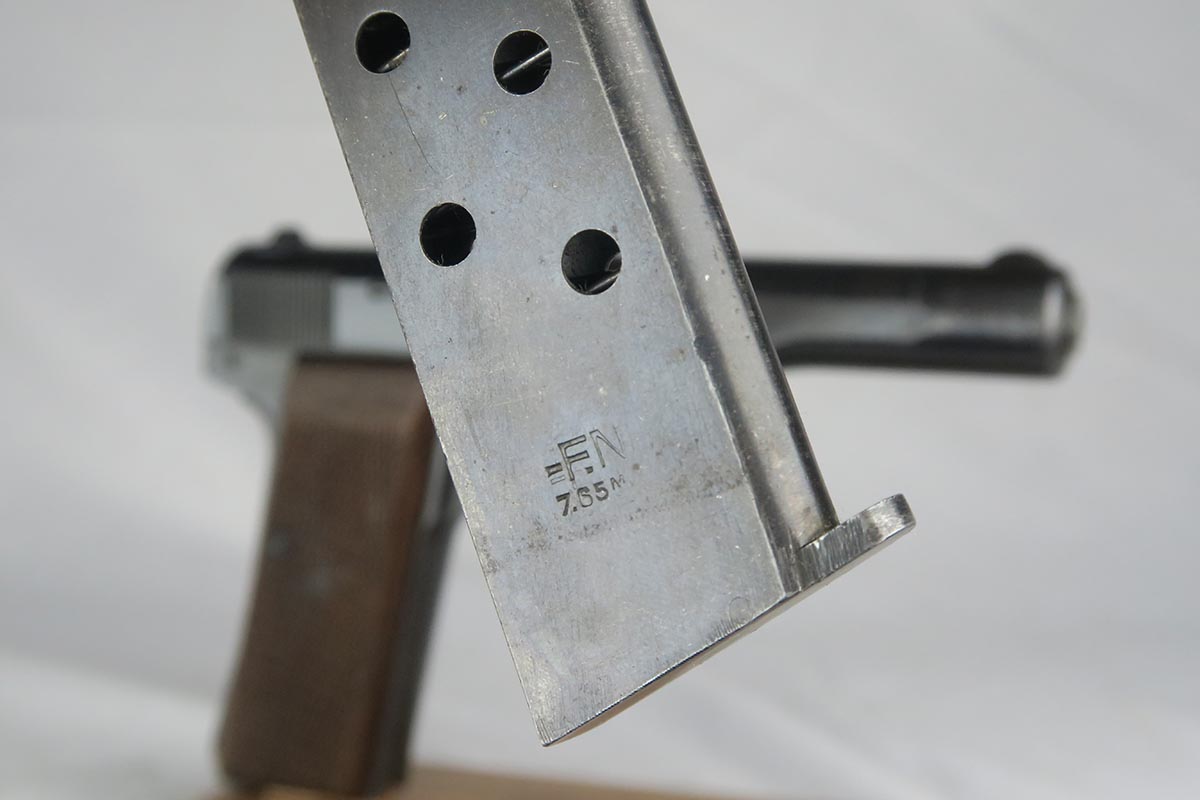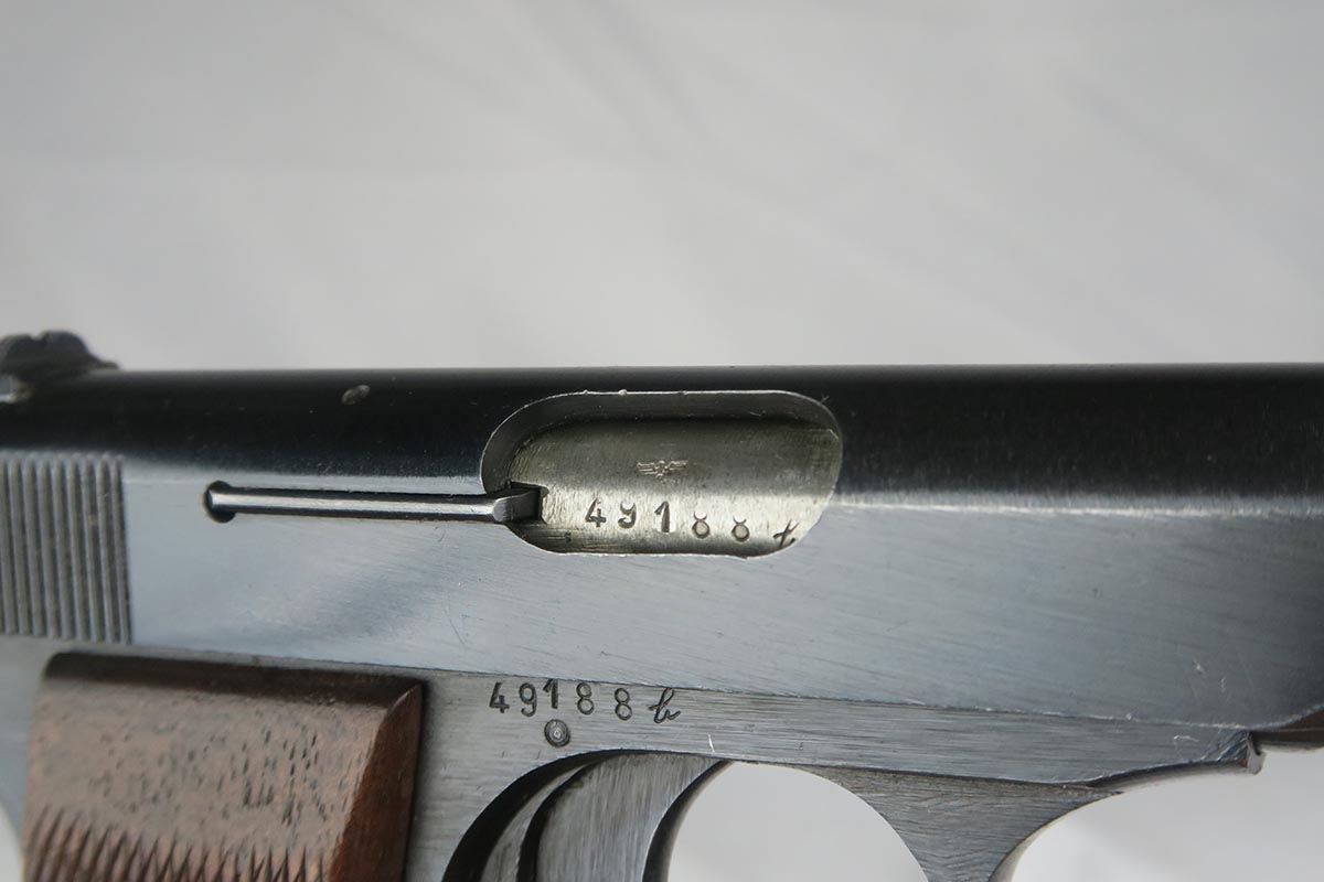 12/27/17 – This is an excellent and original Nazi 1922 Browning with 97-98% military blue remaining. There is the common muzzle wear you see on this model, as well as a minor area of thinning on the left side of the slide. All numbered parts are matching. Nice grips that show natural age. Strong bore with no major flaws.