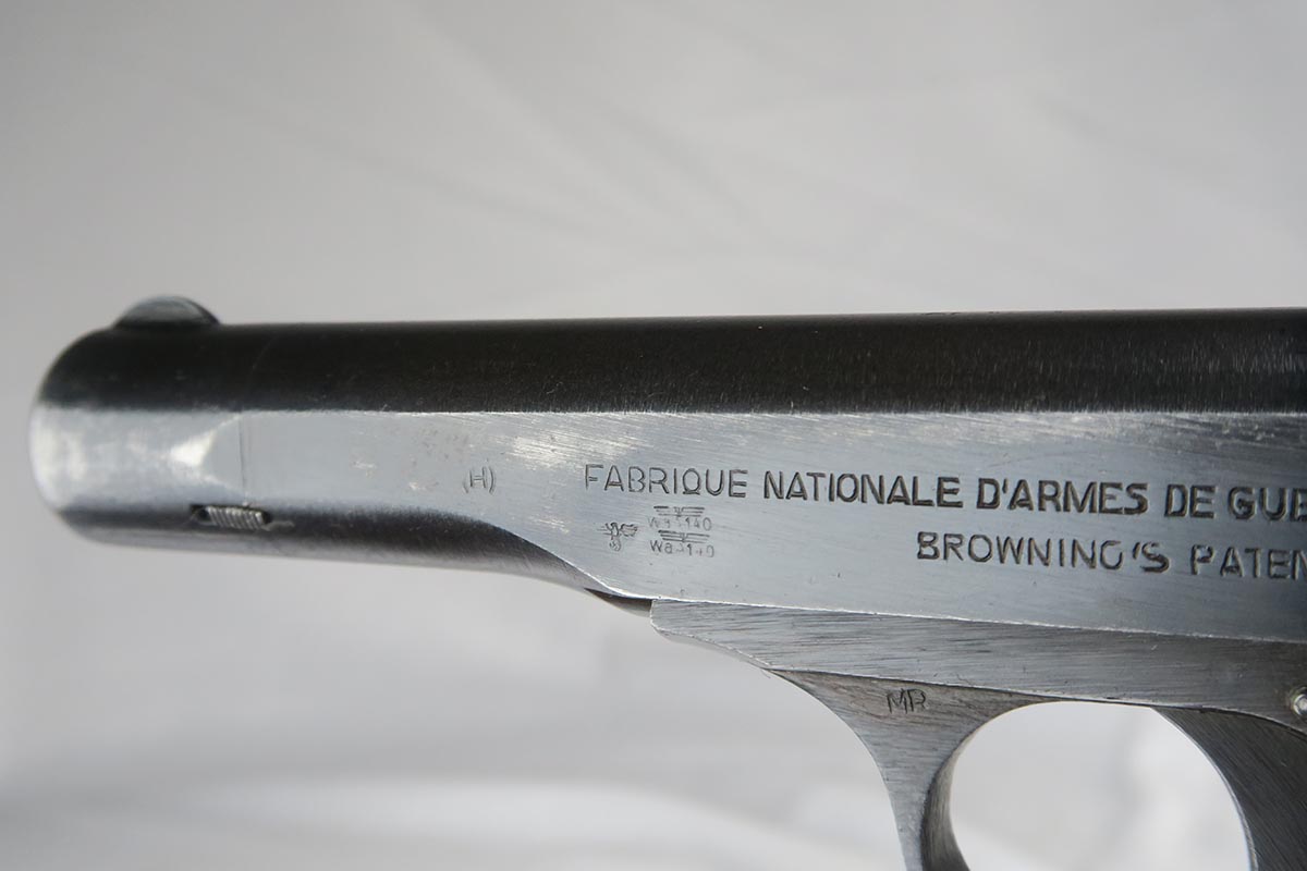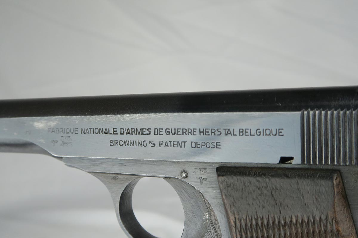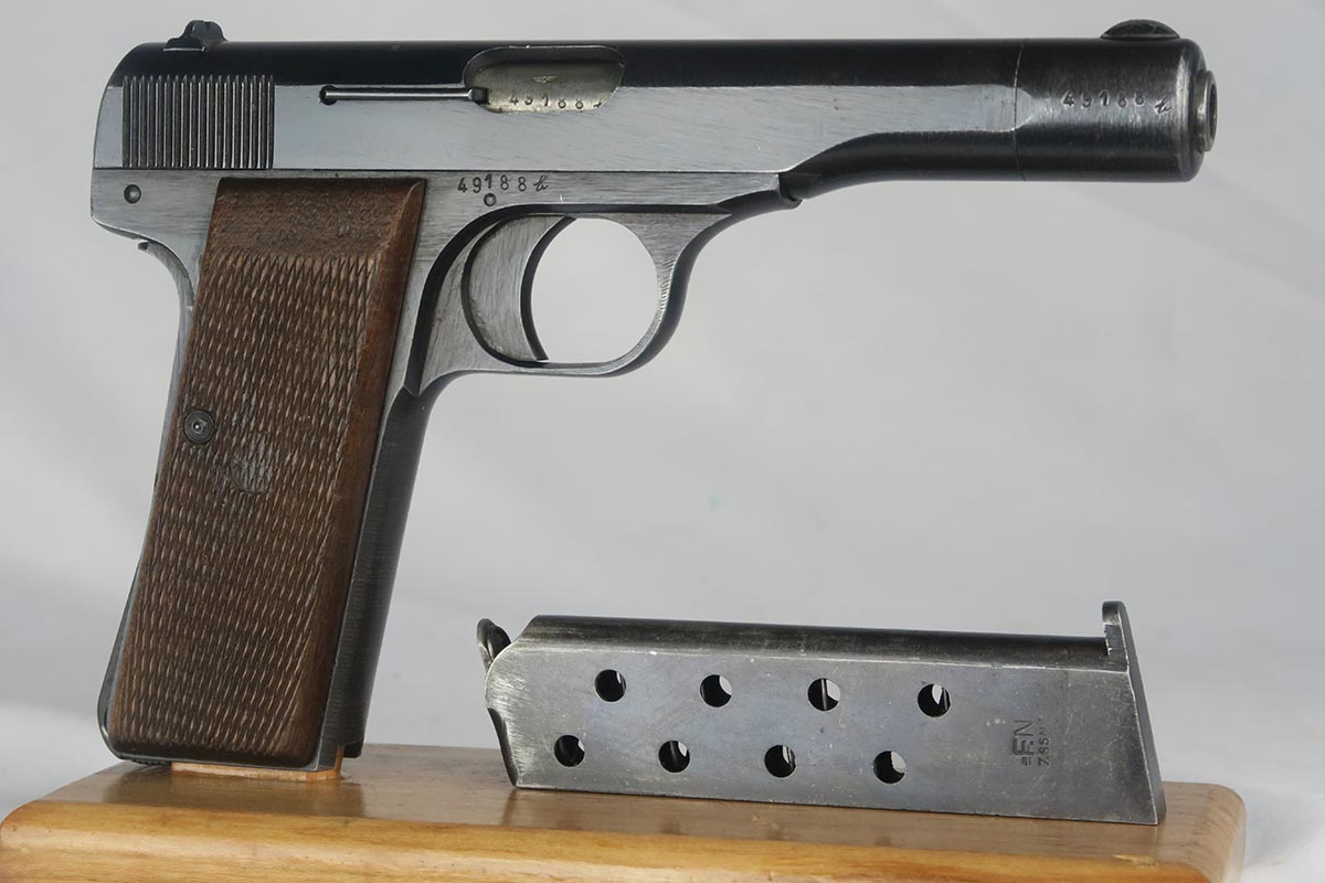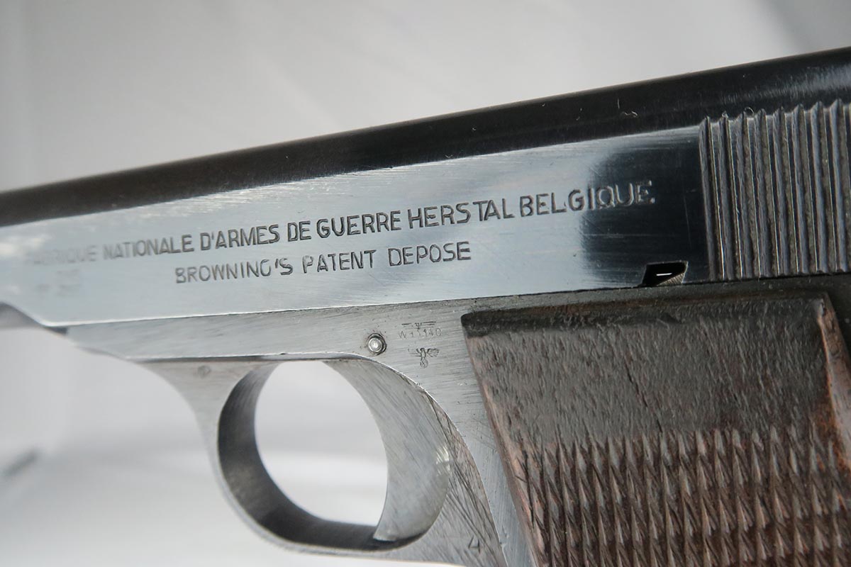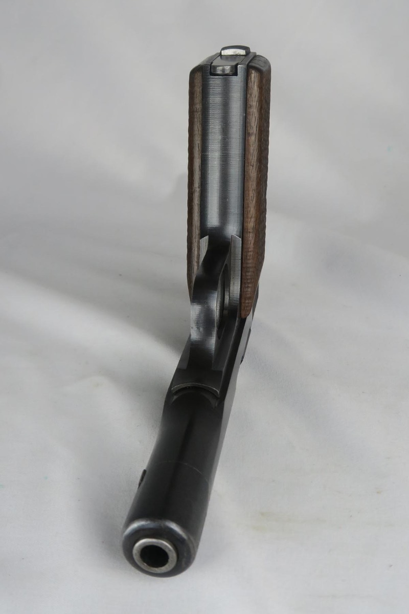 12/27/17 – This is an excellent and original Nazi 1922 Browning with 97-98% military blue remaining. There is the common muzzle wear you see on this model, as well as a minor area of thinning on the left side of the slide. All numbered parts are matching. Nice grips that show natural age. Strong bore with no major flaws.