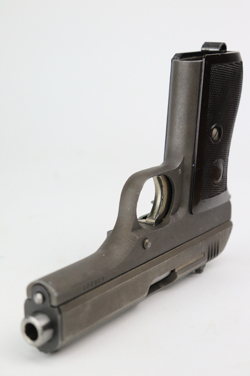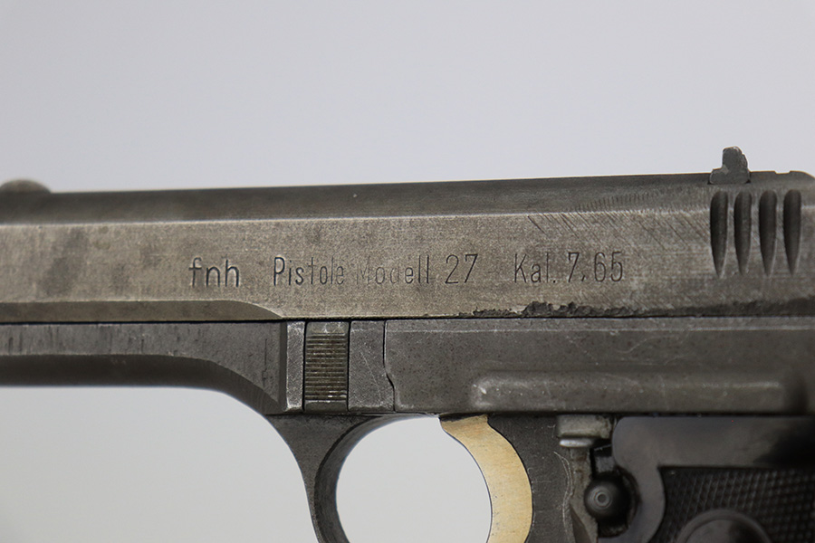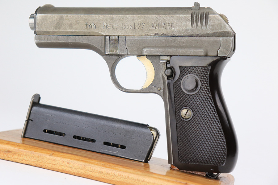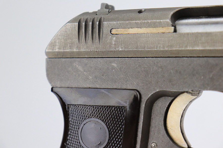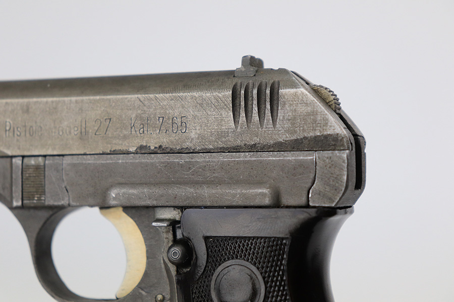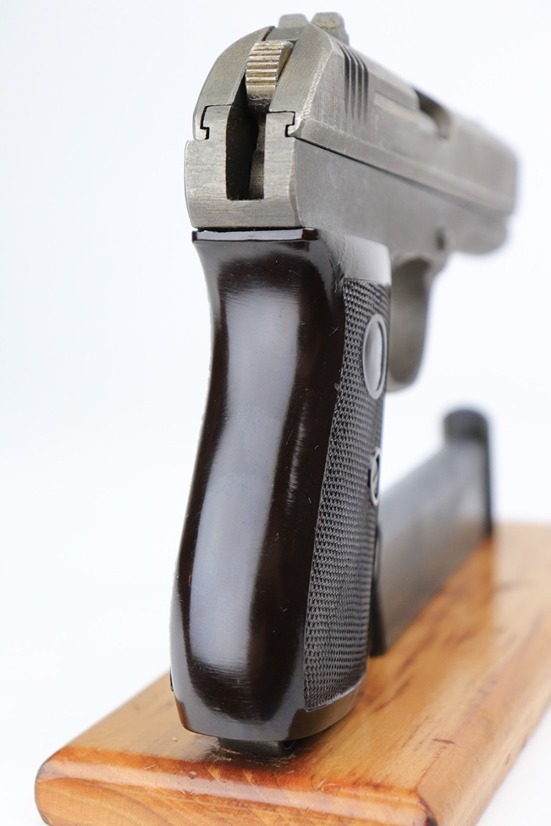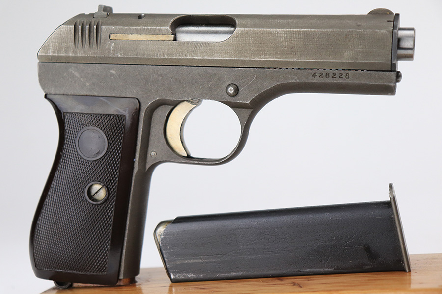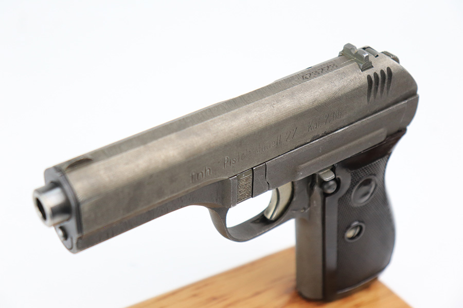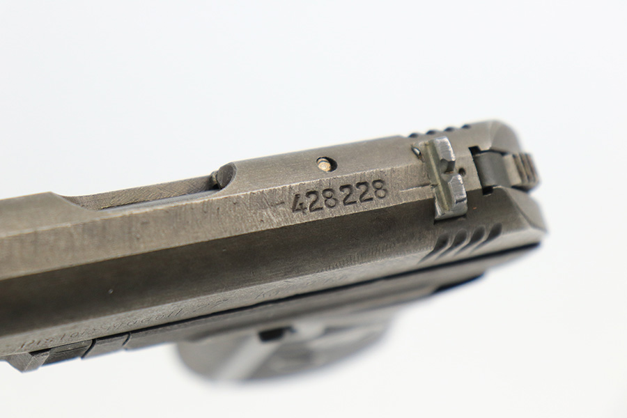 5/12/22 – This is an excellent example of a CZ 27 issued to the Nazi military during WW2. It is all matching and has the proper “Waffen 76” Nazi military acceptance proof on the left side of the frame. This one also has a very nice late-war all-phosphate finish. It is has retained nearly all of this finish with some hints of wear on the high edges and a couple of very light scratches on the right side of the frame. There is a noticeable casting flaw on the left side of the slide where it meets the frame. Comes with a very nice period-correct grip – tiny chip in the bottom left corner. Also comes with an excellent period-correct magazine – the bottom is phosphate, the tube is blued. Mint bore.