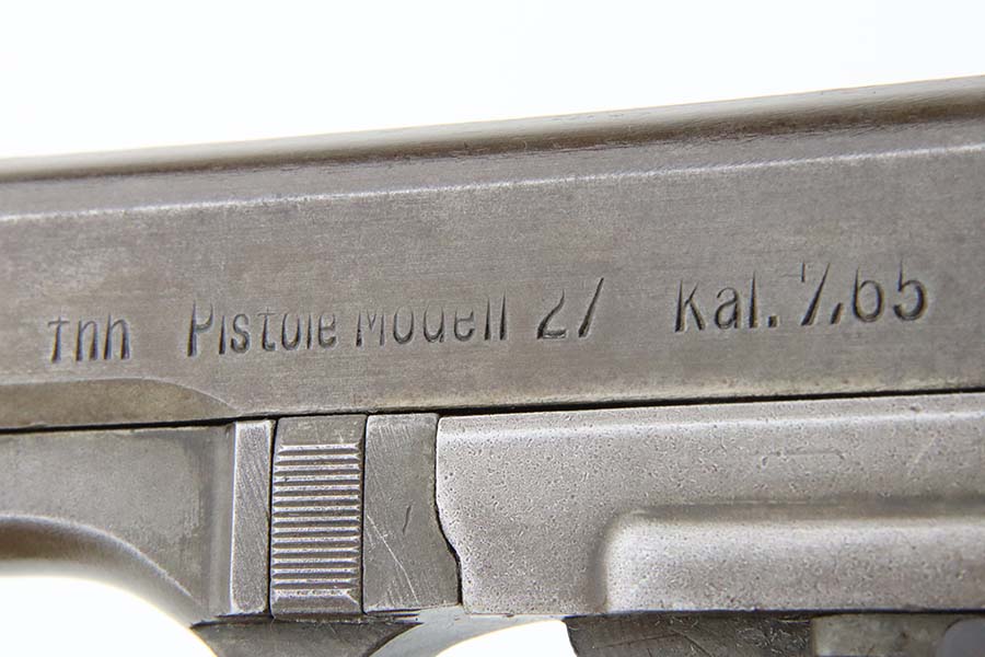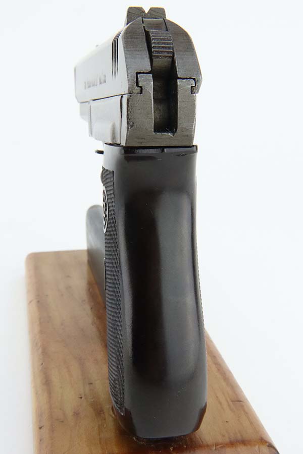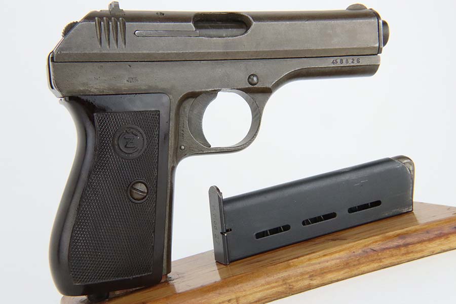 3/14/24 – This is an excellent example of a late-war CZ Model 27 issued to the Nazi military during WW2. It is all matching, has the proper “Waffen 76” military acceptance proof, and has an all-phosphate finish. The finish rates about 97%. While there is very little finish loss, there is spotty brown patina and discoloration throughout (typical for these finishes). Excellent period-correct bakelite grip – no cracks or chips. Comes with one period-correct magazine. Mint bore.