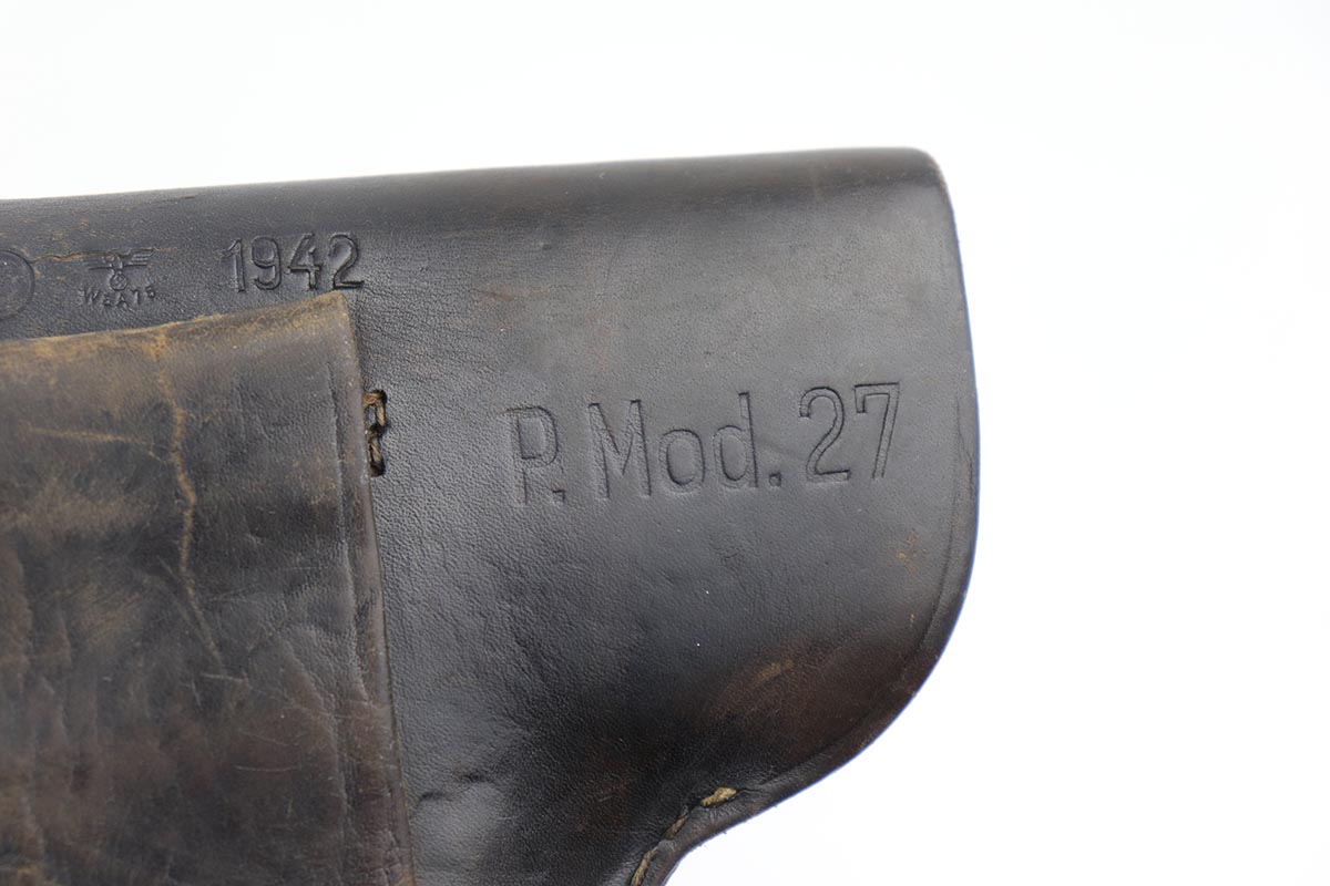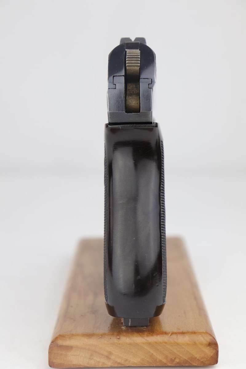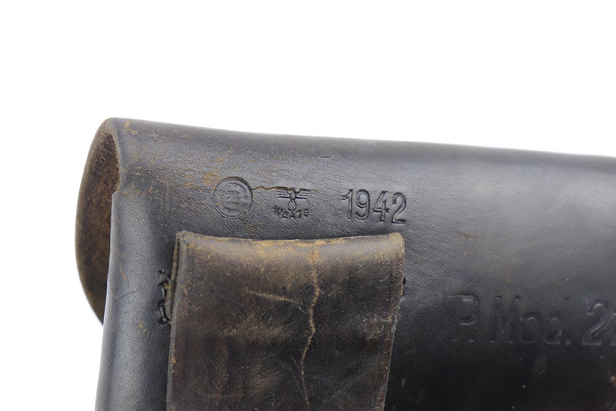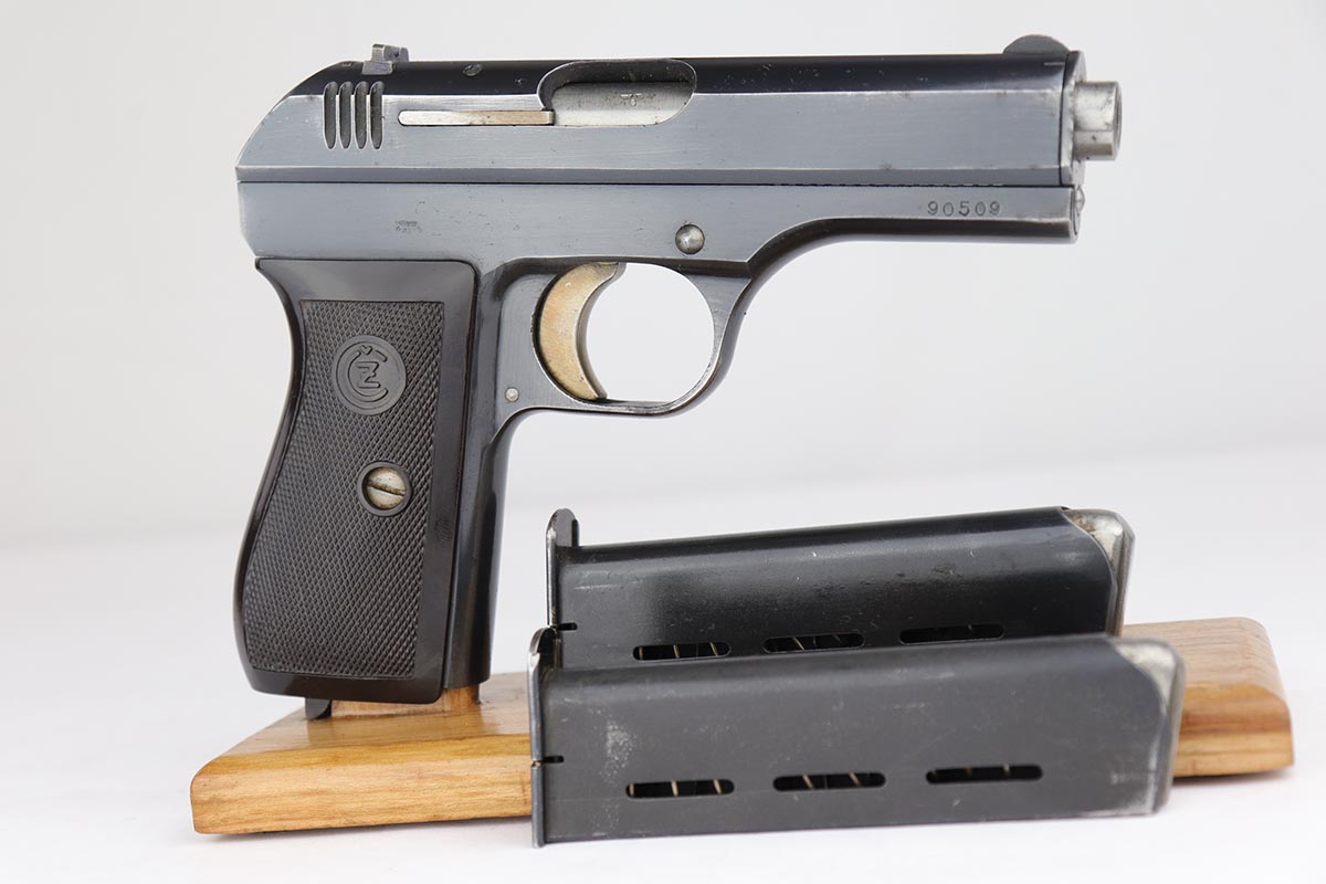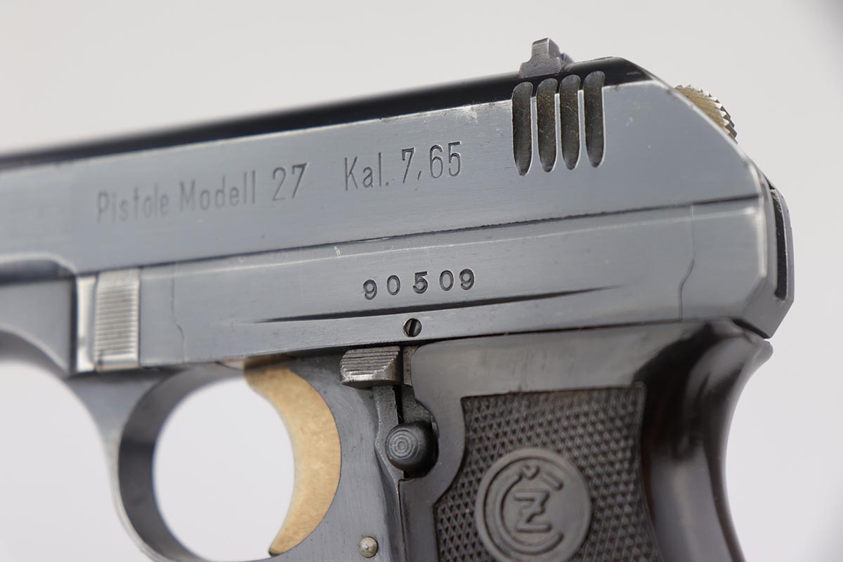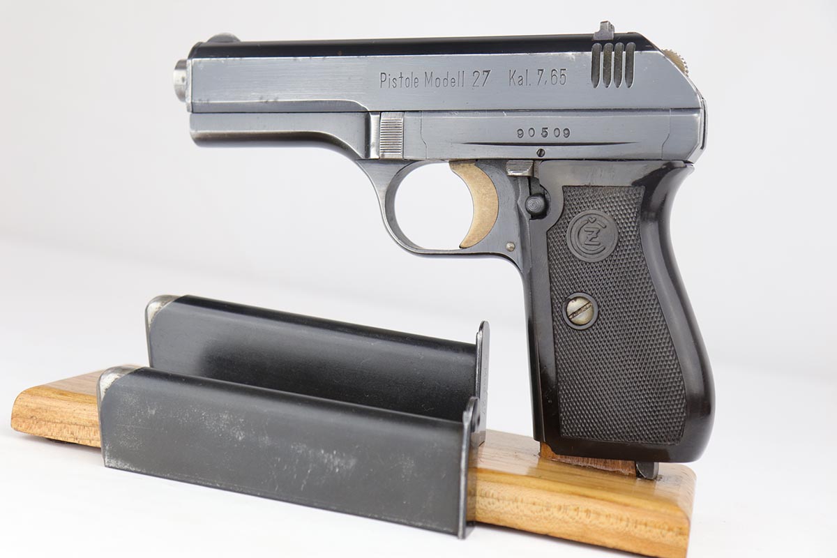 4/24/19 – This is a terrific and complete CZ 27 rig that was issued the Nazi Army in the early 1940s. It has excellent high-polish bluing, rating at 97-98% with minor thinning of the trigger guard, and minor muzzle wear. Very nice grip, with only a tiny chip on the corner of the left side. Minty bore. Two correct magazines. Rig is completed by a very nice, original holster. It has sharp CZ proof, waffenamt and 1942 date.