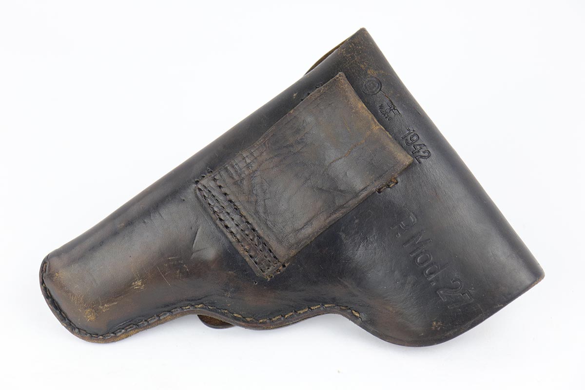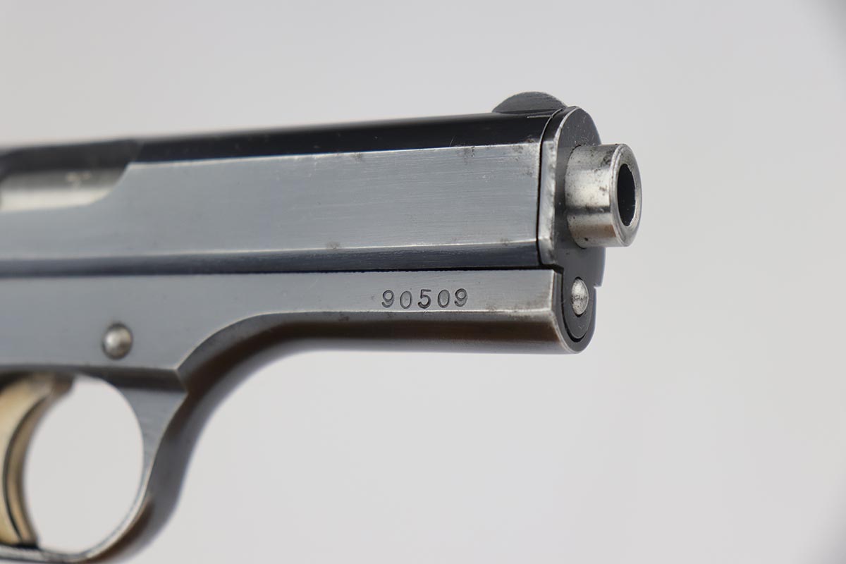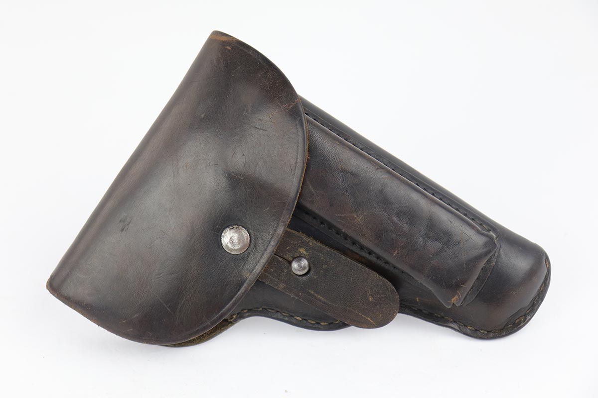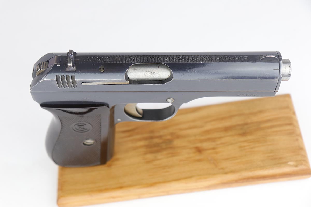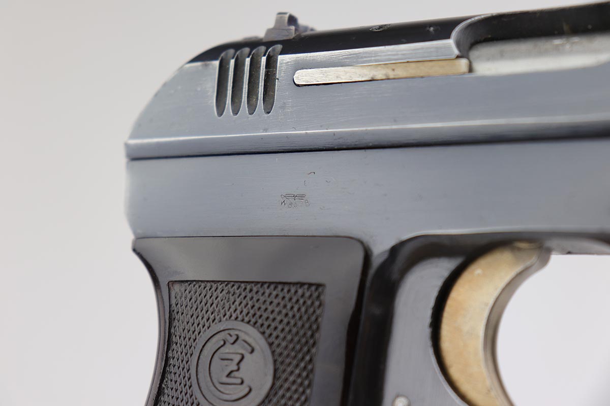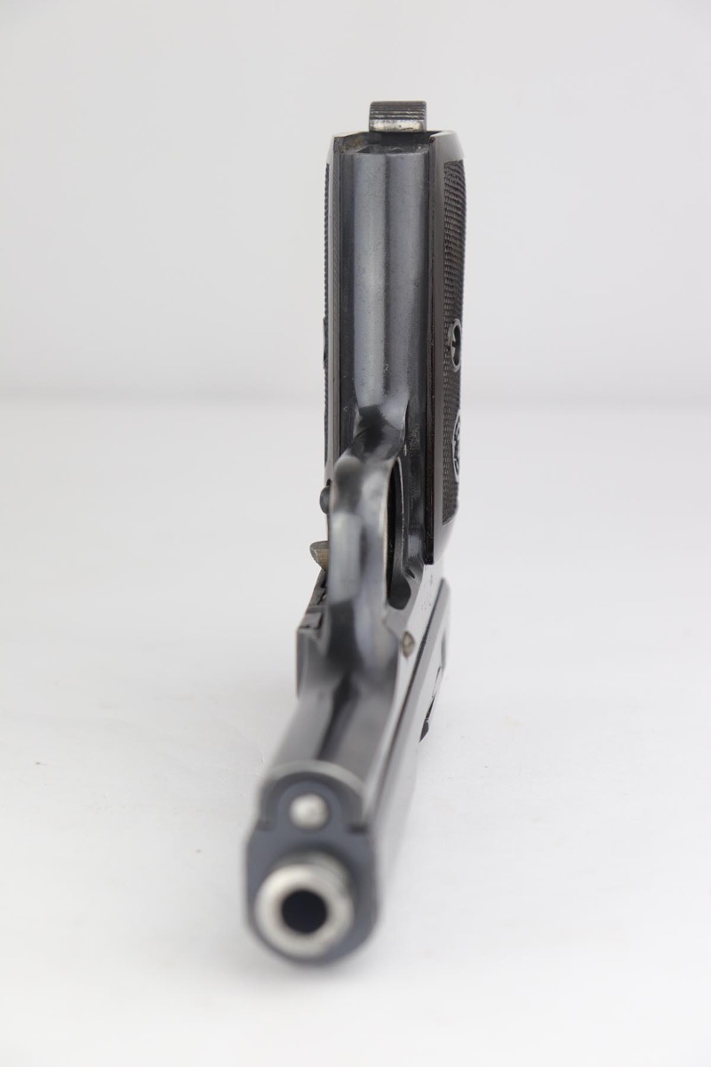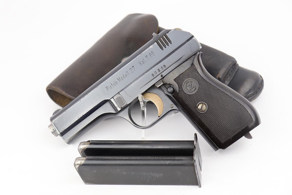 4/24/19 – This is a terrific and complete CZ 27 rig that was issued the Nazi Army in the early 1940s. It has excellent high-polish bluing, rating at 97-98% with minor thinning of the trigger guard, and minor muzzle wear. Very nice grip, with only a tiny chip on the corner of the left side. Minty bore. Two correct magazines. Rig is completed by a very nice, original holster. It has sharp CZ proof, waffenamt and 1942 date.